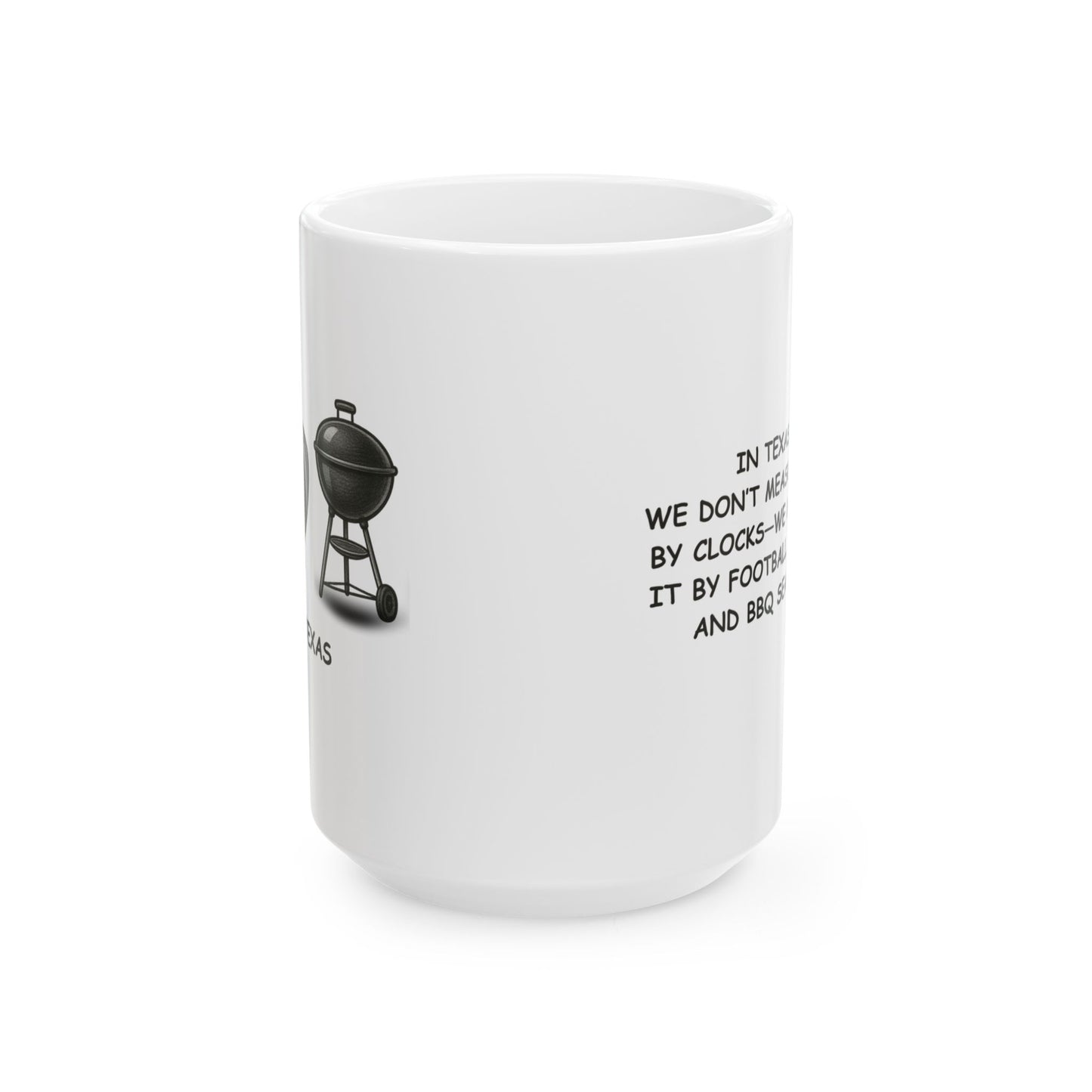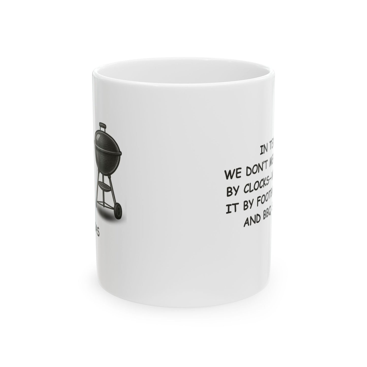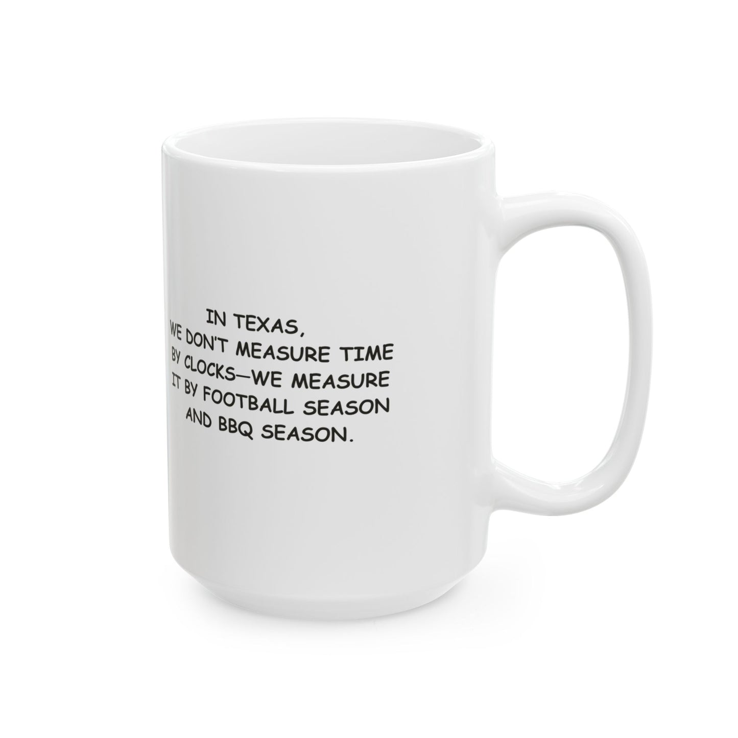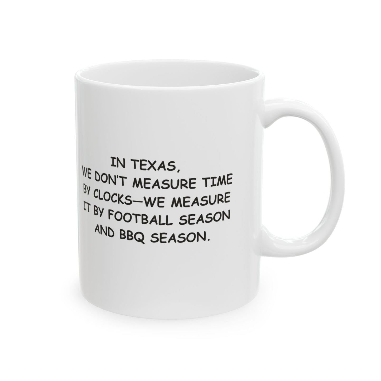 "In Texas, we don’t measure time by clocks—we measure it by football season and BBQ season." Ceramic Mug - 12672