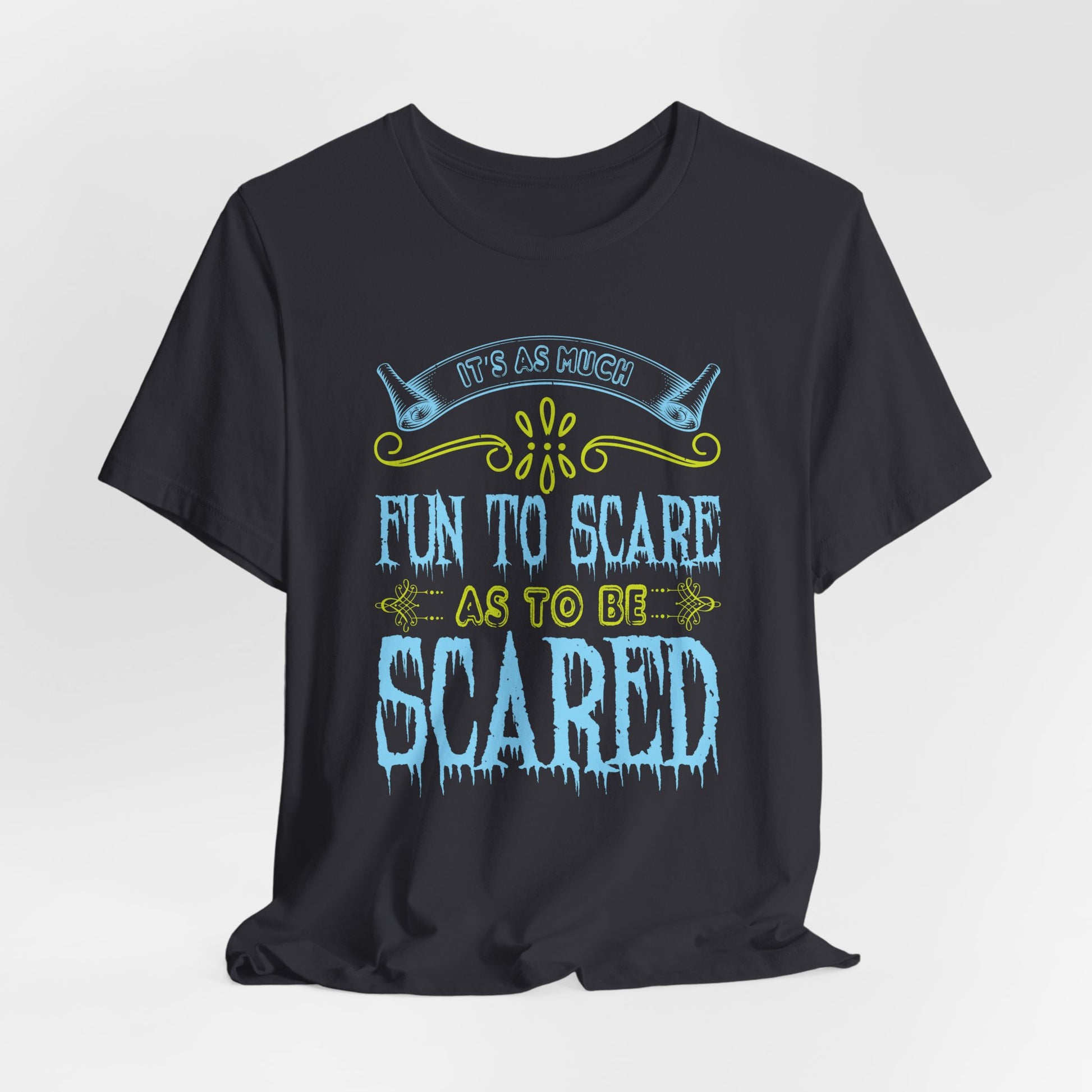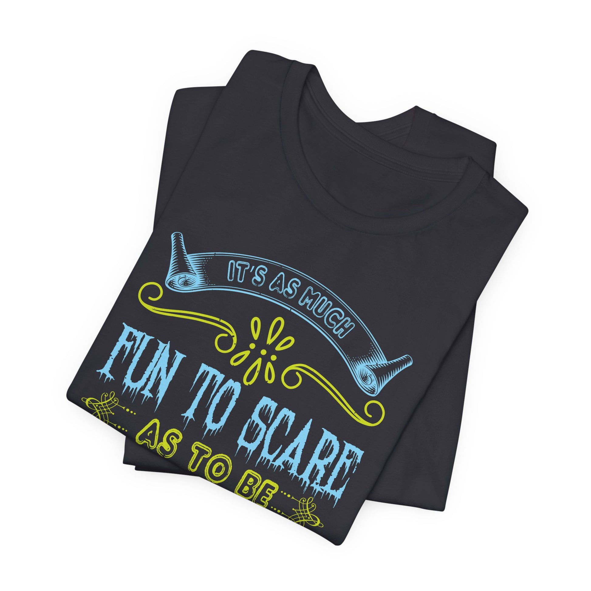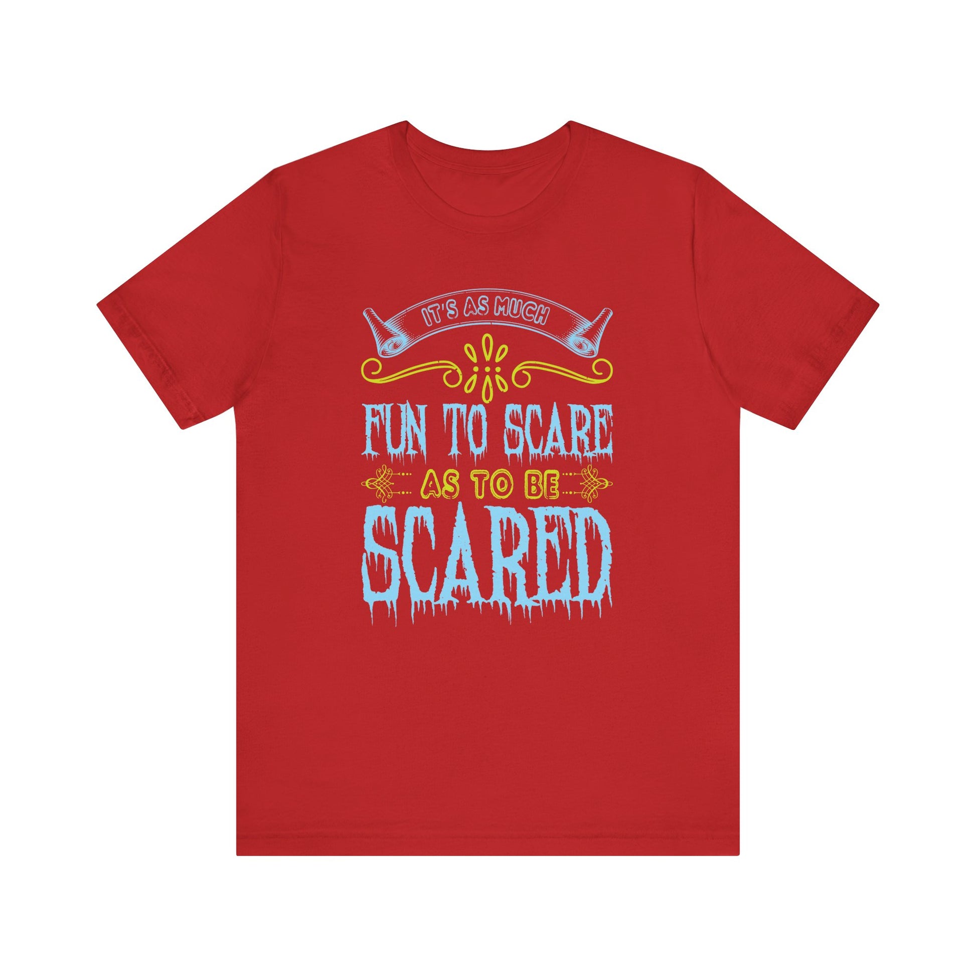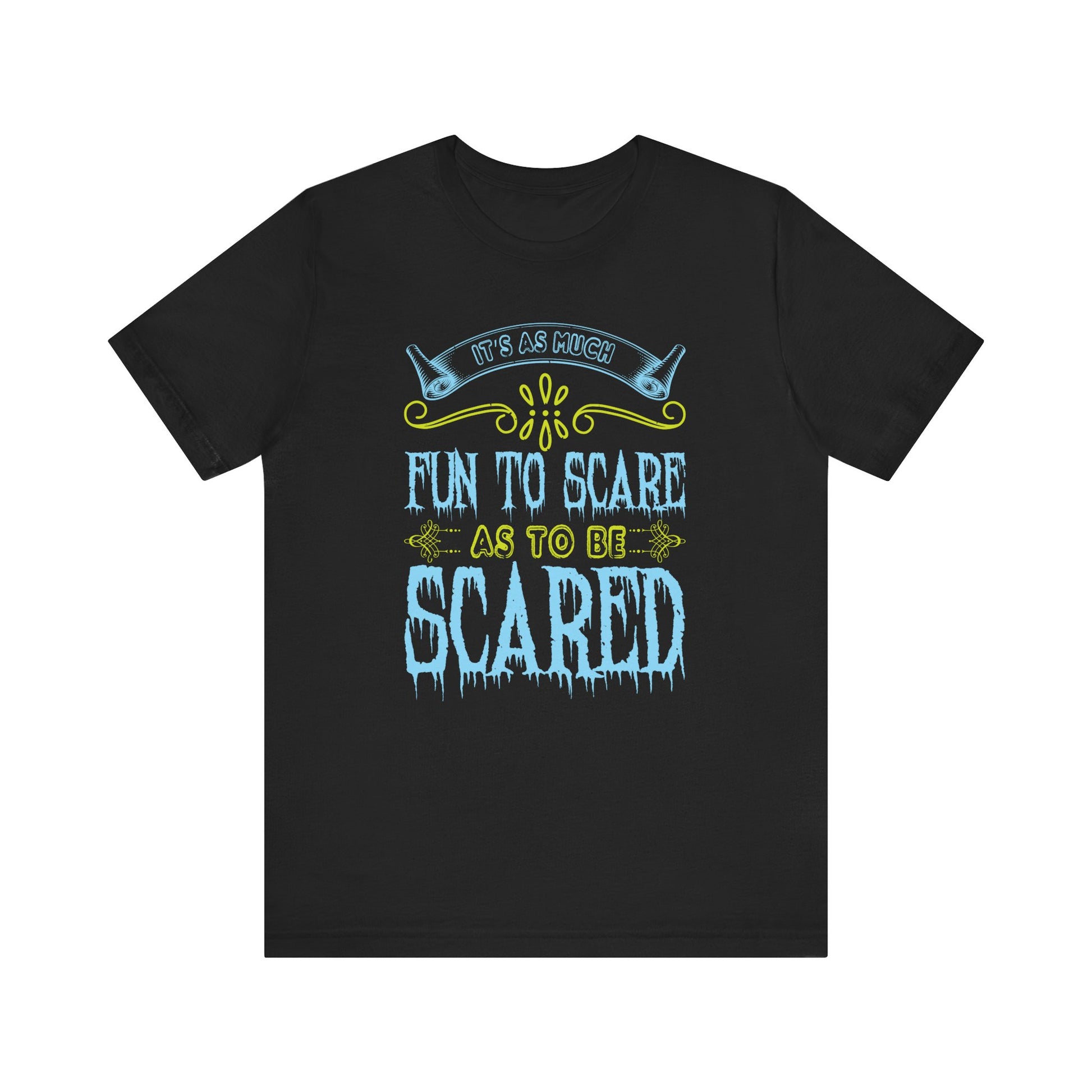 Dive into the thrills of Halloween with the "It Is As Much Fun to Scare as to Be Scared" Unisex Jersey Short Sleeve Tee! Perfect for those who love the excitement of both giving and receiving a fright, this tee is your go-to for a spooky good time.
