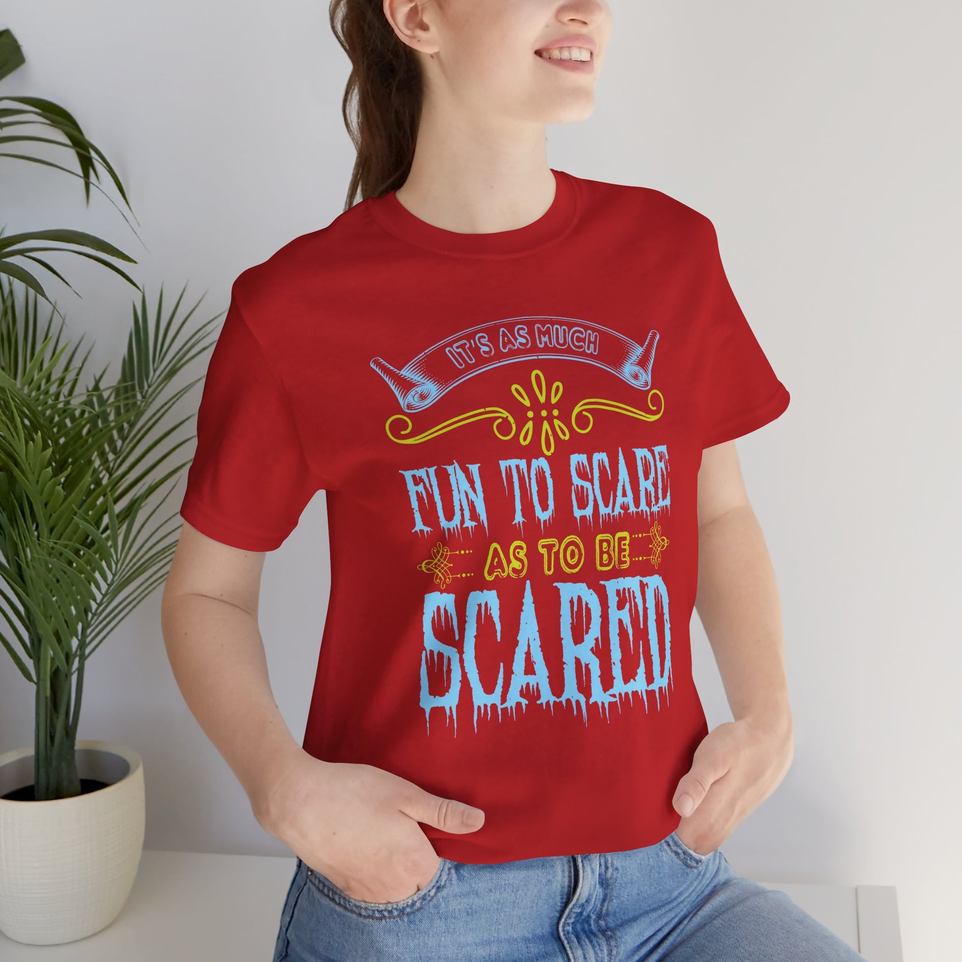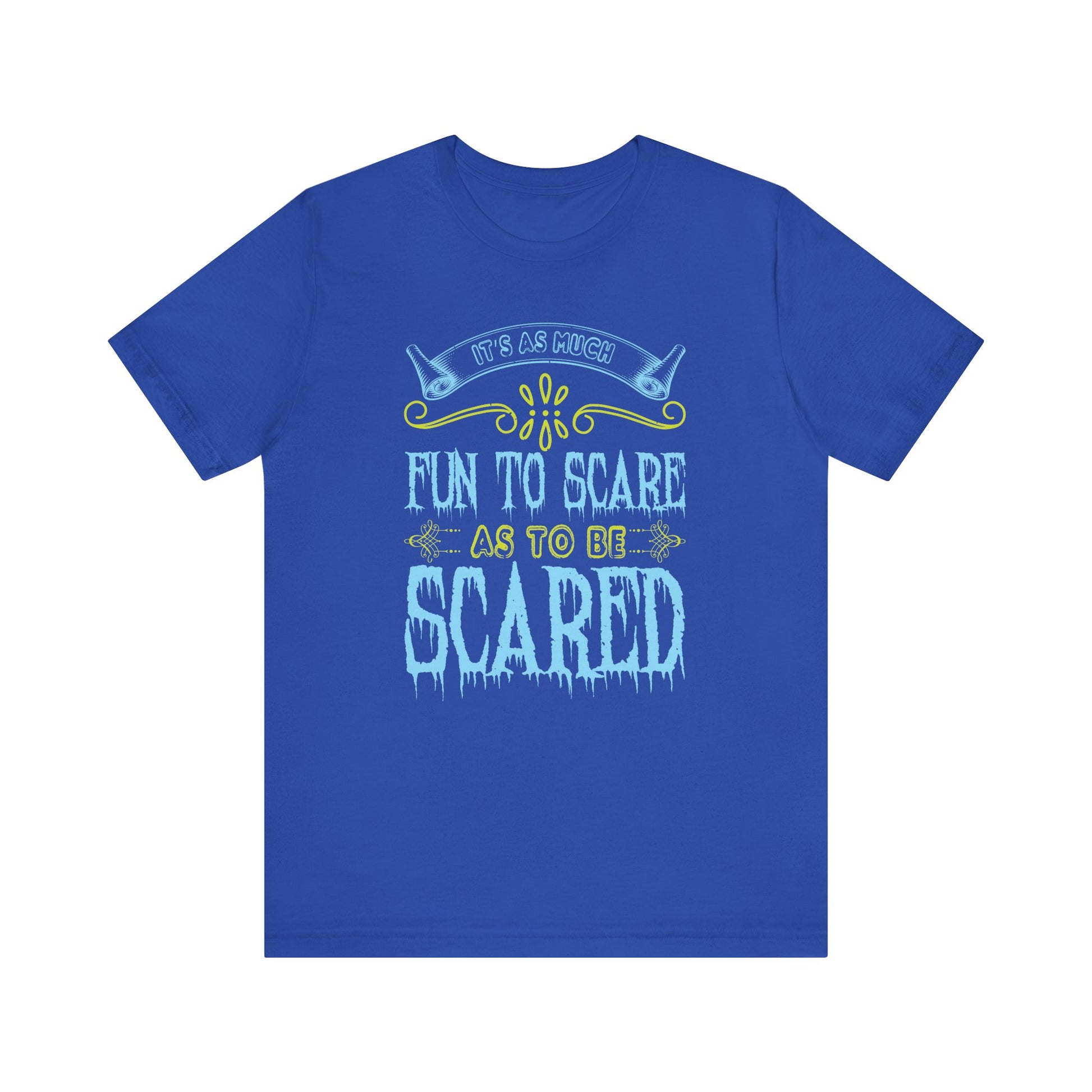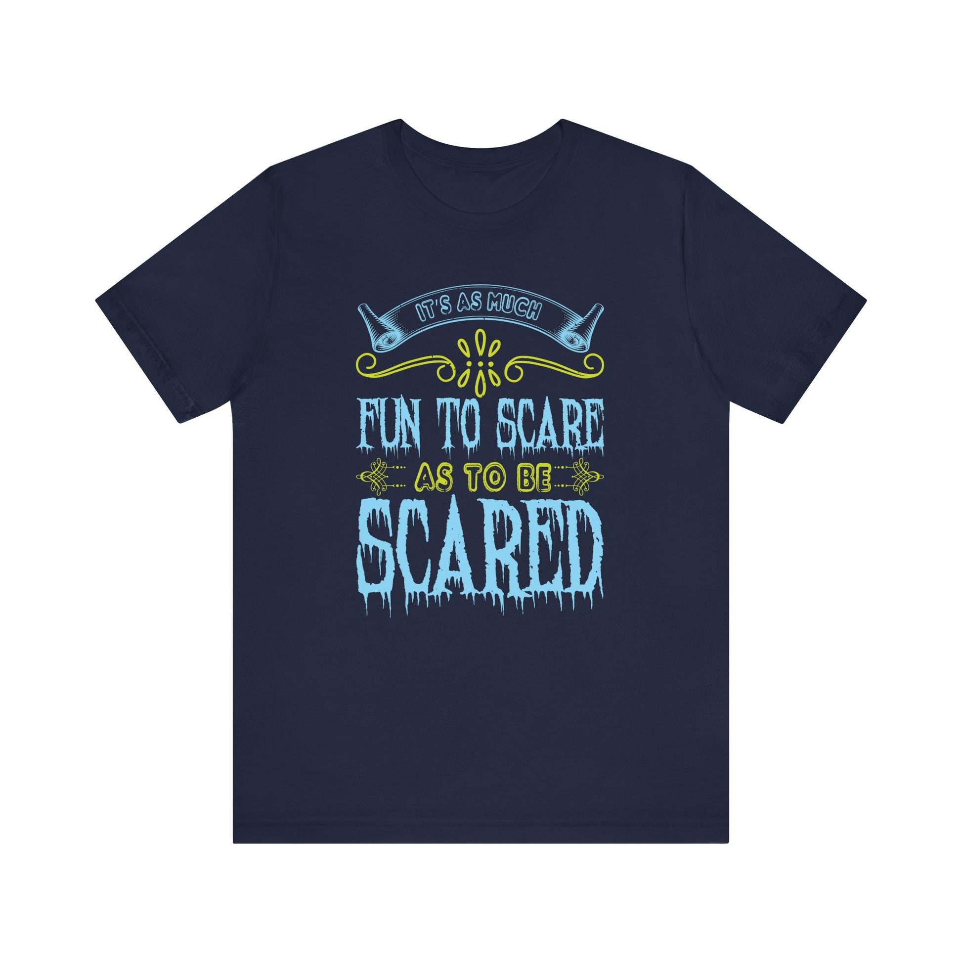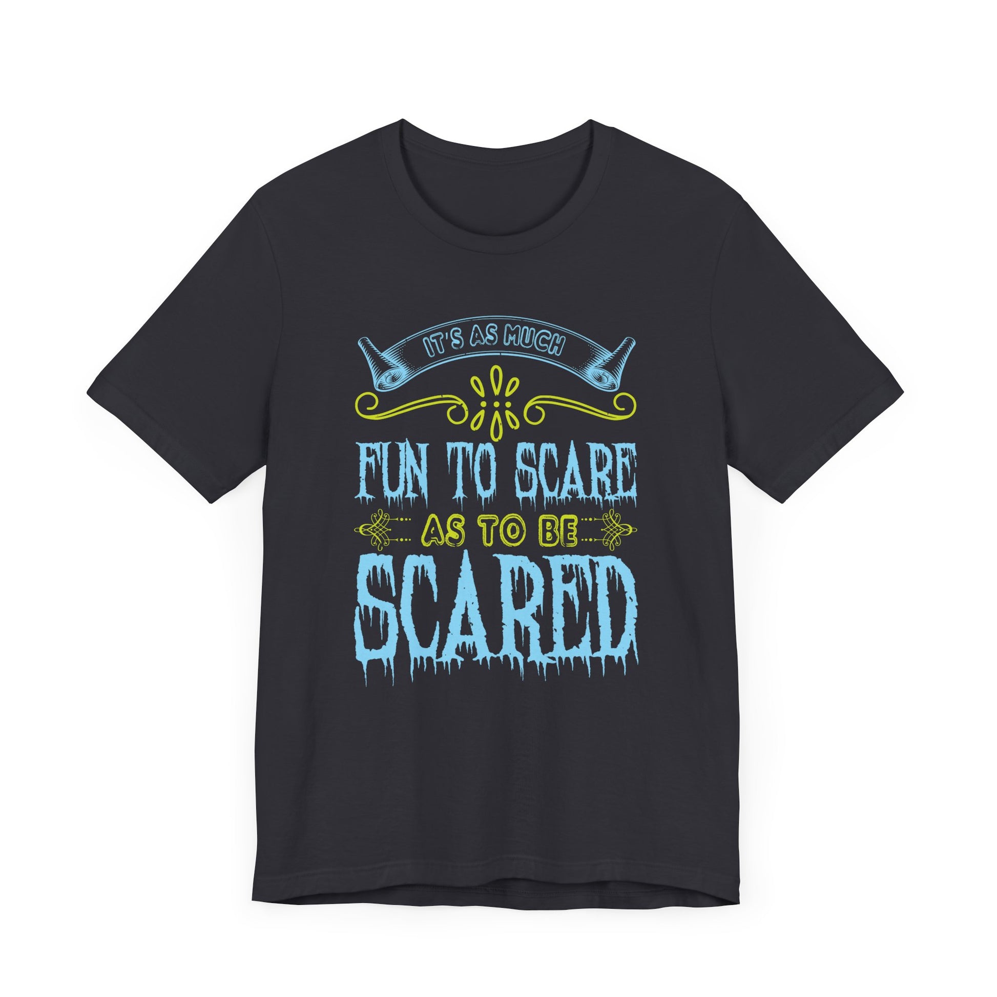 Dive into the thrills of Halloween with the "It Is As Much Fun to Scare as to Be Scared" Unisex Jersey Short Sleeve Tee! Perfect for those who love the excitement of both giving and receiving a fright, this tee is your go-to for a spooky good time.