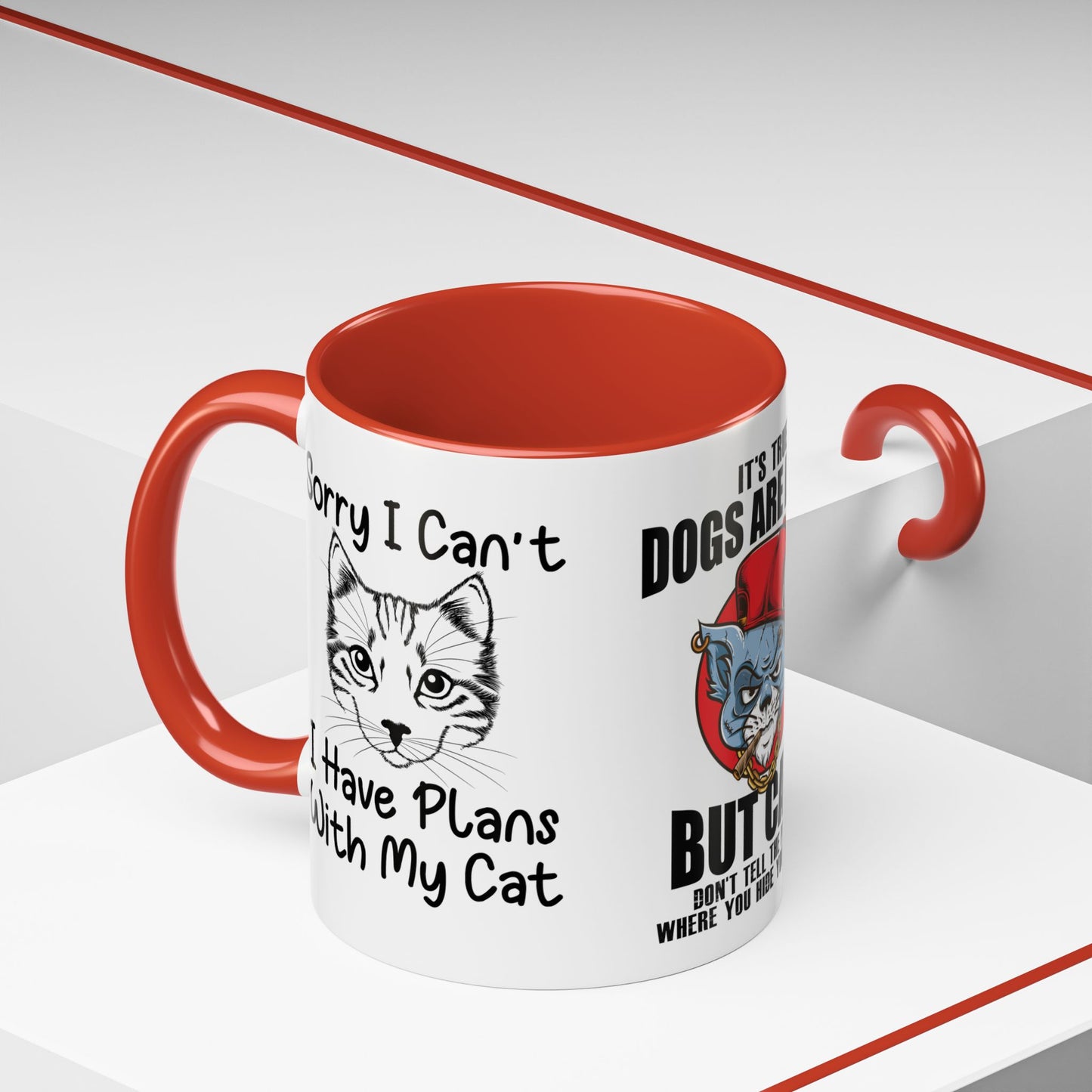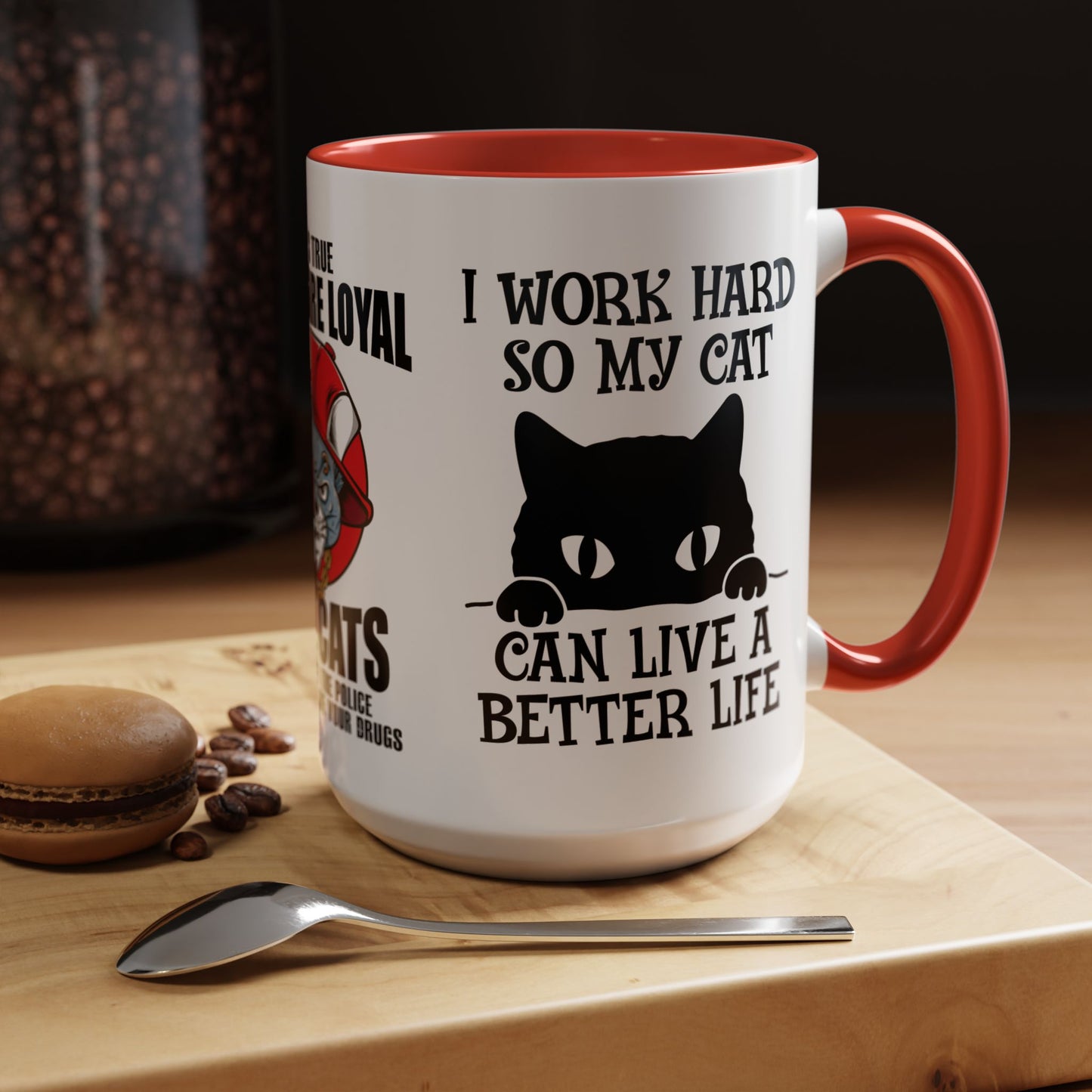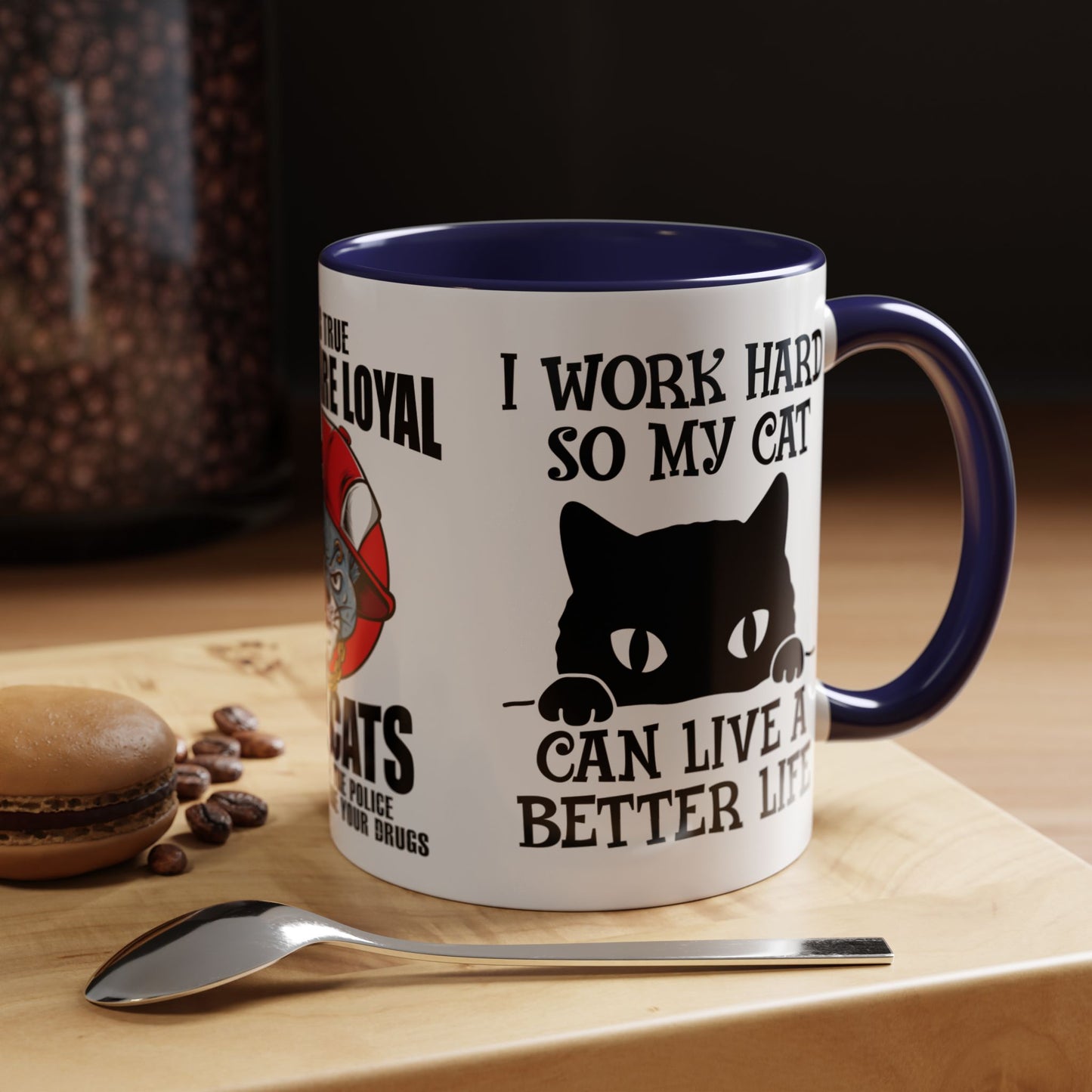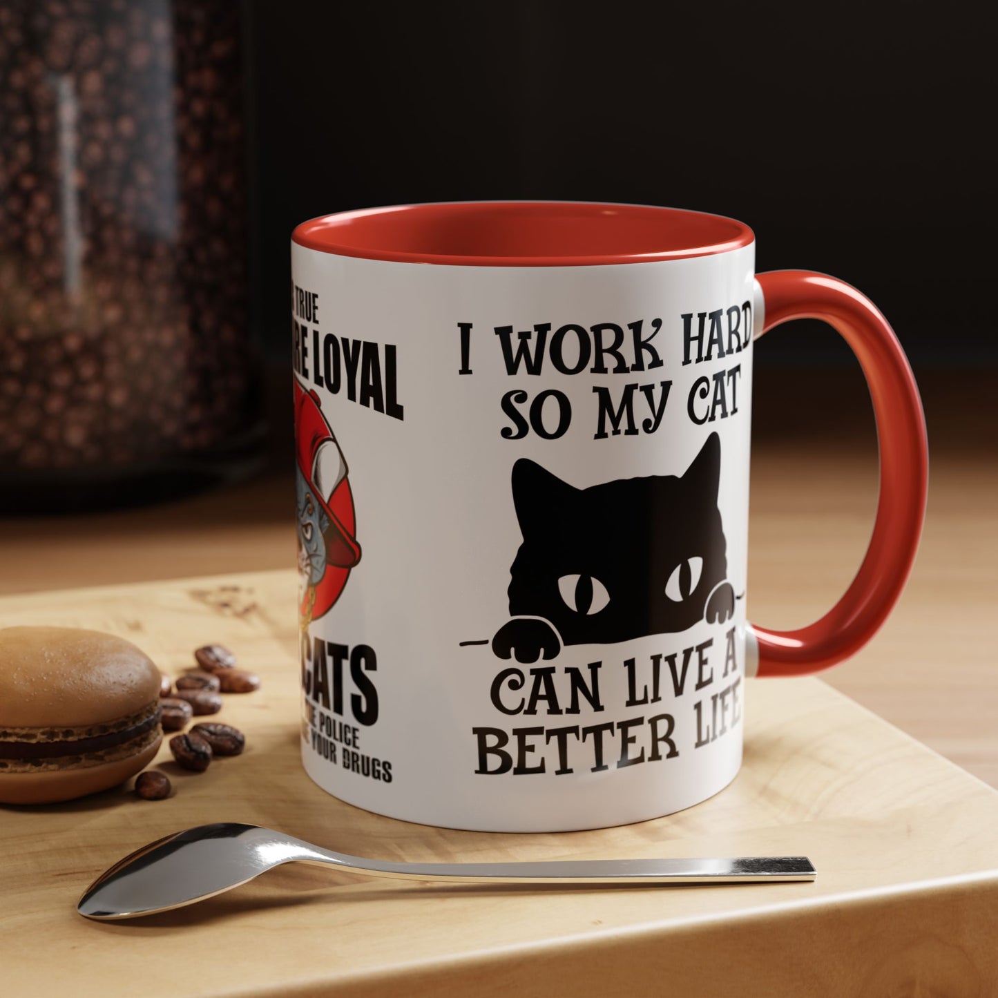 Enjoy your coffee or tea with a dash of humor and cat-inspired fun with the It's True Dogs Are Loyal, But Cats Don't Tell The Police Where You Hide Your Things Accent Coffee Mug. Order yours today and bring some feline flair to your daily routine!