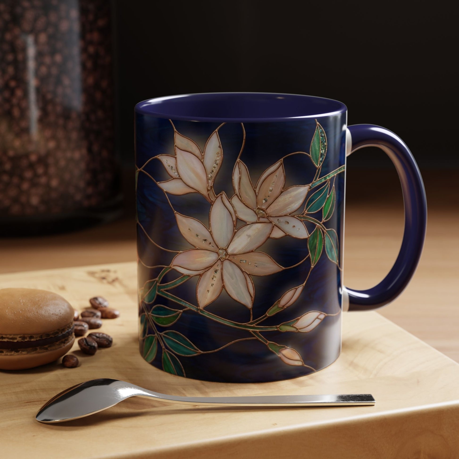 Bring a quiet, artful pause to everyday moments with this glossy ceramic mug. Deep navy backgrounds meet soft, stained-glass–style blossoms and verdant leaves, wrapping the cup in a gentle, hand-painted feel. The colored interior and handle add a striking contrast that lifts your morning ritual. It’s the kind of mug you reach for when you want a slow sip, a thoughtful breath, and a small piece of beauty at your table or desk.