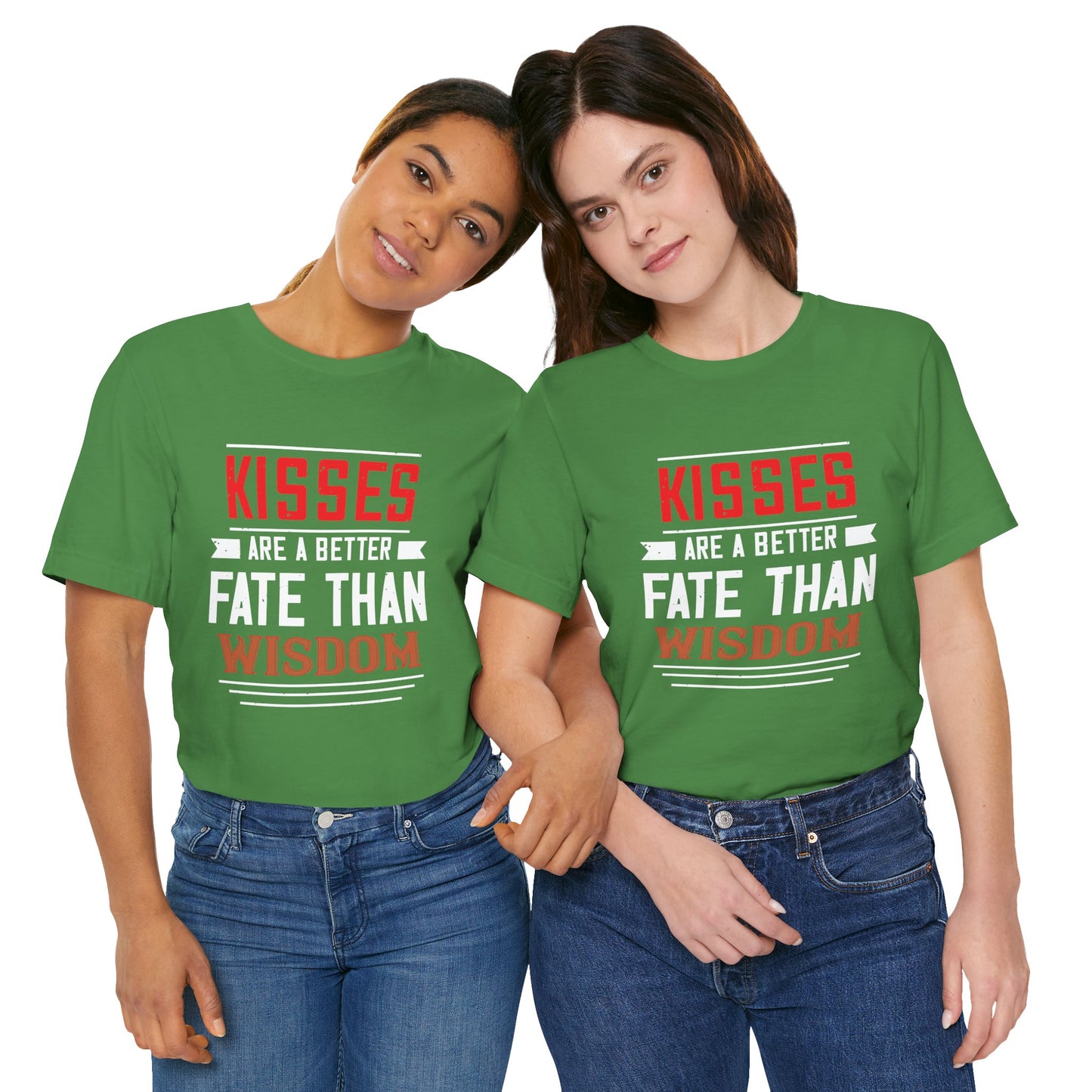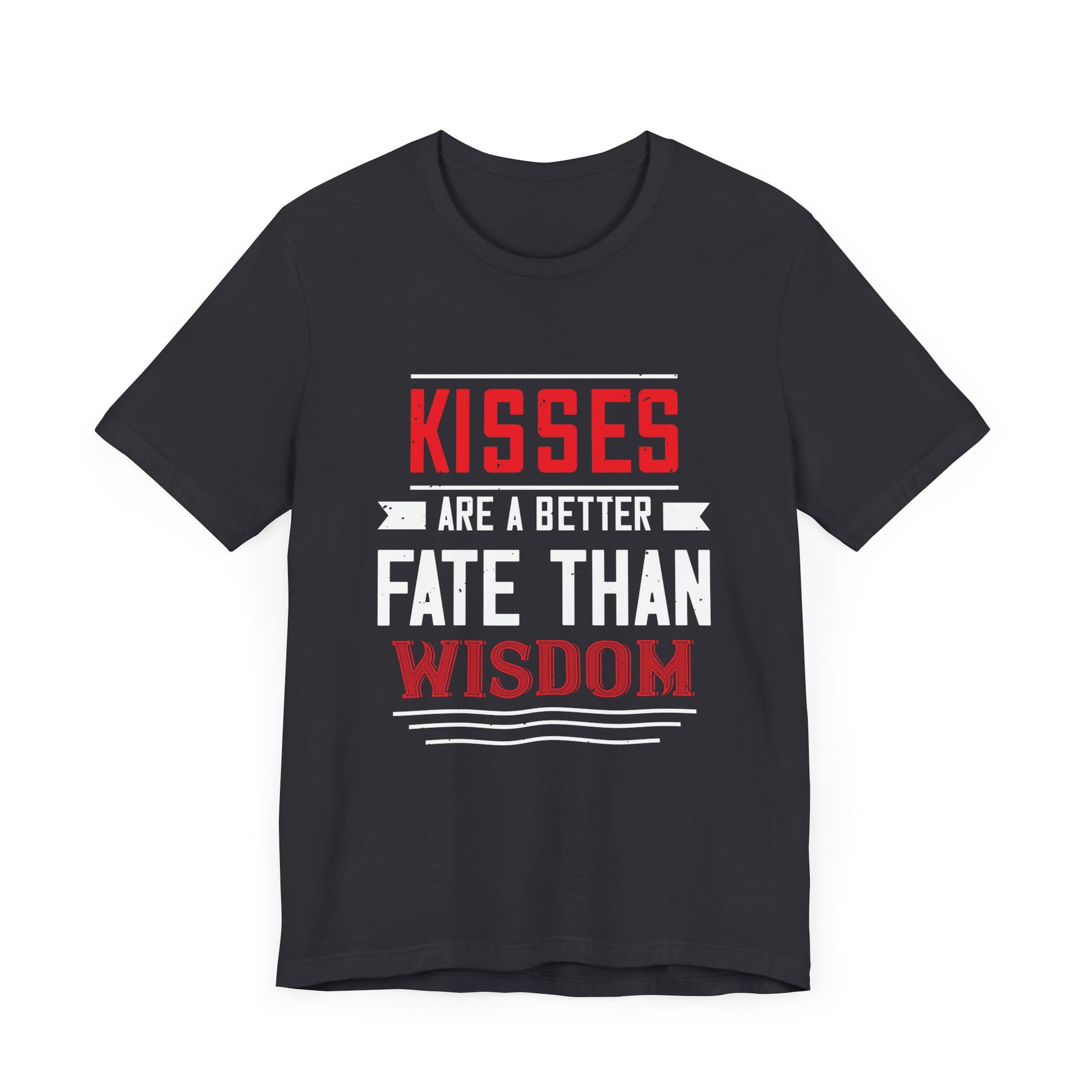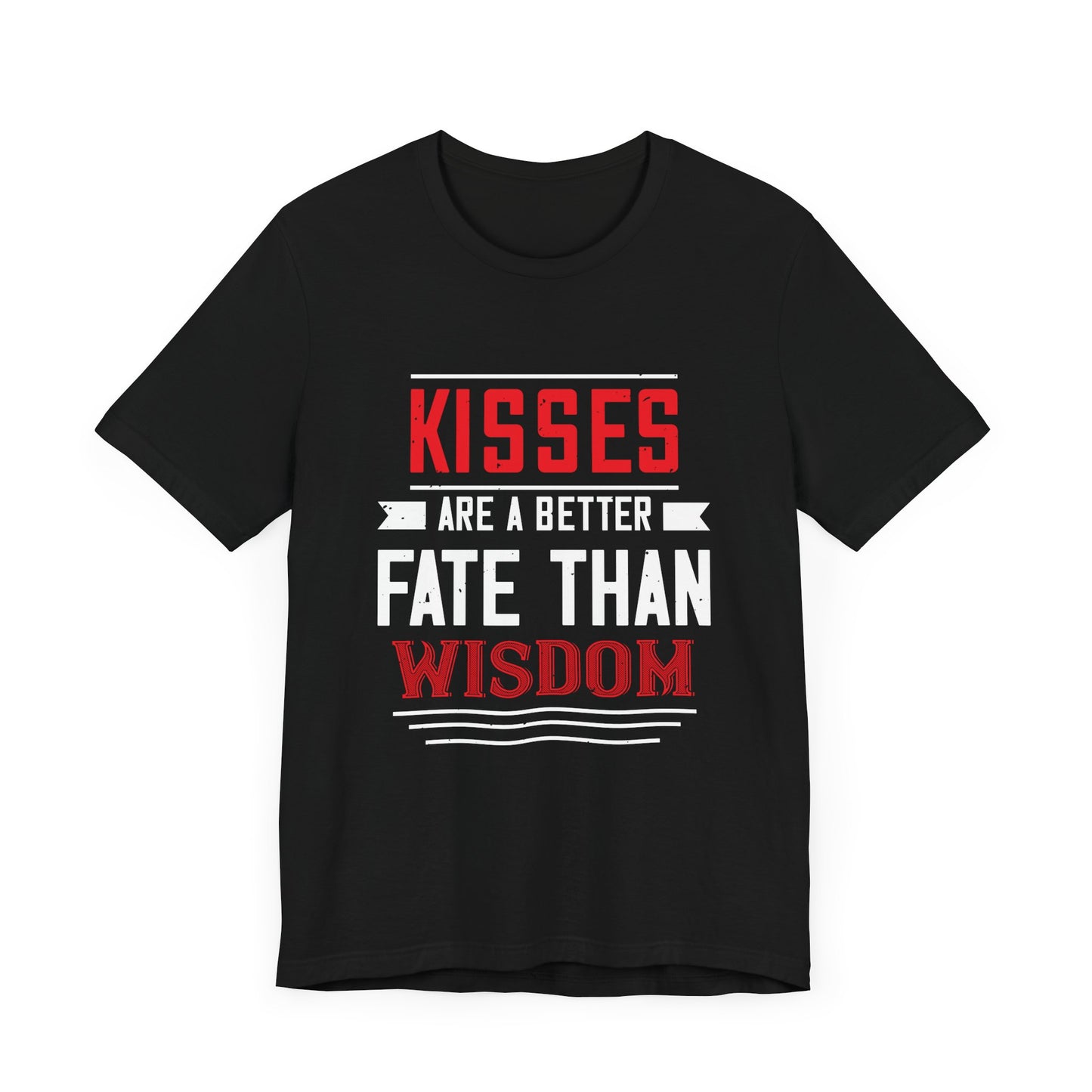Make a statement with this whimsical tee that values love and kisses above all else. The "Kisses Are a Better Fate Than Wisdom" shirt is a delightful way to show your appreciation for the simple, heartfelt pleasures in life.