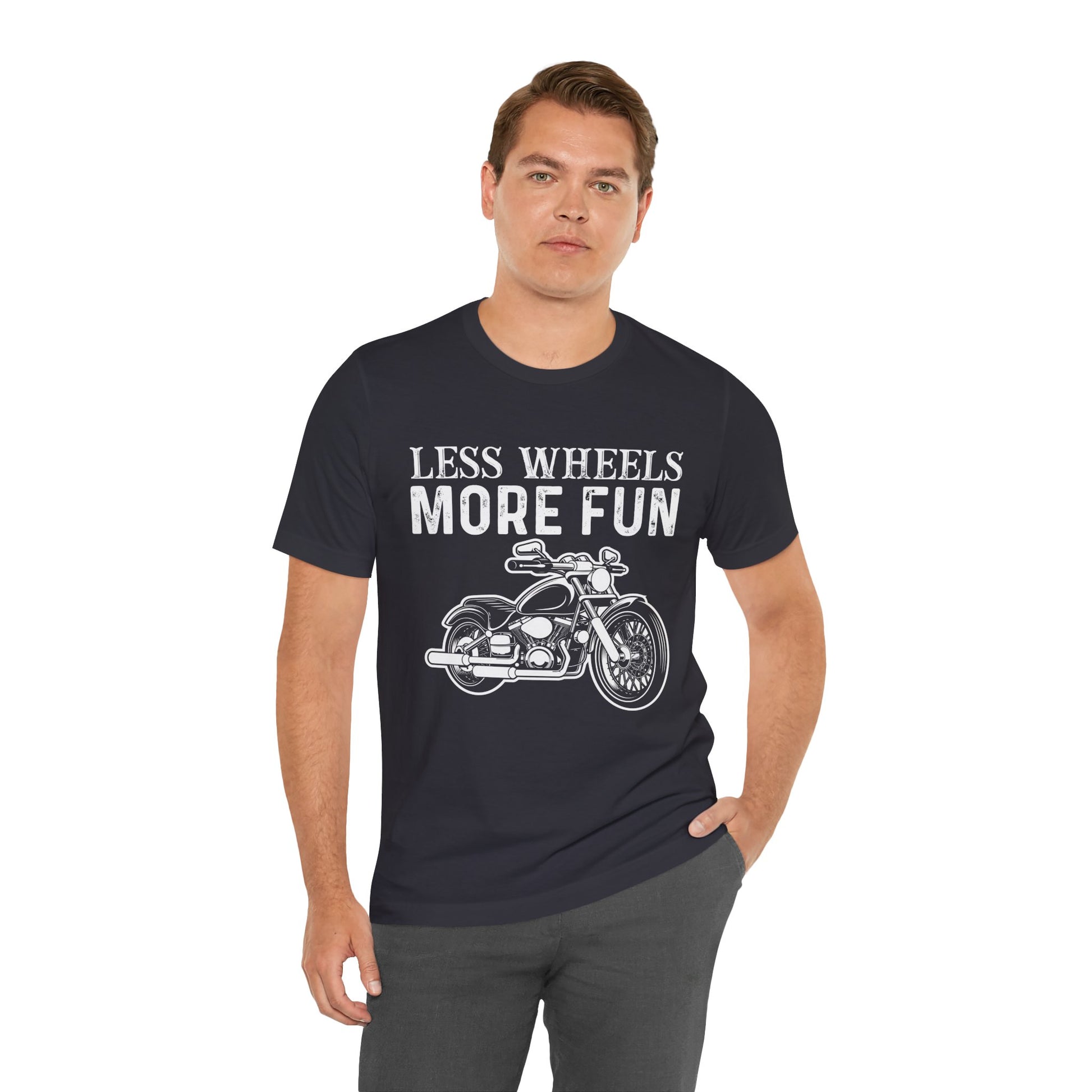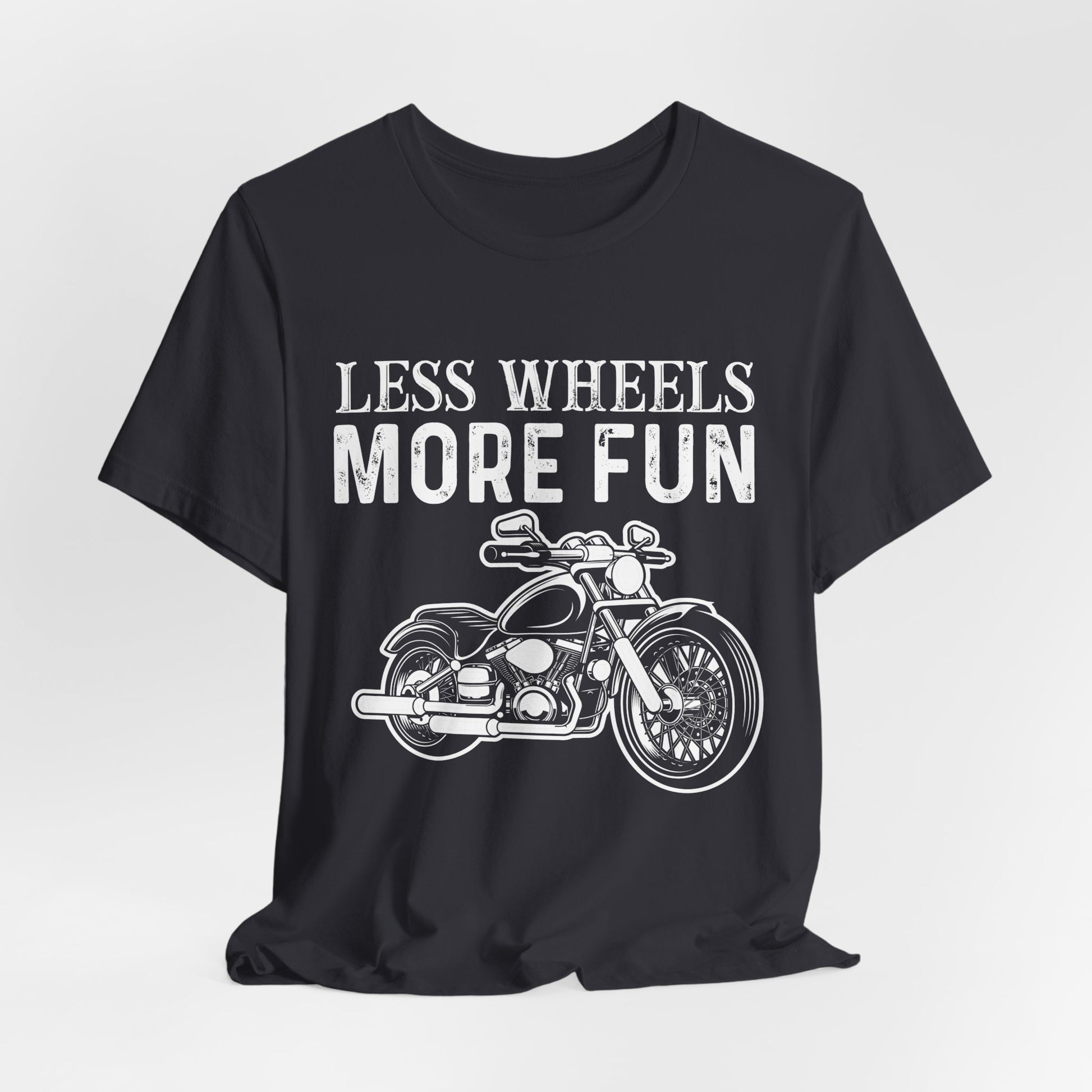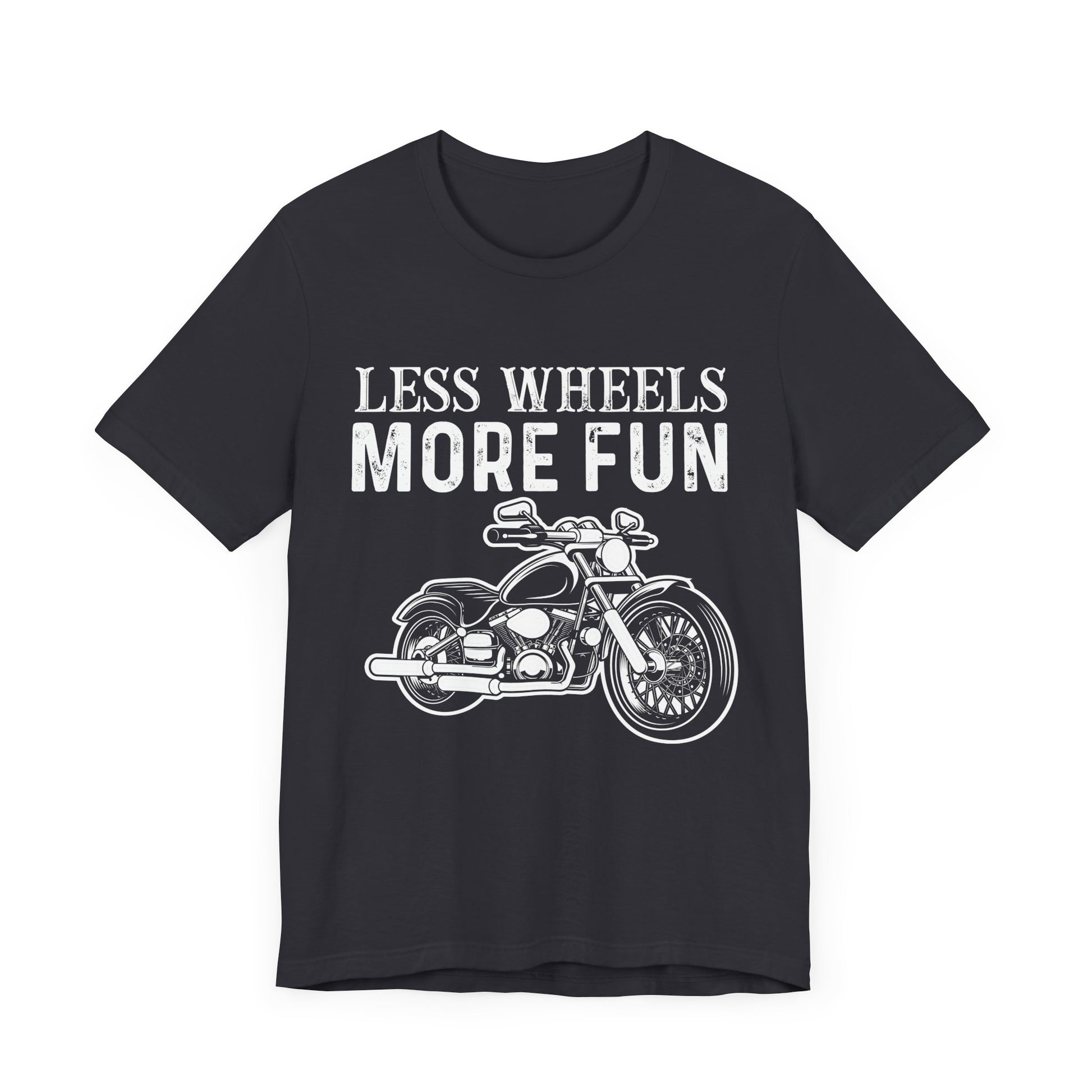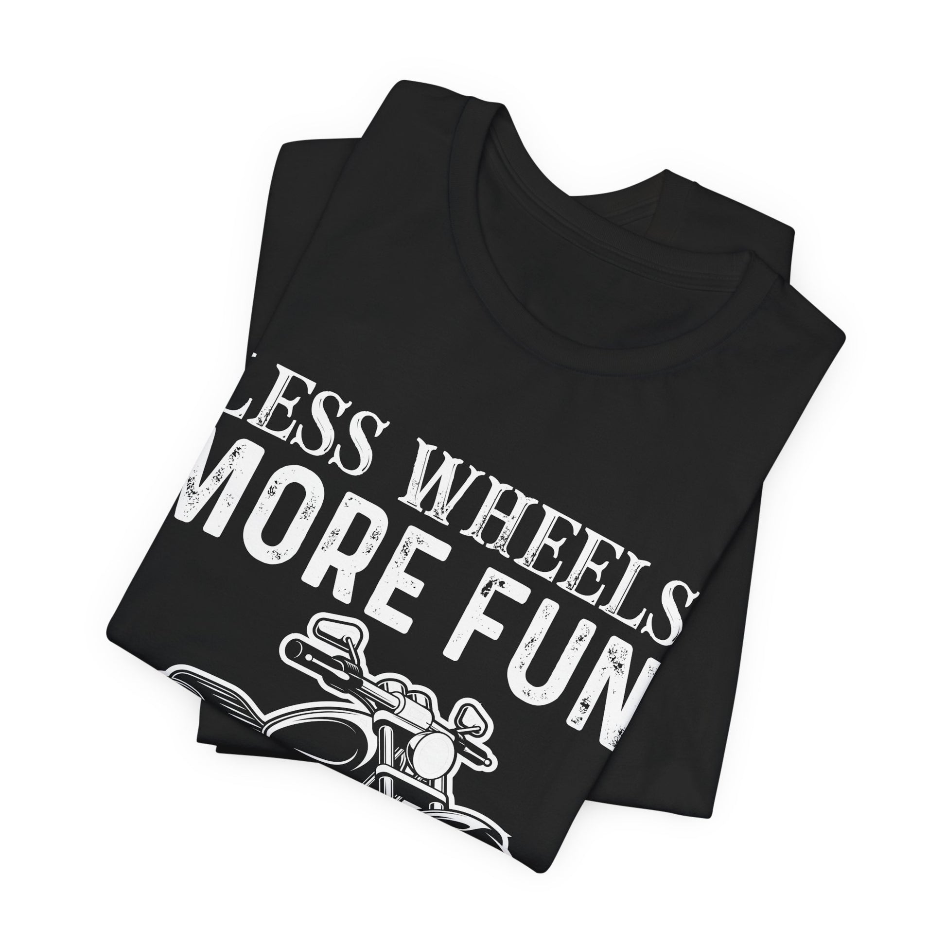 Elevate your riding experience and express your adventurous spirit with the Less Wheels More Fun Tee. Order yours today and get ready to hit the road with style!