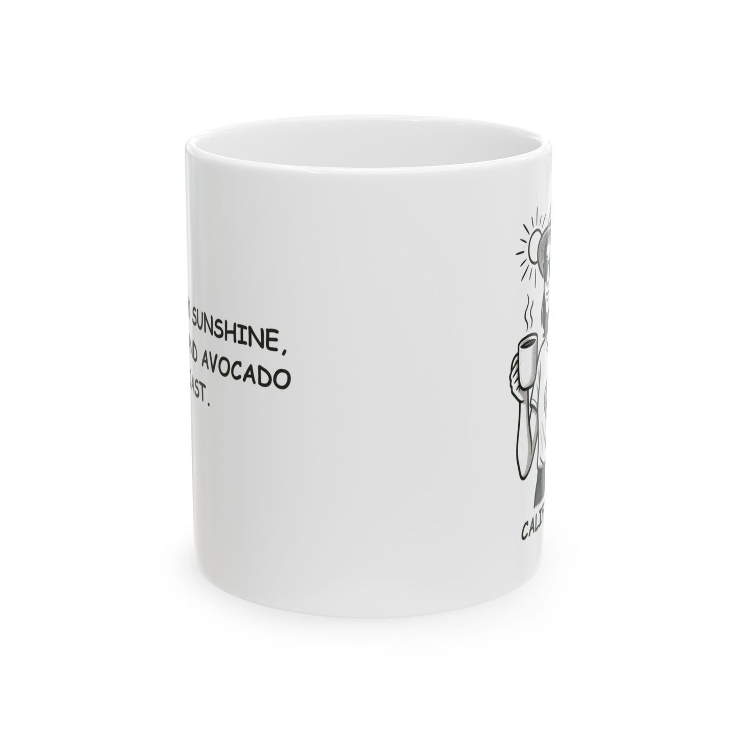 Start your day the California way with our "Living on sunshine, coffee, and avocado toast." Ceramic Mug. Crafted for dreamers and brunch lovers, this mug captures the laid-back, sun-soaked spirit of your best mornings. Whether you're sipping a bold espresso or a frothy latte, it’s the perfect companion for those who believe in good vibes, great coffee, and even better avocado toast.