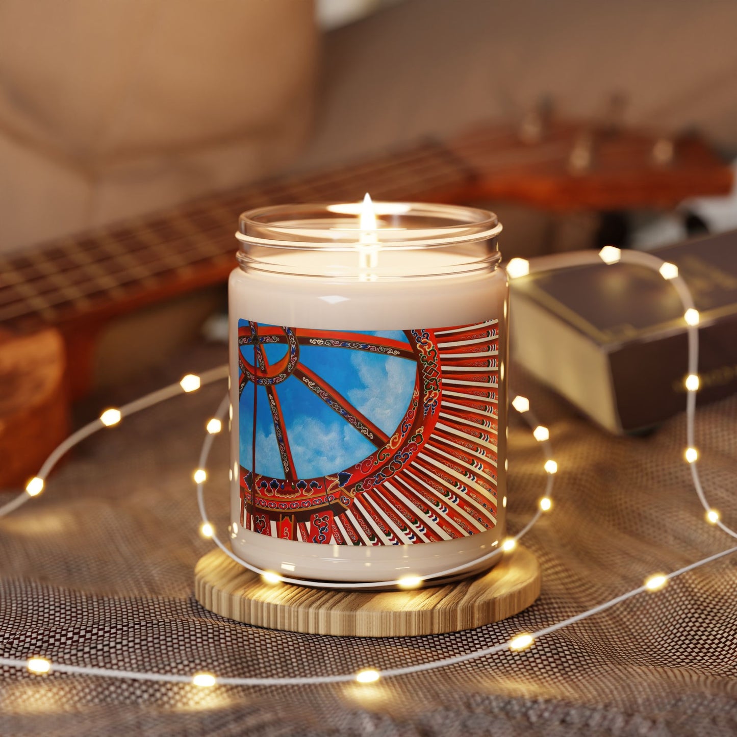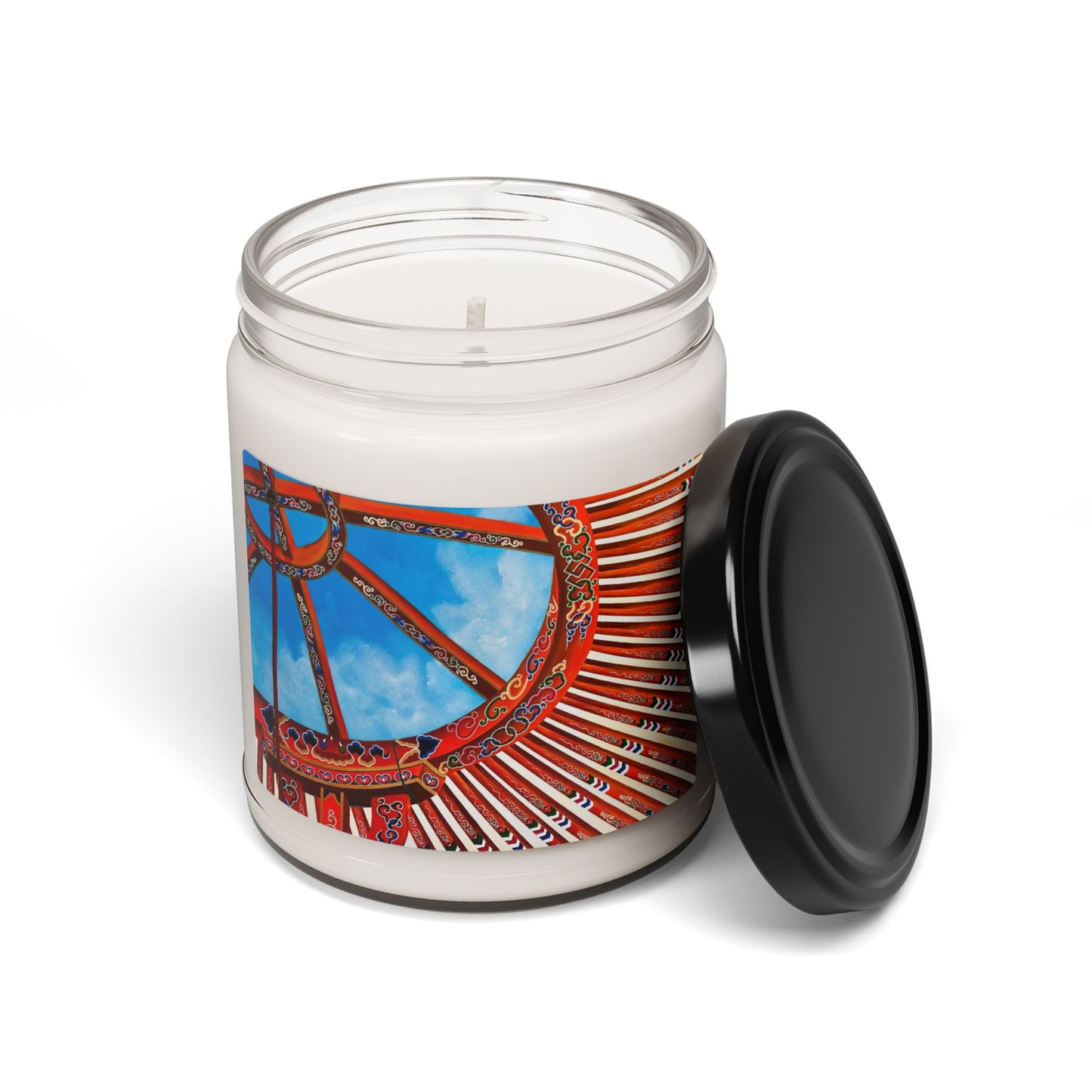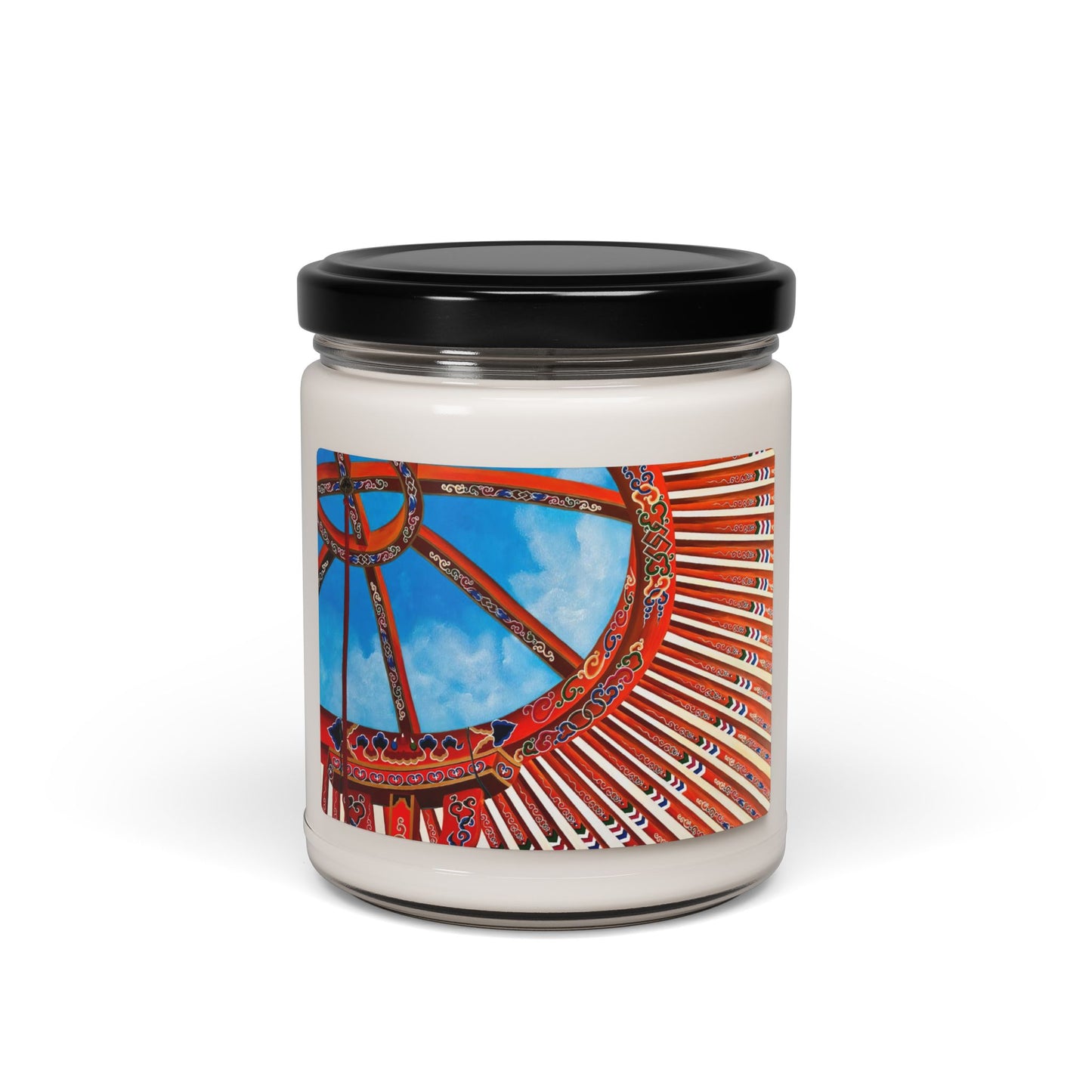 - Design: The candle jar is adorned with a high-resolution print of the Mongol yurt top pattern, featuring vibrant colors and intricate details.