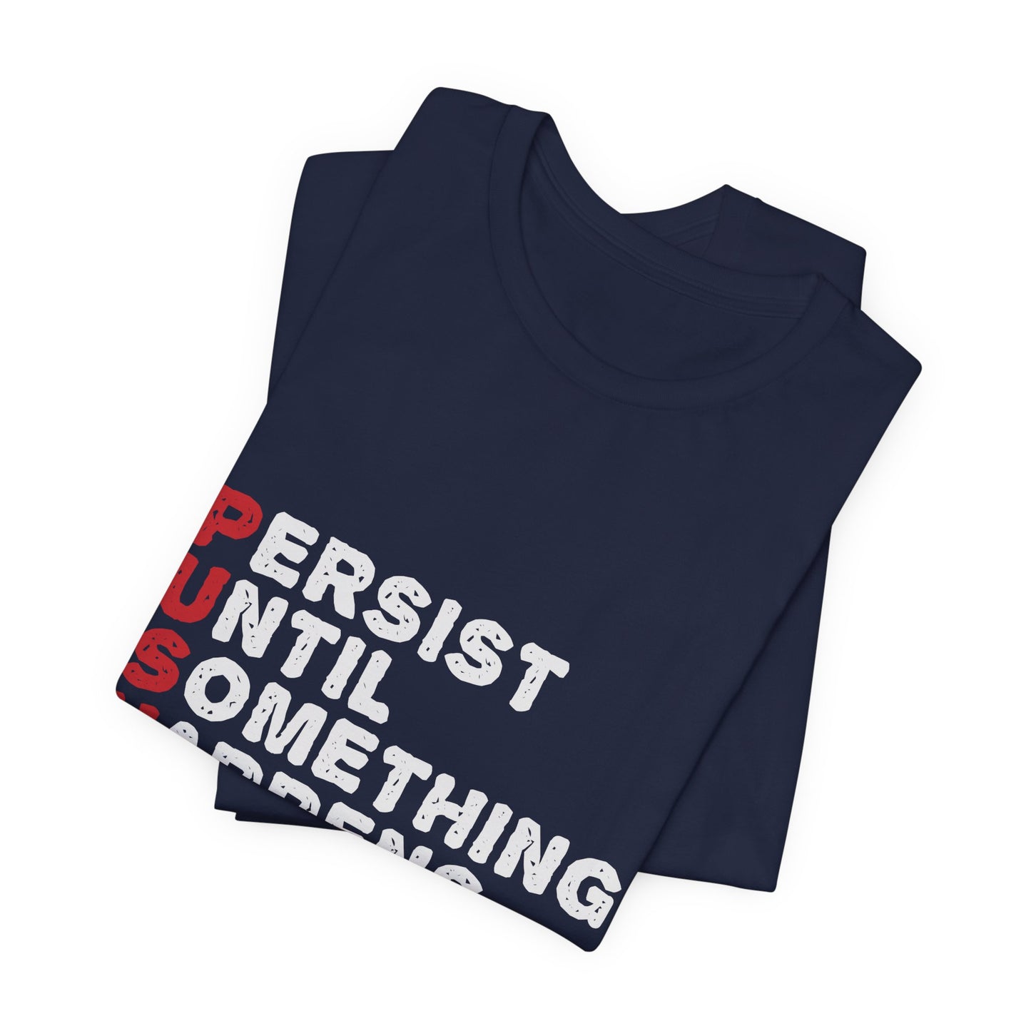 Fuel your drive and showcase your dedication with the “PUSH, Persist Until Something Happens” Unisex Jersey Short Sleeve Tee. Order yours today and wear your commitment to perseverance with pride!