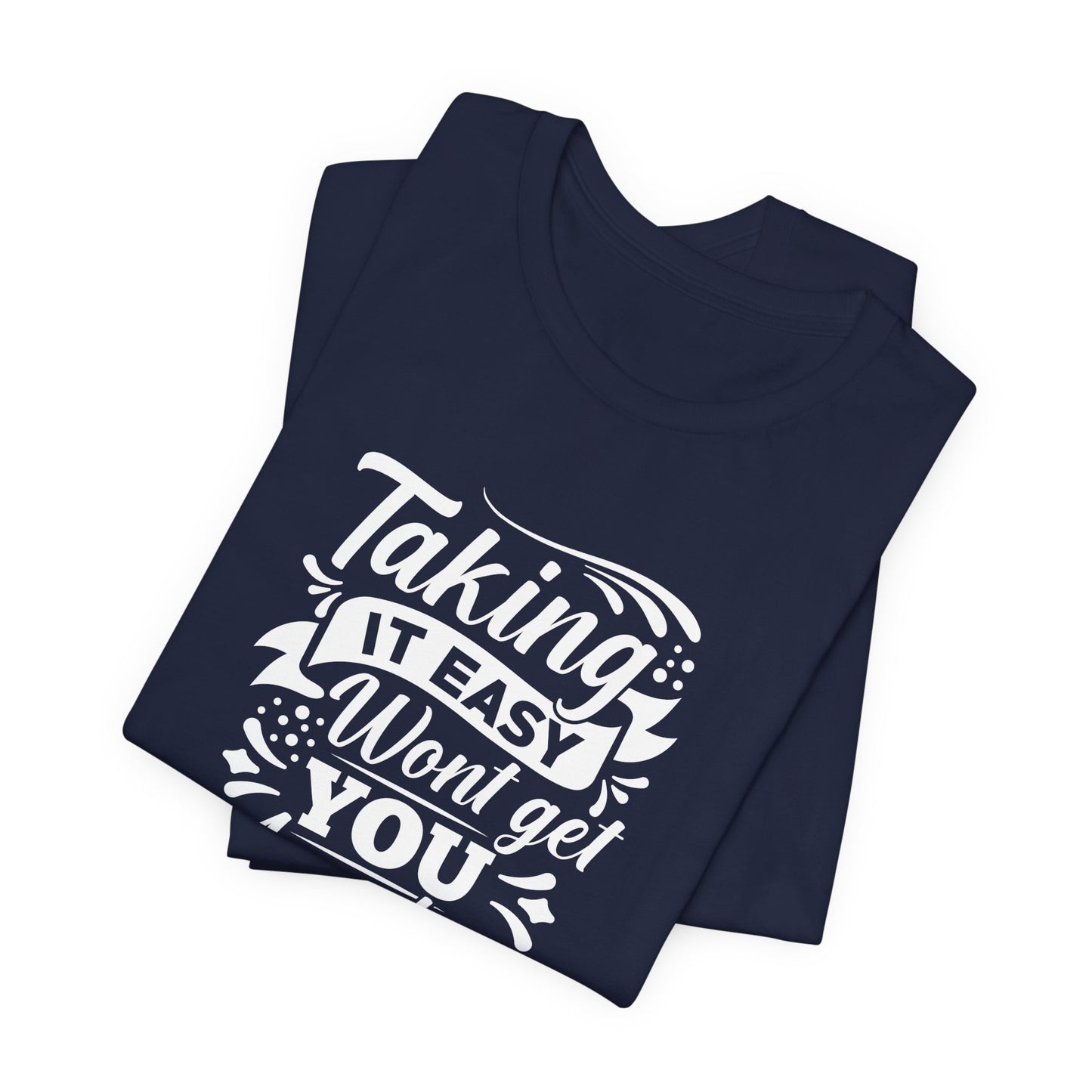 Wear the “Taking It Easy Won't Get You Anywhere” Unisex Jersey Short Sleeve Tee as a testament to your dedication and hard work. Order yours today and inspire yourself and others to go the extra mile and achieve their dreams.