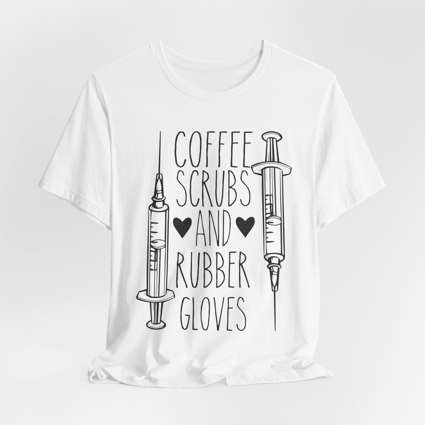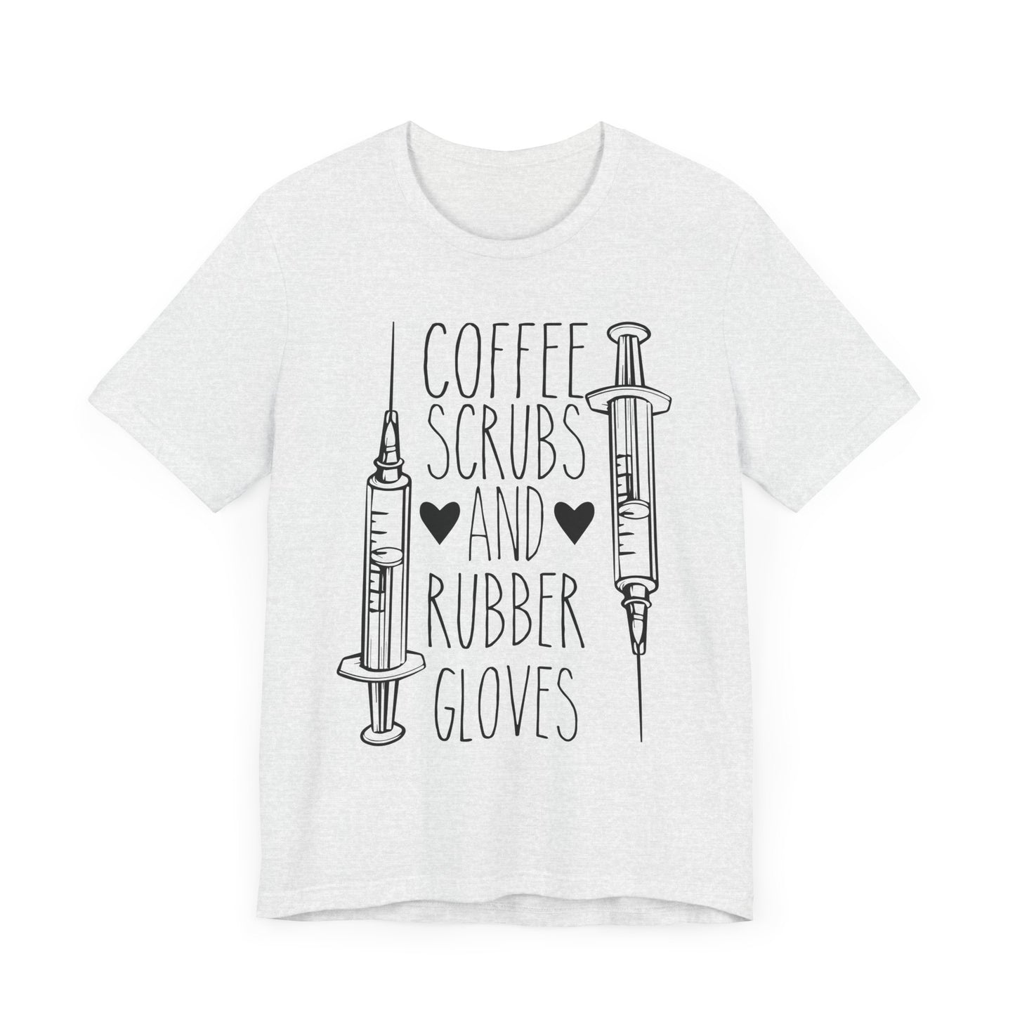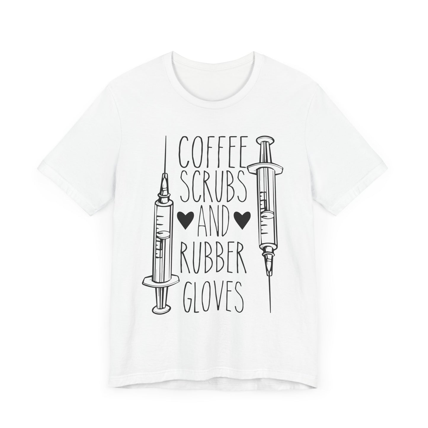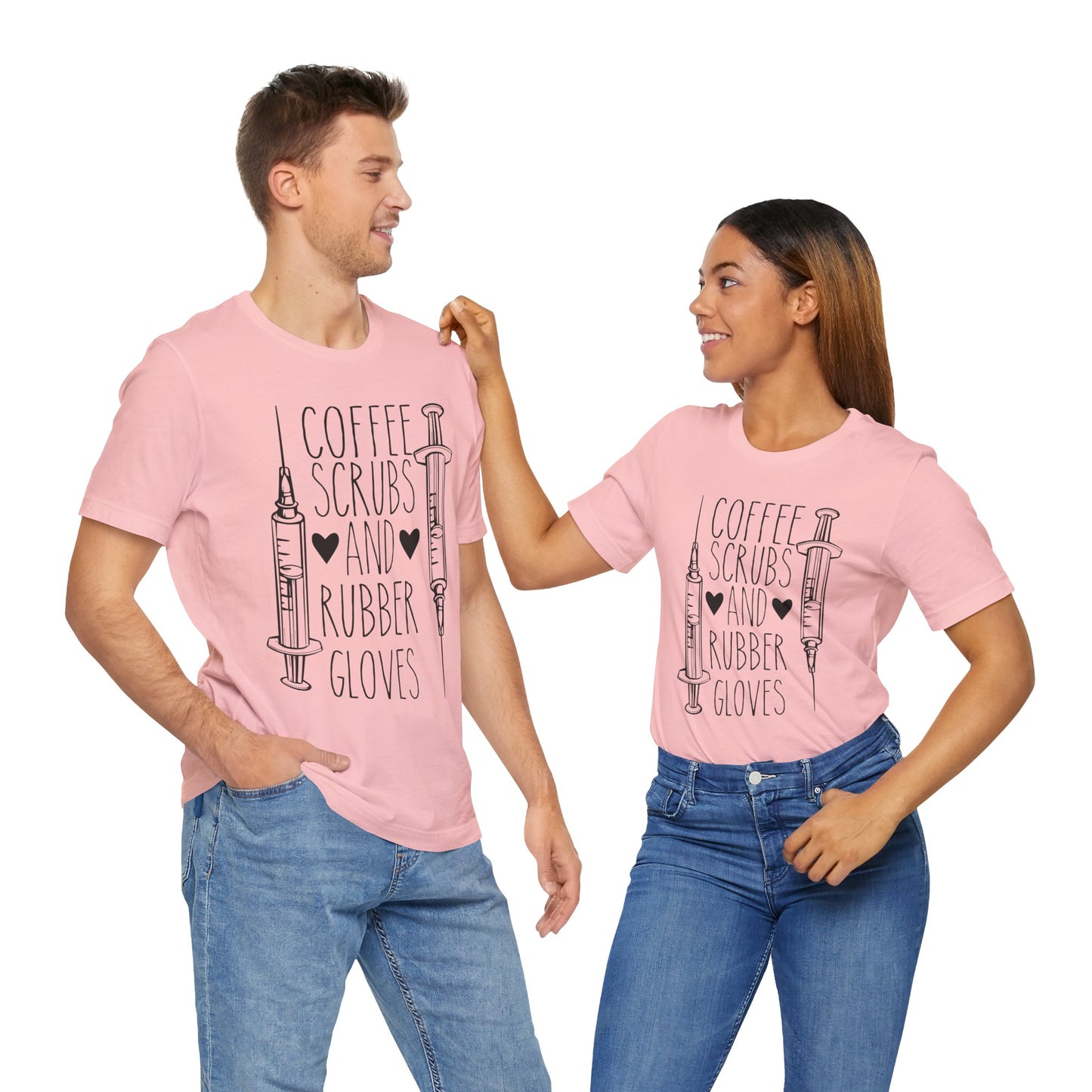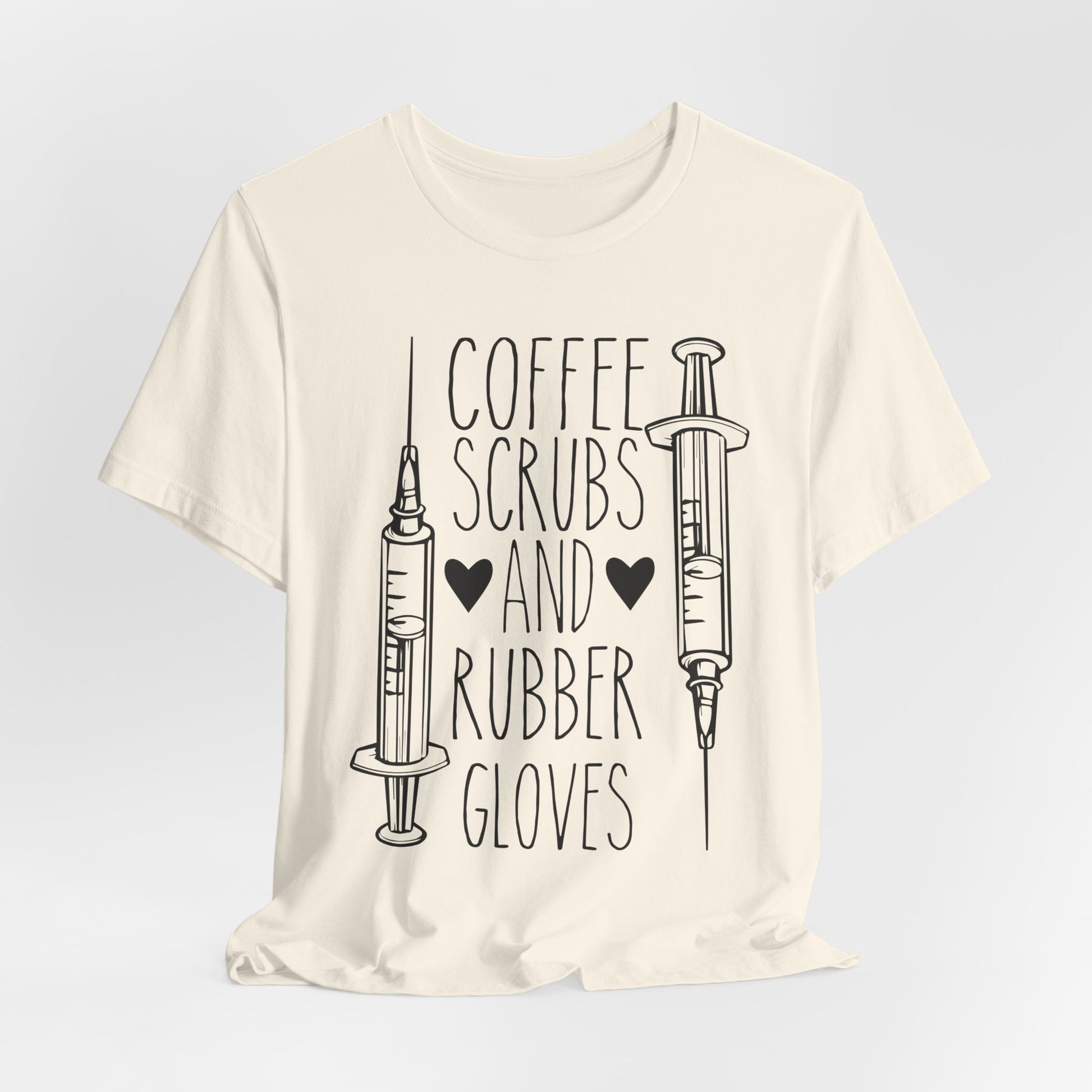 Nurse: Coffee Scrubs & Rubber Gloves - Unisex Jersey Short Sleeve Tee - 13382
