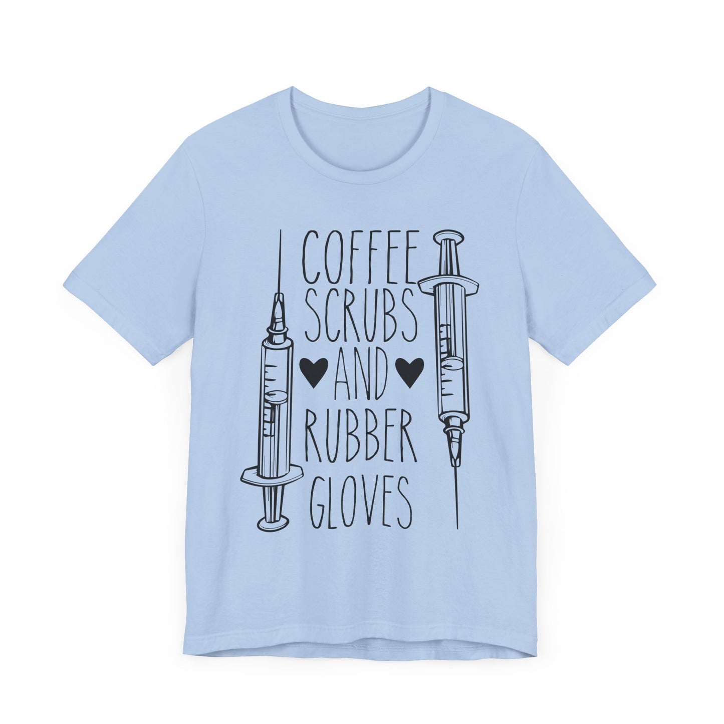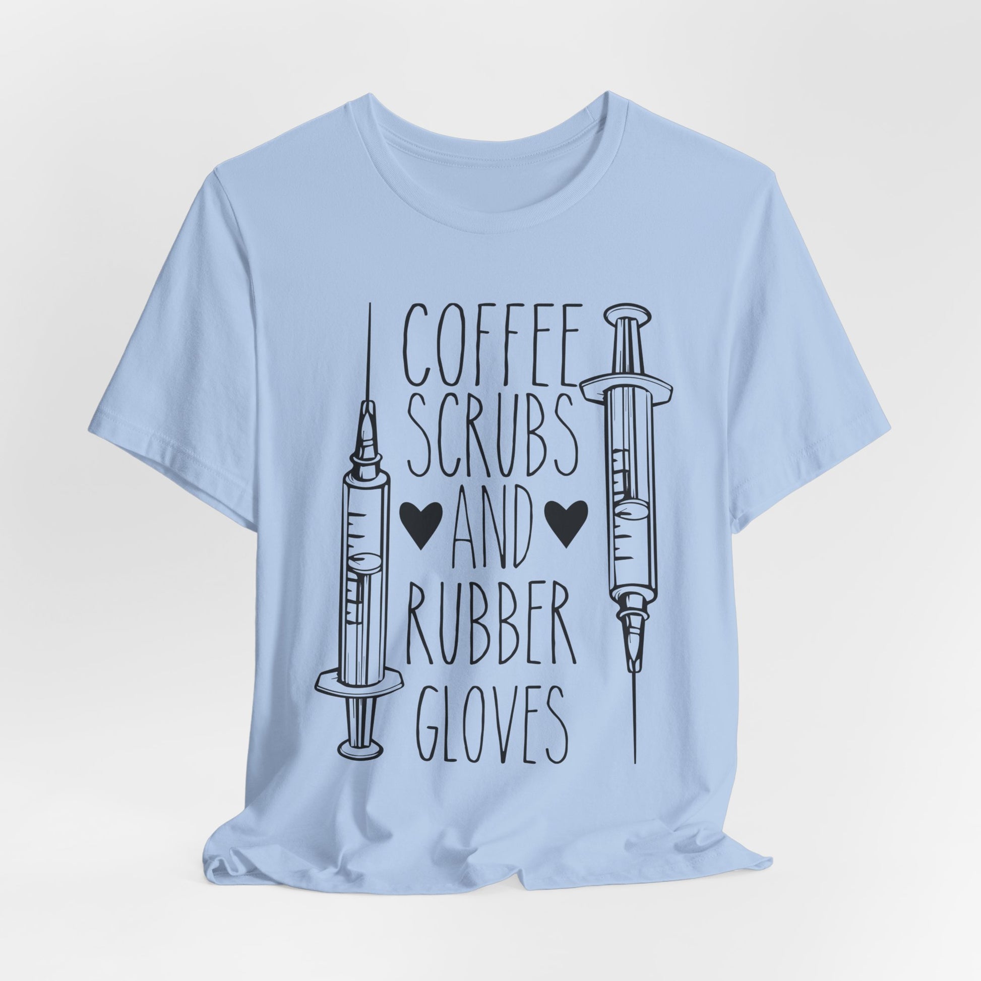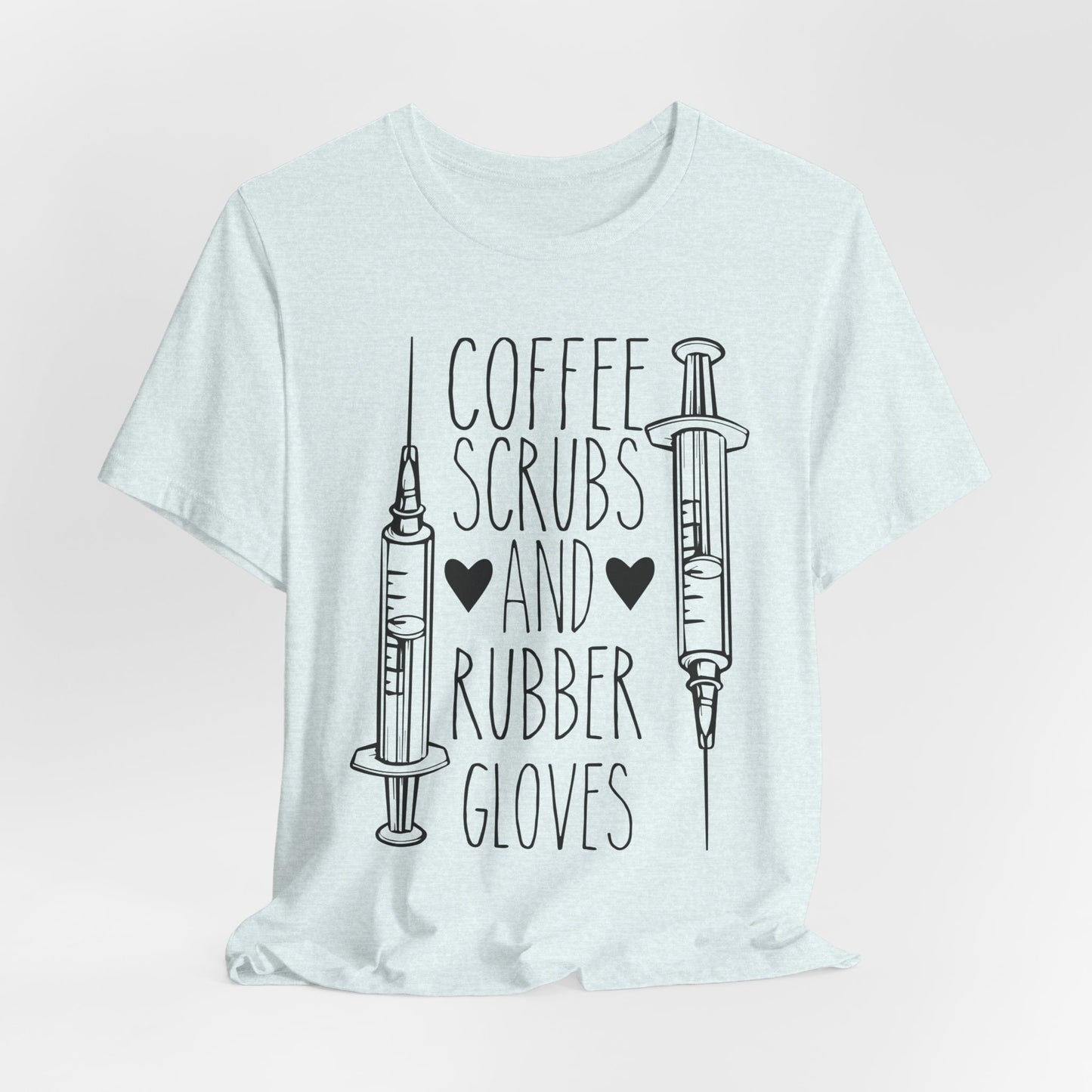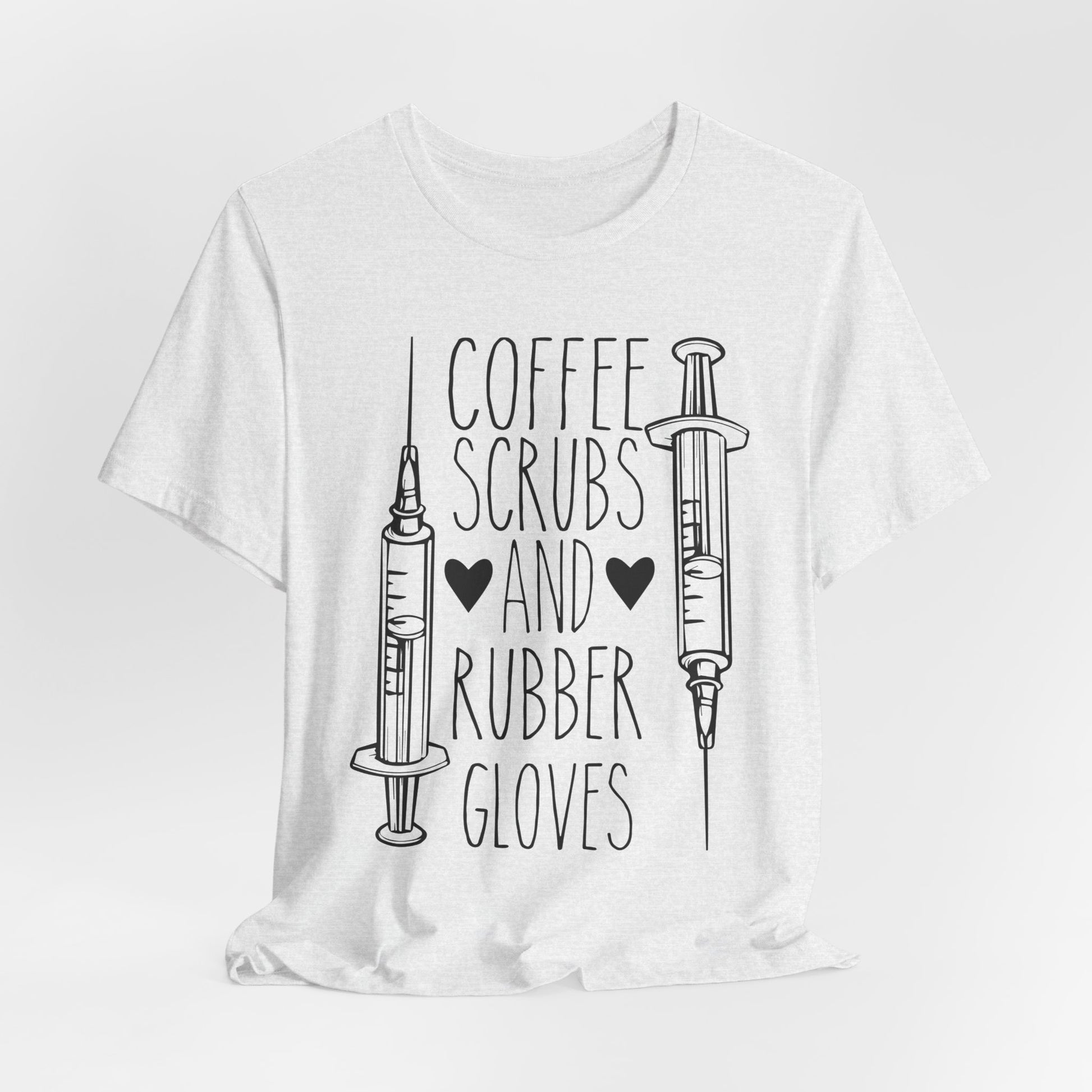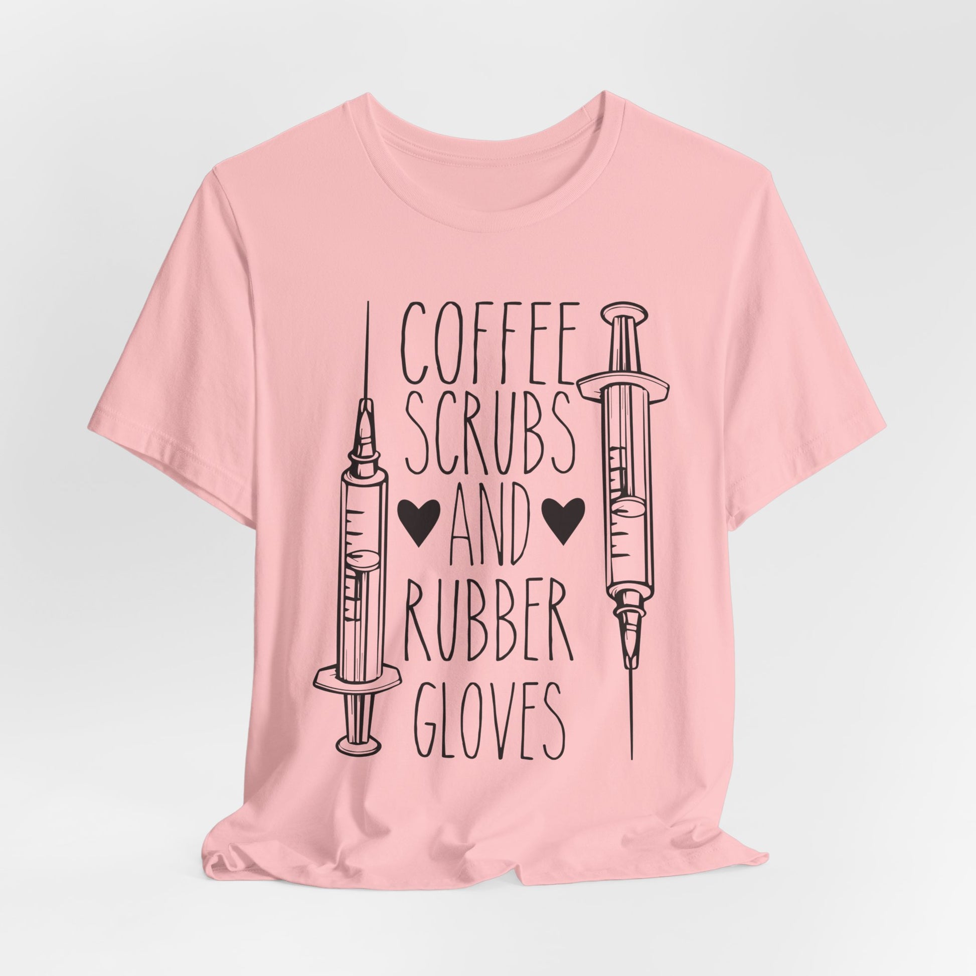 Nurse: Coffee Scrubs & Rubber Gloves - Unisex Jersey Short Sleeve Tee - 13382