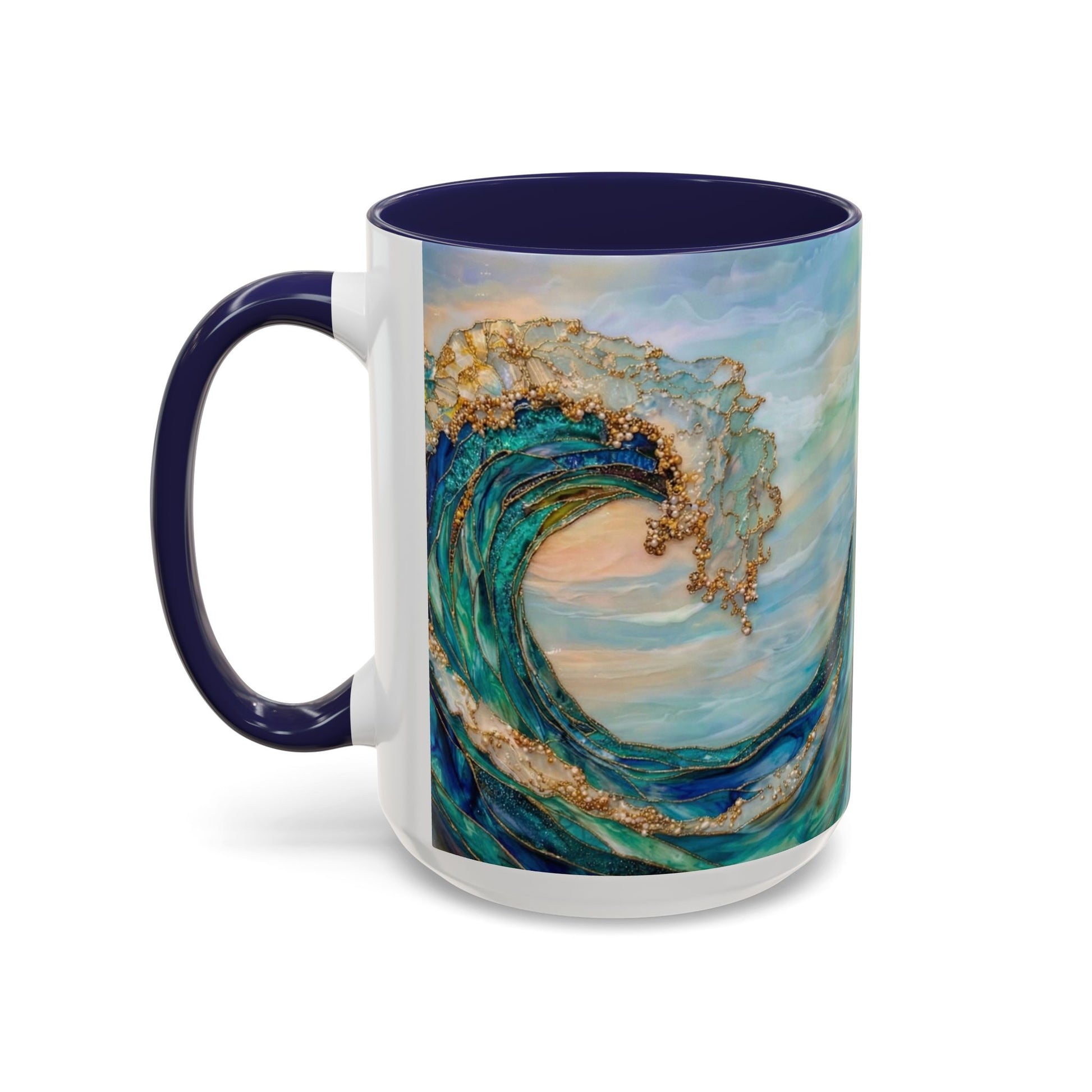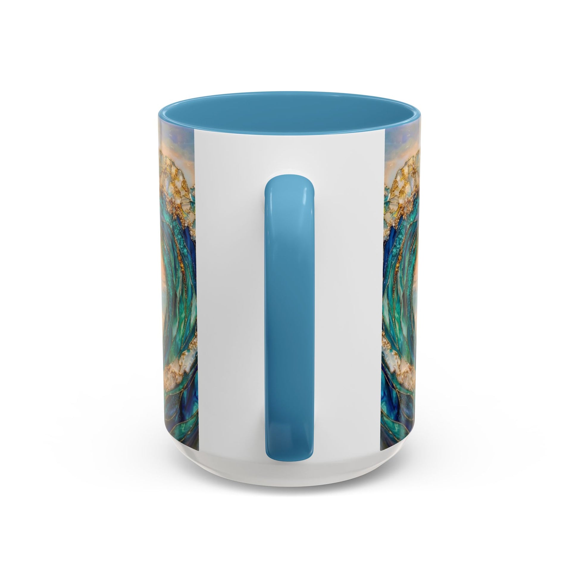 Featuring a stunning stained-glass inspired wave shaped like a heart, this mug glows with shades of teal, turquoise, deep blue, and shimmering pearl. Its beachy, coastal vibe instantly brightens your mood—perfect for slow mornings, creative afternoons, or quiet sunset moments.