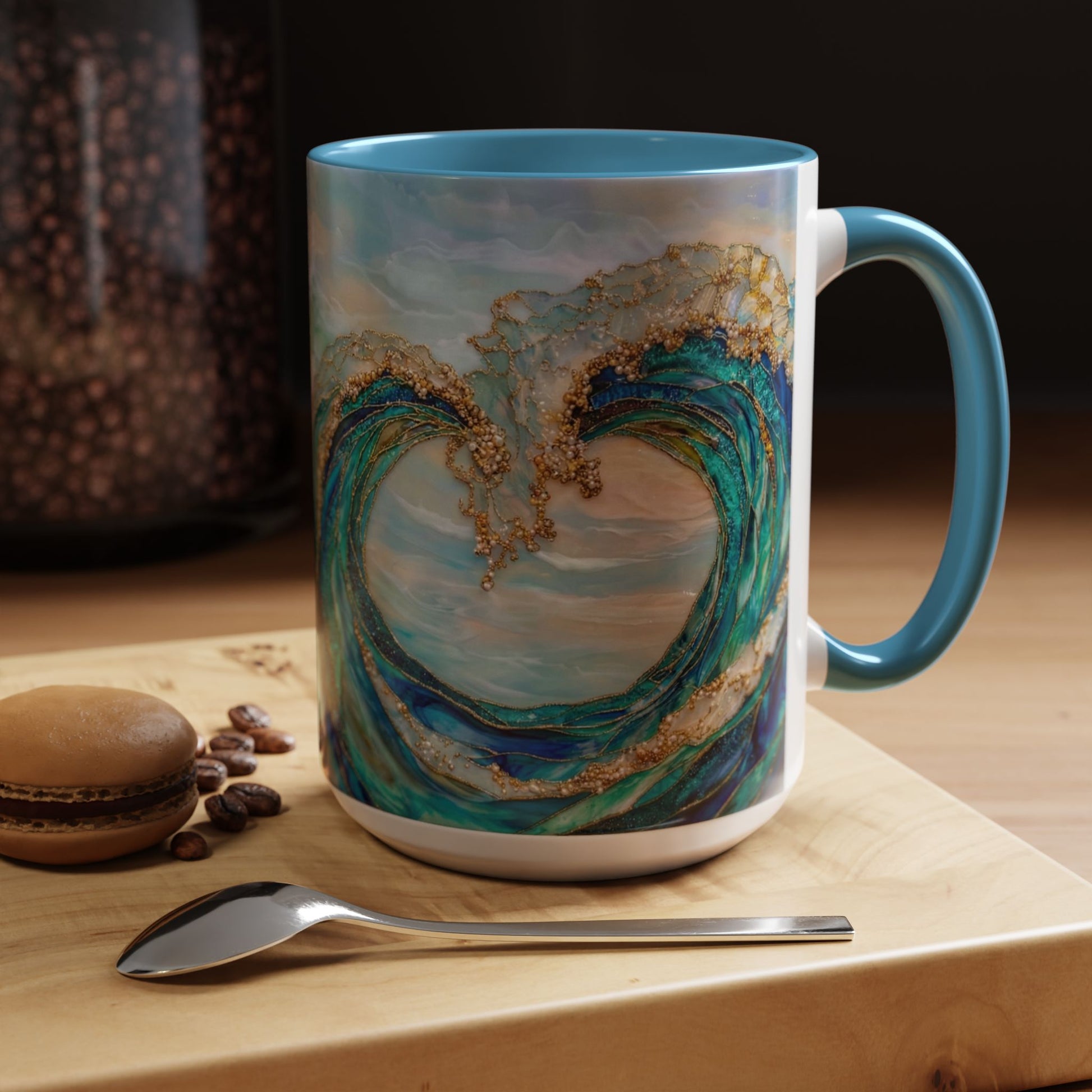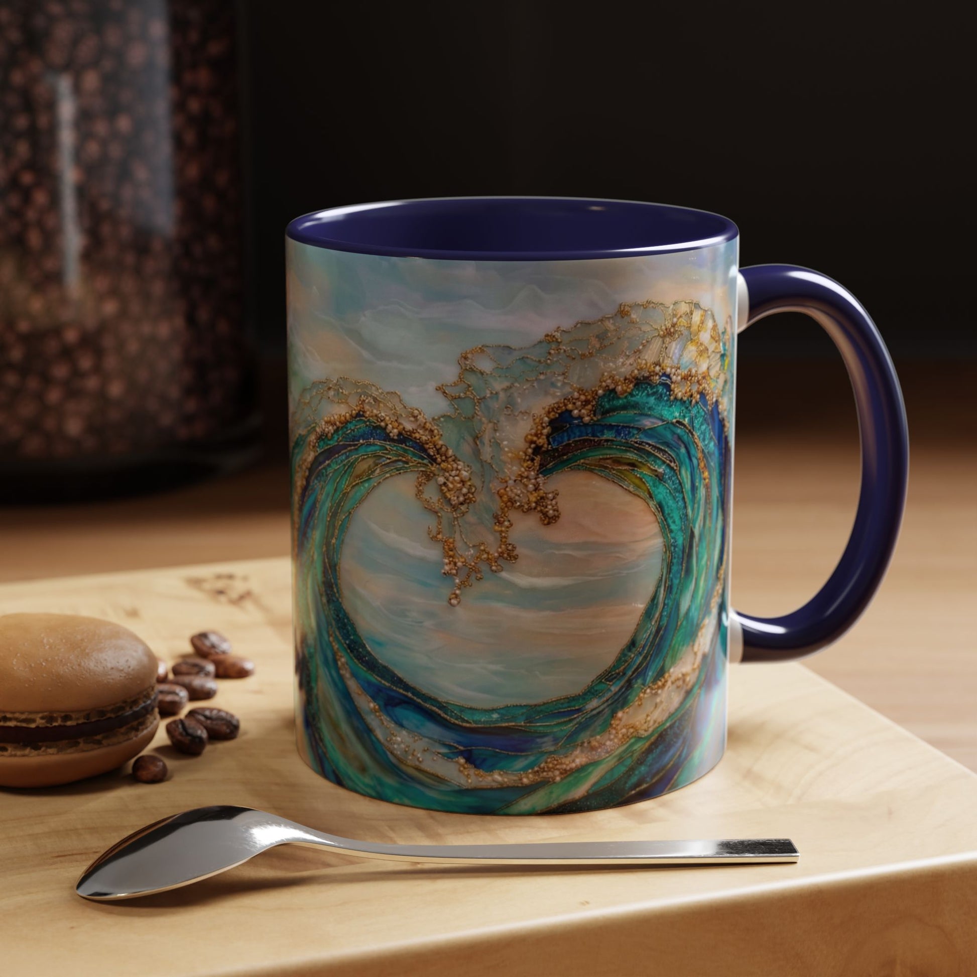 Ocean Heart Wave Coffee Mug — Teal Blue Accent Beachy Ceramic Mug (11/15oz) - 14521