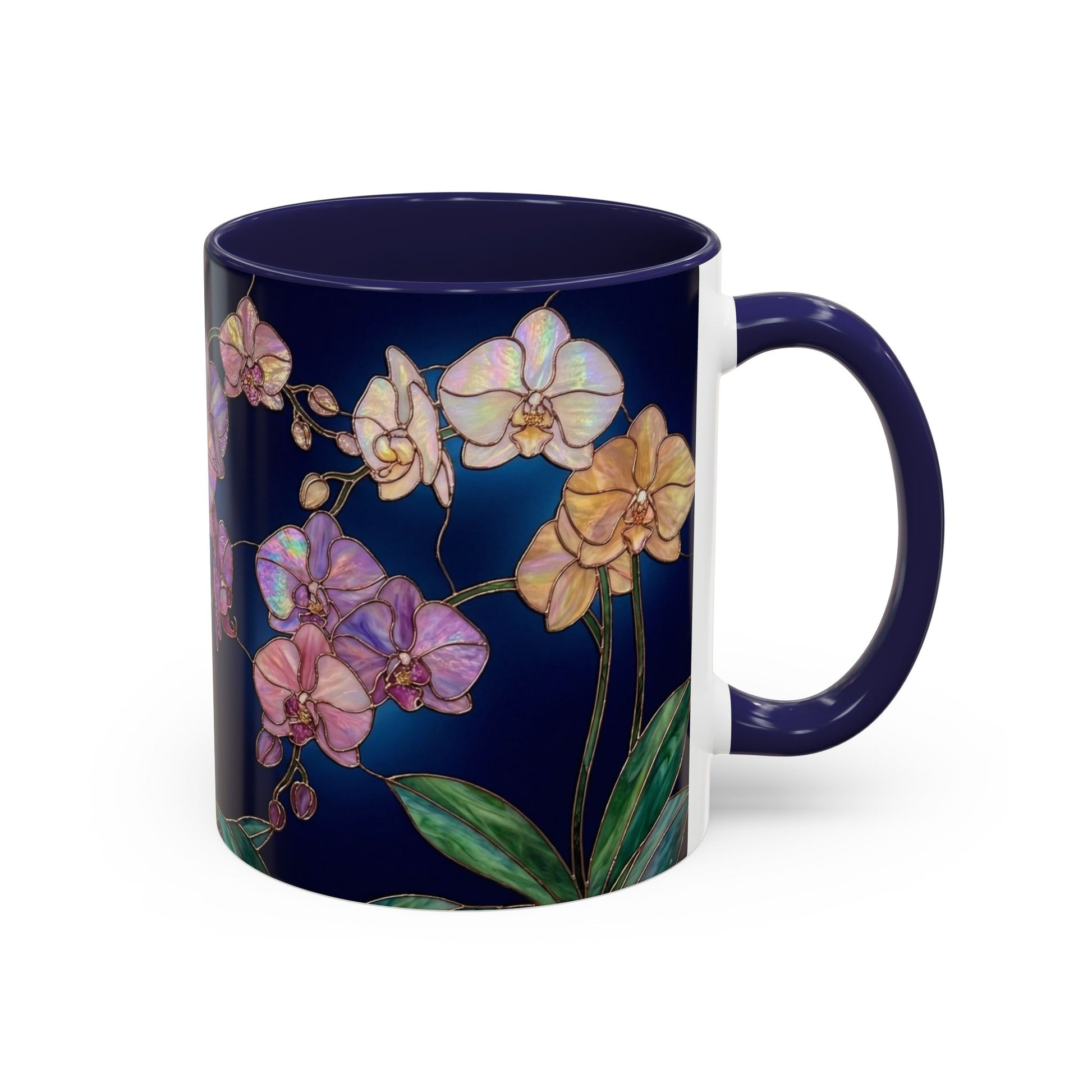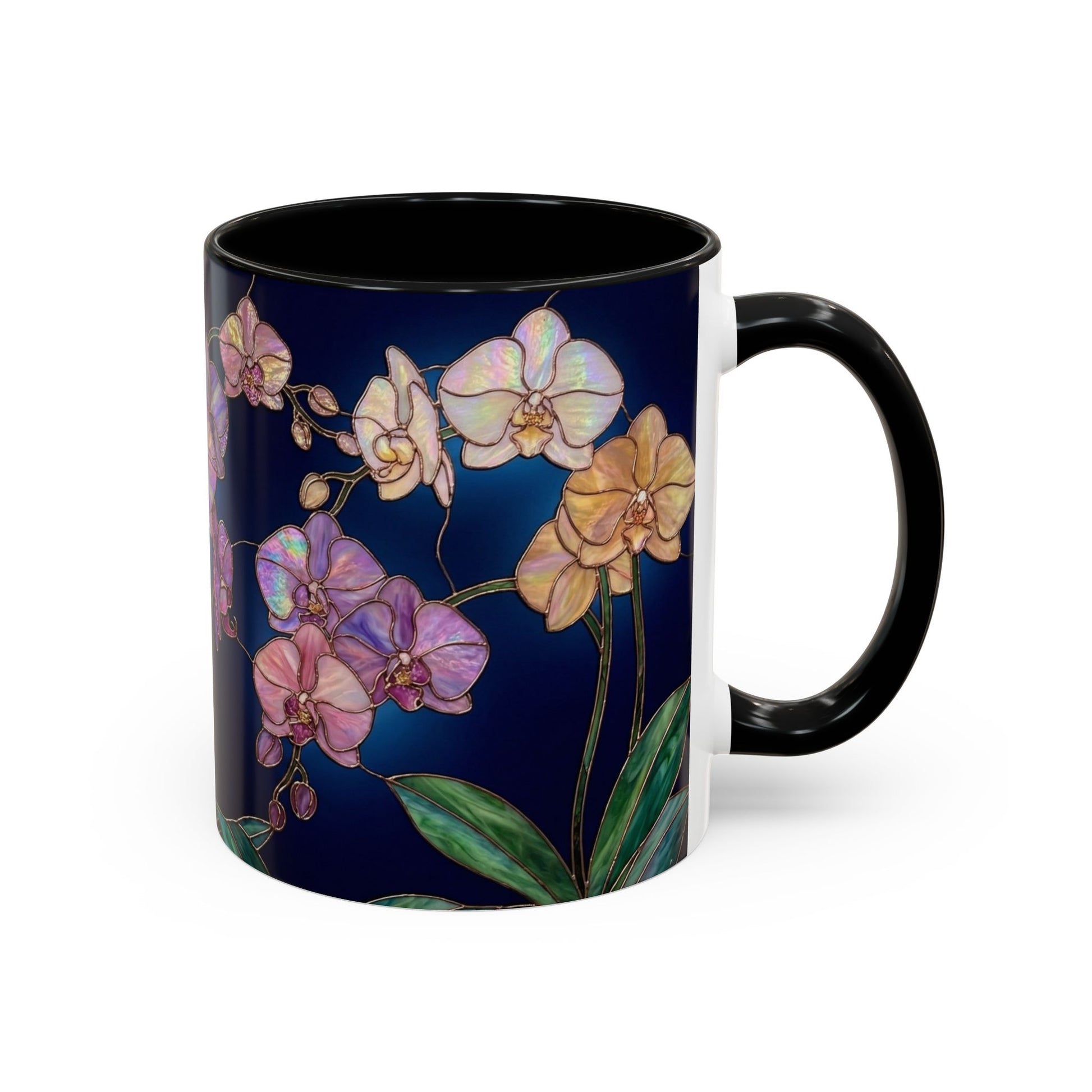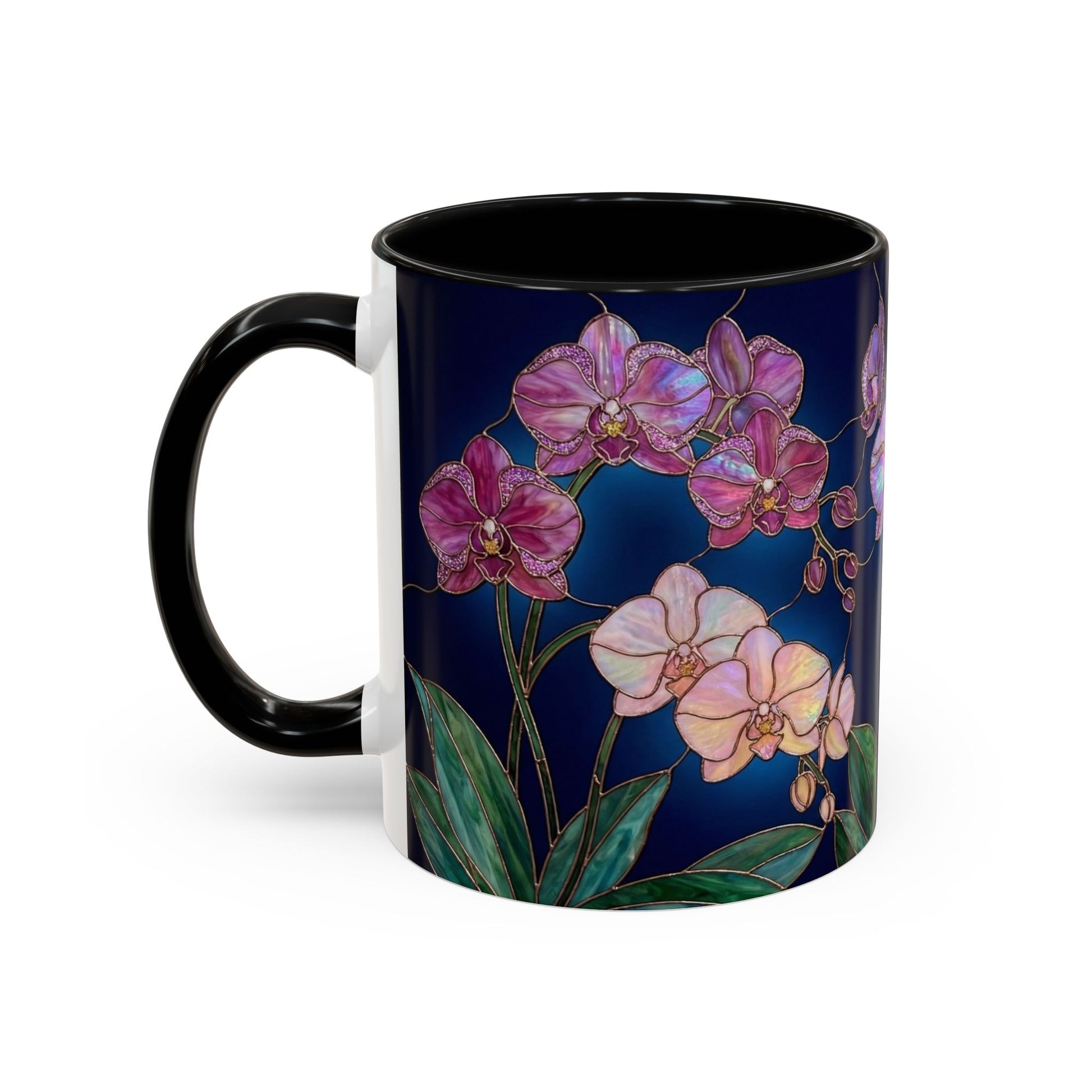 levate every sip with the enchanting beauty of orchids, reimagined in luminous stained-glass artistry. This elegant mug features intricate orchid blooms in jewel-tone purples, pinks, and whites, outlined with golden detailing that creates a glowing, timeless effect—just like a piece of art you can hold in your hand.