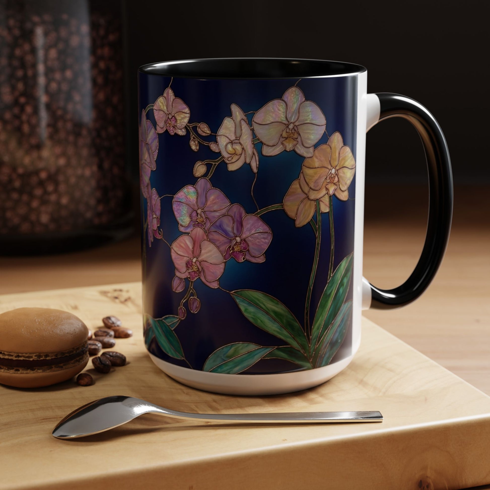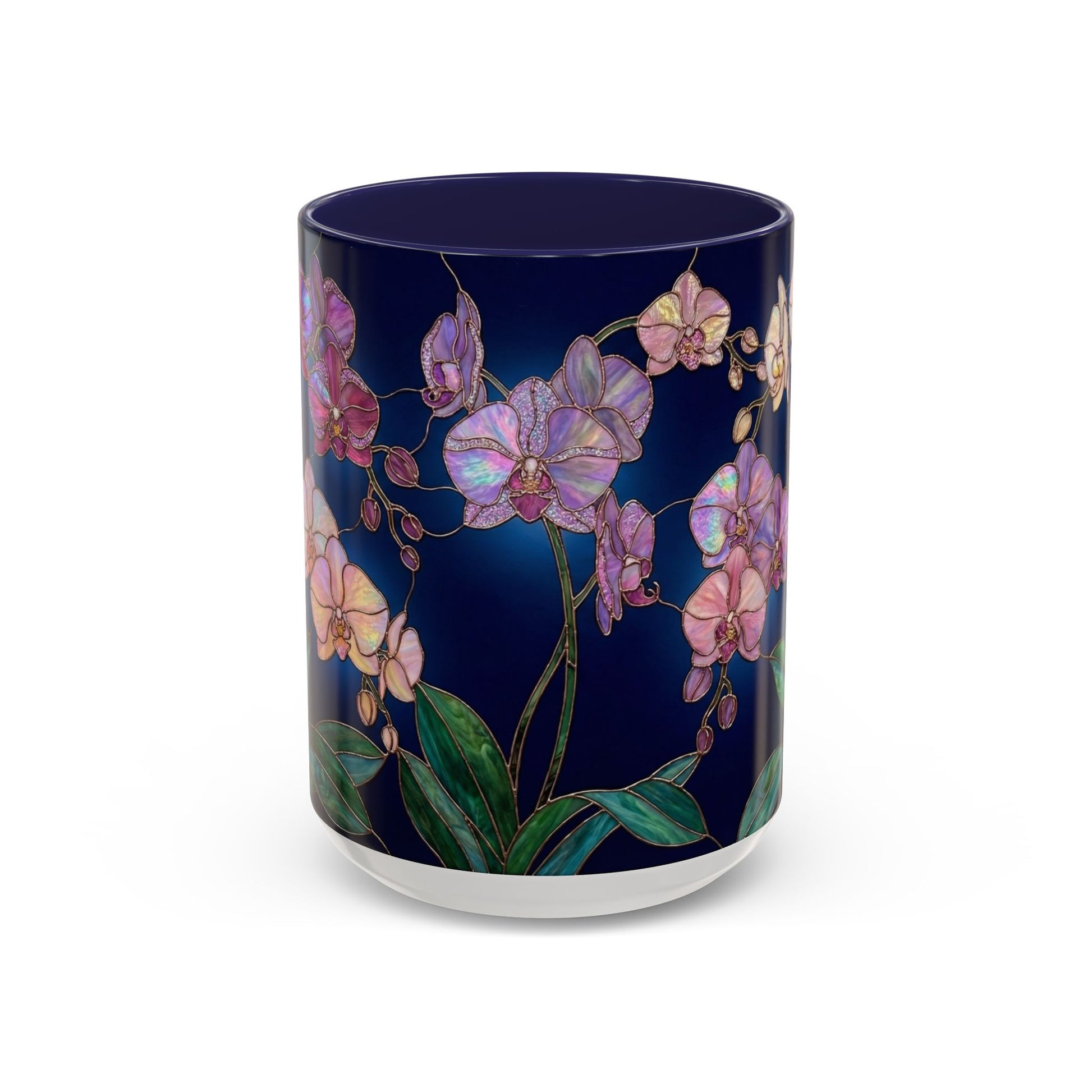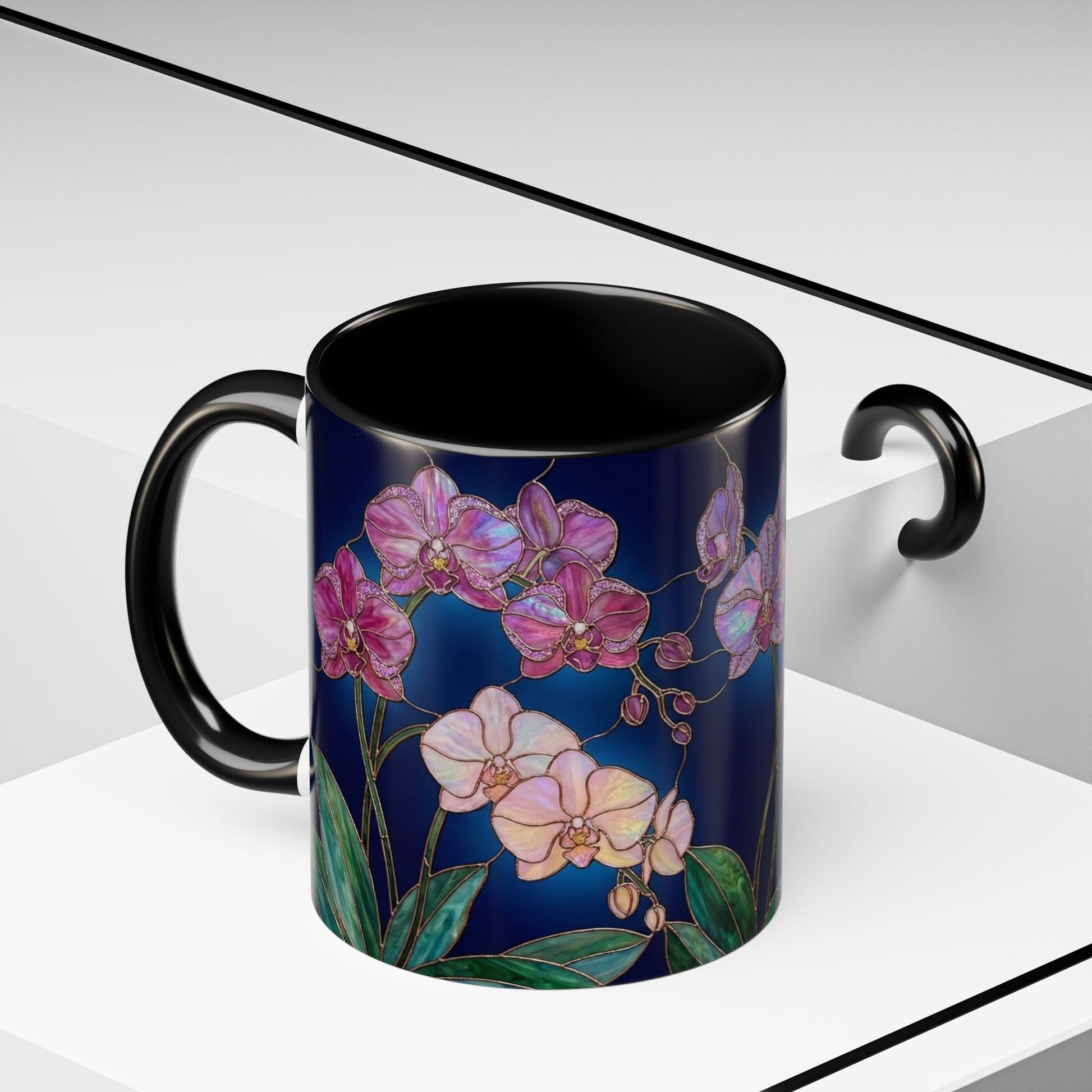 levate every sip with the enchanting beauty of orchids, reimagined in luminous stained-glass artistry. This elegant mug features intricate orchid blooms in jewel-tone purples, pinks, and whites, outlined with golden detailing that creates a glowing, timeless effect—just like a piece of art you can hold in your hand.