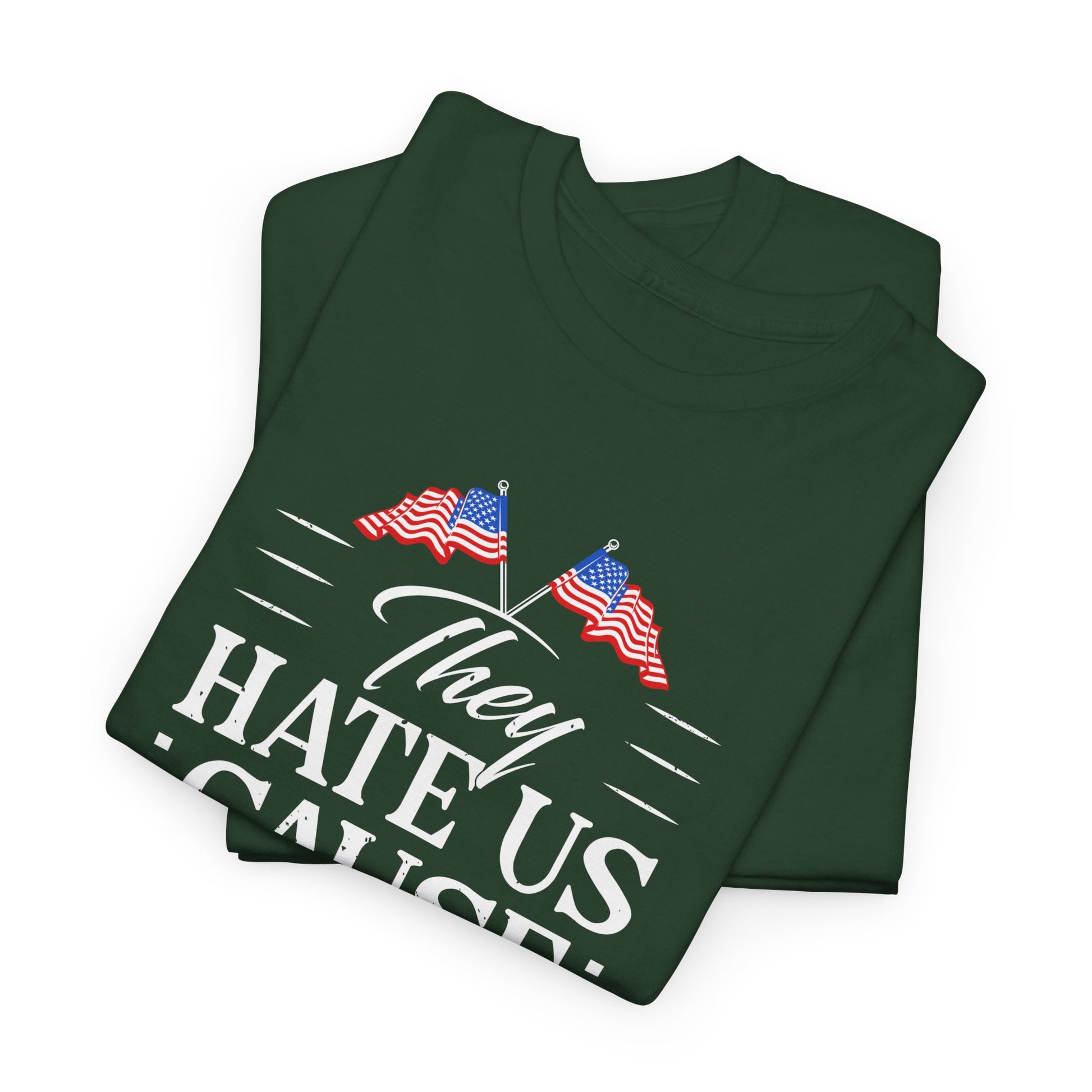 Make a bold, unapologetic statement with this patriotic tee that says it all: “They Hate Us 'Cause They Ain’t Us.” Perfect for those who wear their pride with a little attitude, this heavy cotton shirt is built for comfort, durability, and all-day confidence.