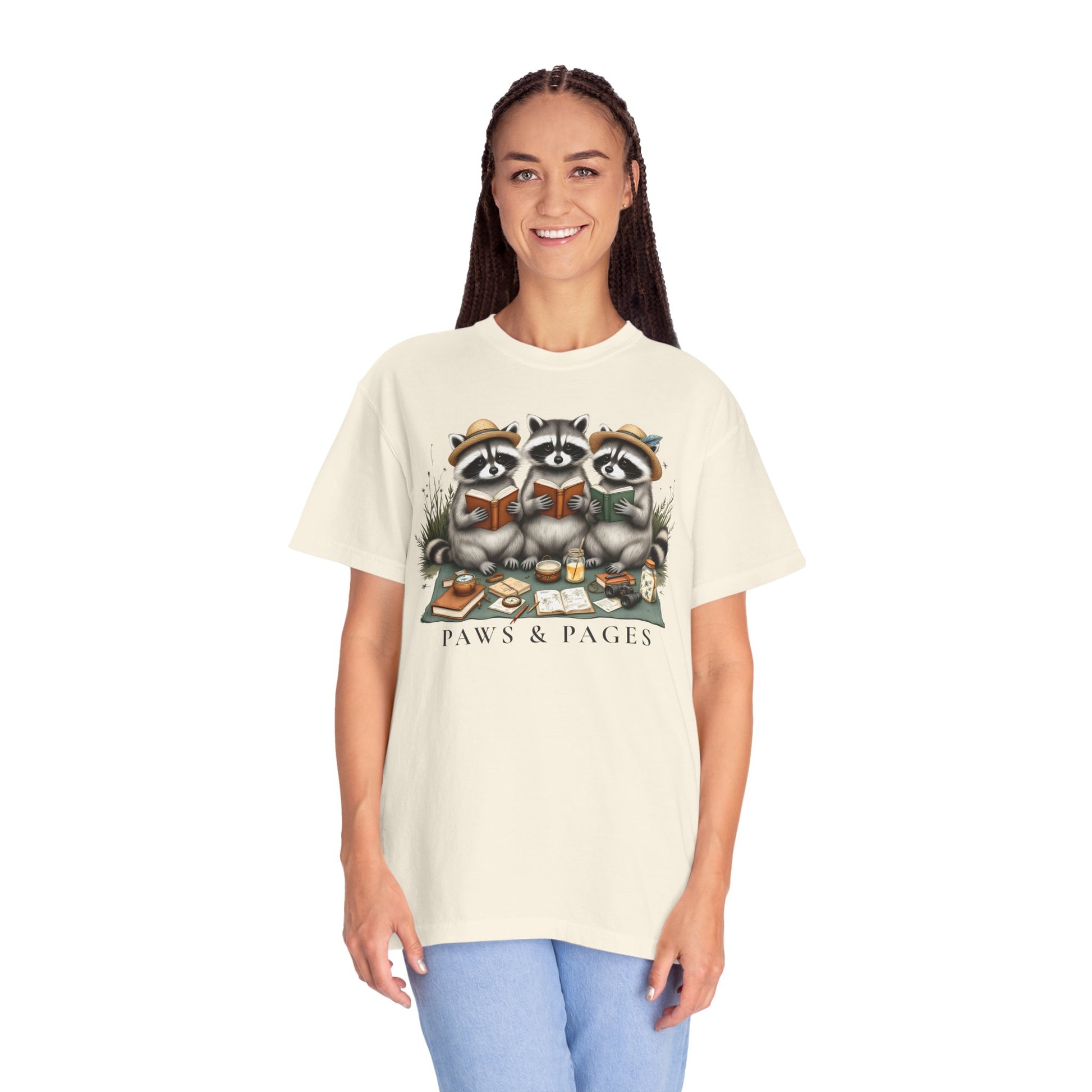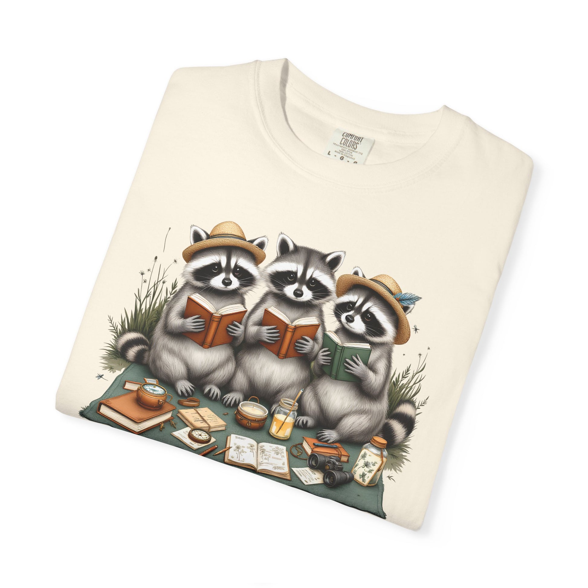 Soft, lived-in tee that feels like a quiet afternoon curled up with a favorite book and a warm drink. The front art shows three cozy raccoons sharing stories and snacks on a picnic blanket — warm, playful, and a touch whimsical. The garment-dyed cotton and relaxed cut give this shirt a vintage, worn-in feel that invites repeat wear: reach for it on slow weekends, library visits, or when you want a gentle reminder to slow down and savor small moments. It sits comfortably in casual closets and pairs easily with denim, cardigans, or layered under an open flannel for crisp mornings at the park. The muted colorways from the dye process make the illustration feel like it’s always belonged on the fabric, not just printed on top.