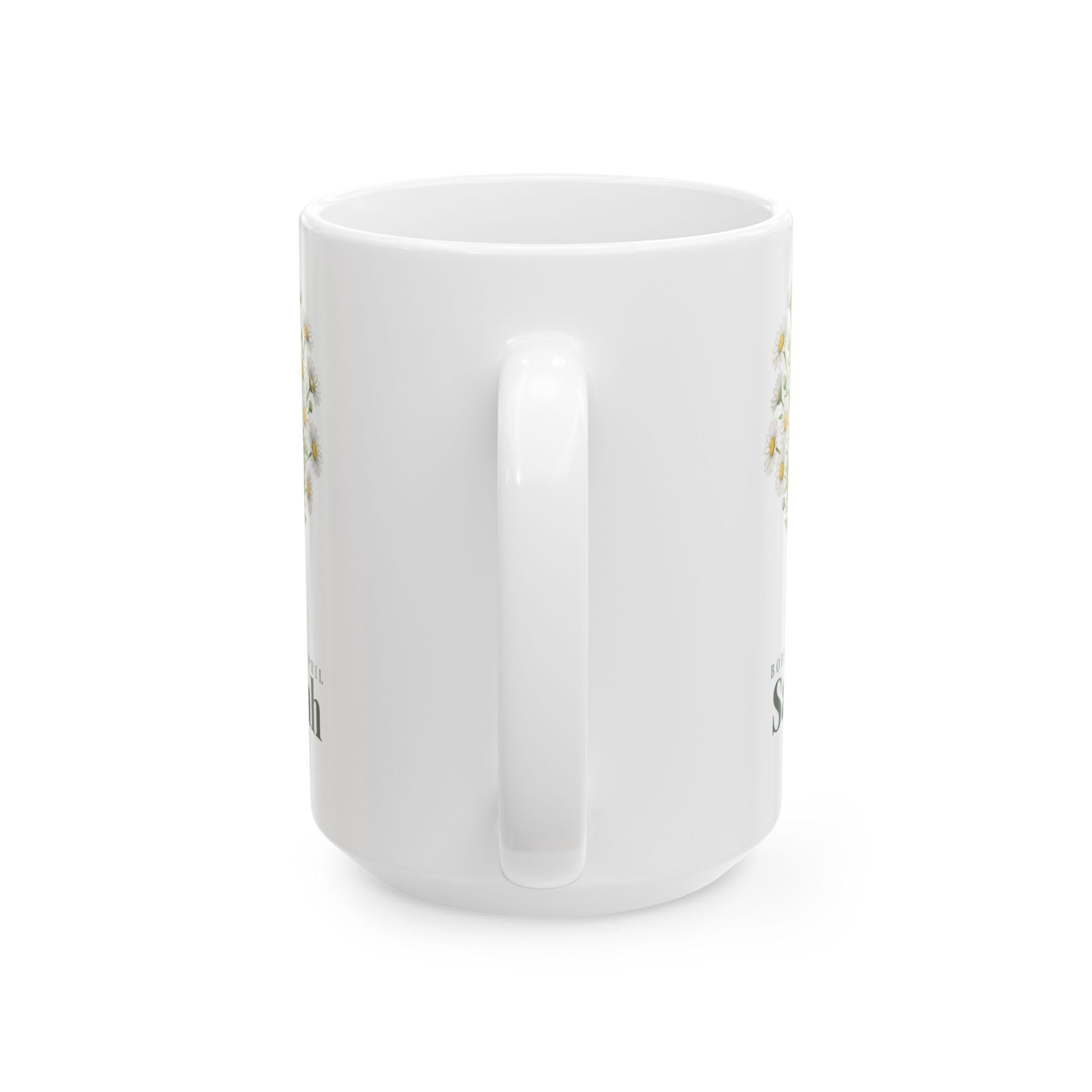 A clean, glossy ceramic mug that celebrates a name and a gentle, floral spirit. Soft daisy illustrations frame a simple, serif nameplate, with three short, heartfelt traits beneath — a quiet reminder each morning of who you are or who you cherish. Lightweight but sturdy, the smooth C-handle fits the hand and the bright print keeps its clarity through daily use. Whether it sits on a work desk or kitchen counter, this mug brings a calm, personal touch to everyday coffee or tea rituals.