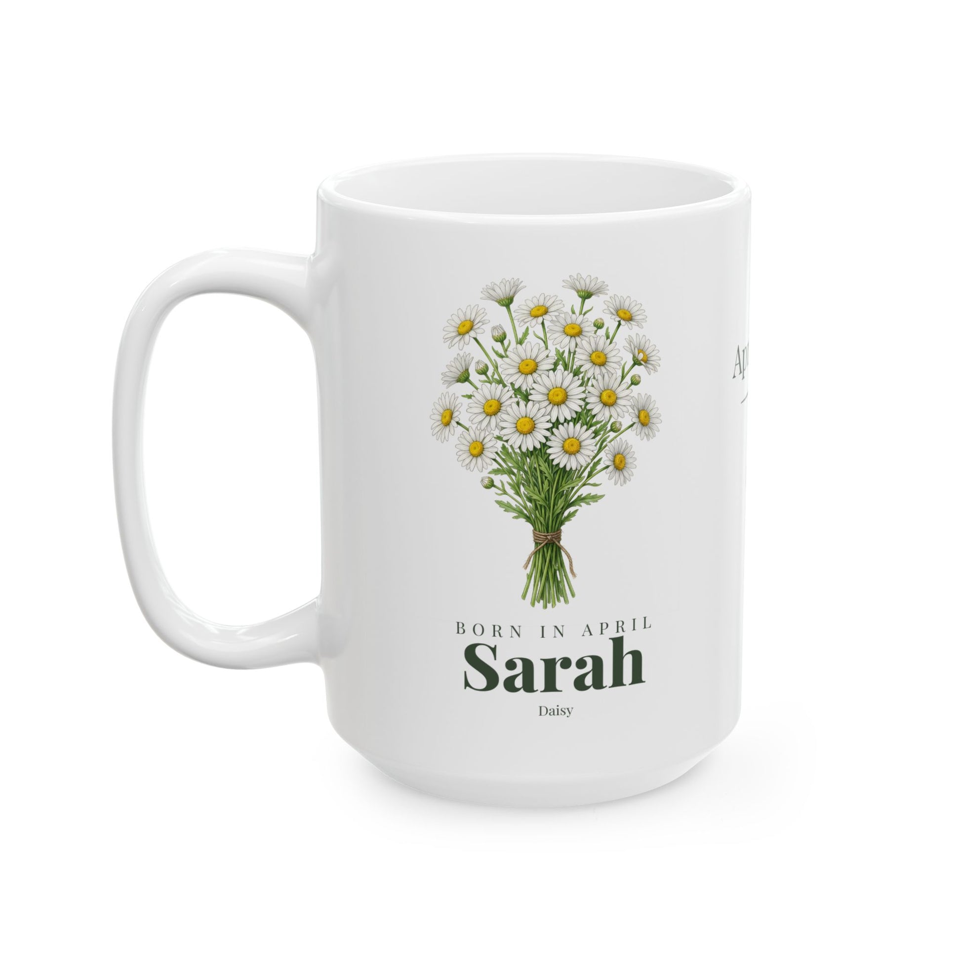 This Personalized April Daisy Birth Flower Mug features a beautifully detailed bouquet of daisies — the official birth flower of April — symbolizing purity, brightness, and loyalty.
