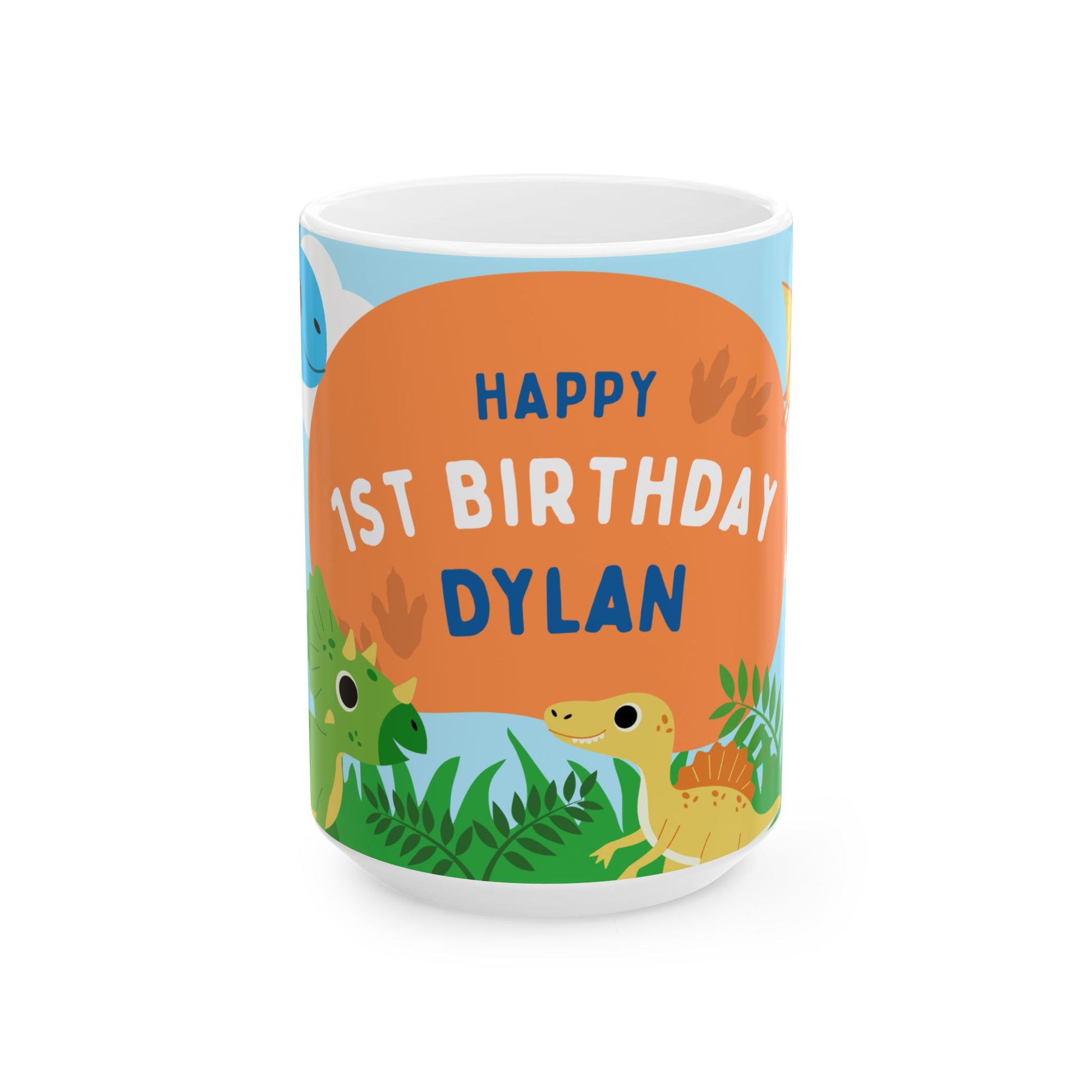 Personalized Dino Birthday Mug | Cute Dinosaur Gift, Kids Party Cup, Custom Birthday Keepsake, Fun 1st Birthday Celebration - 13975