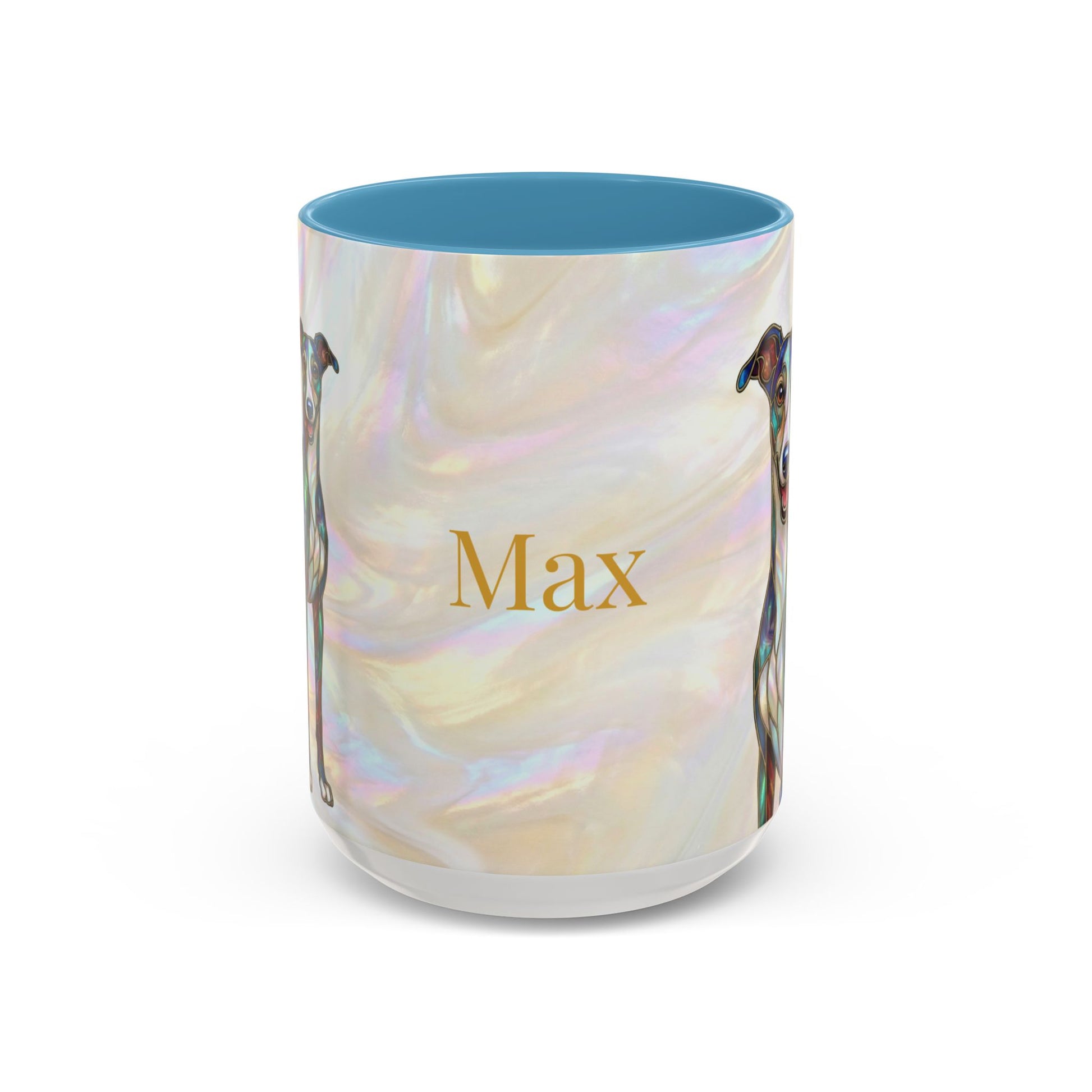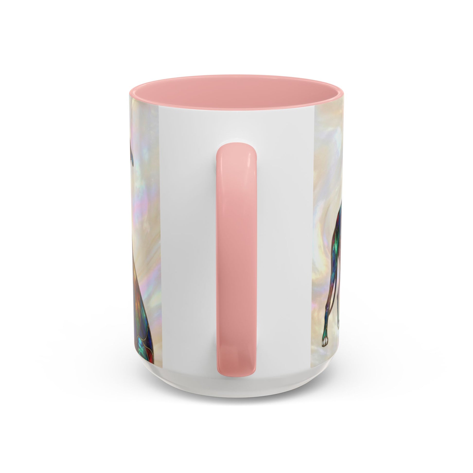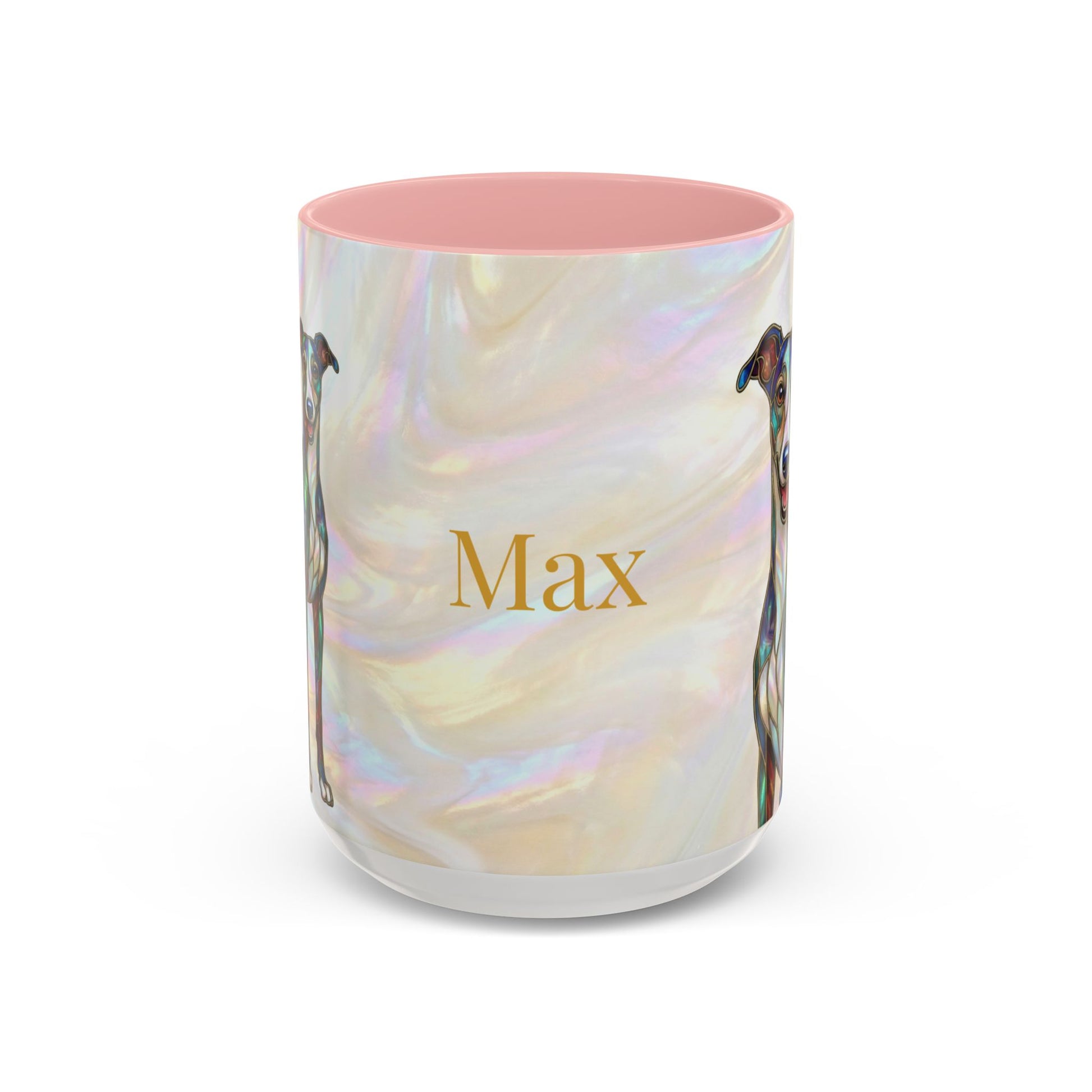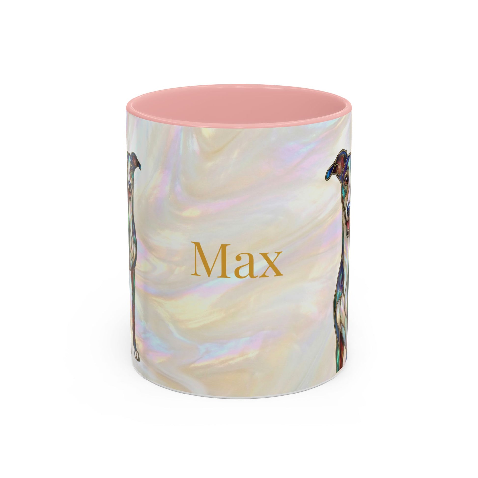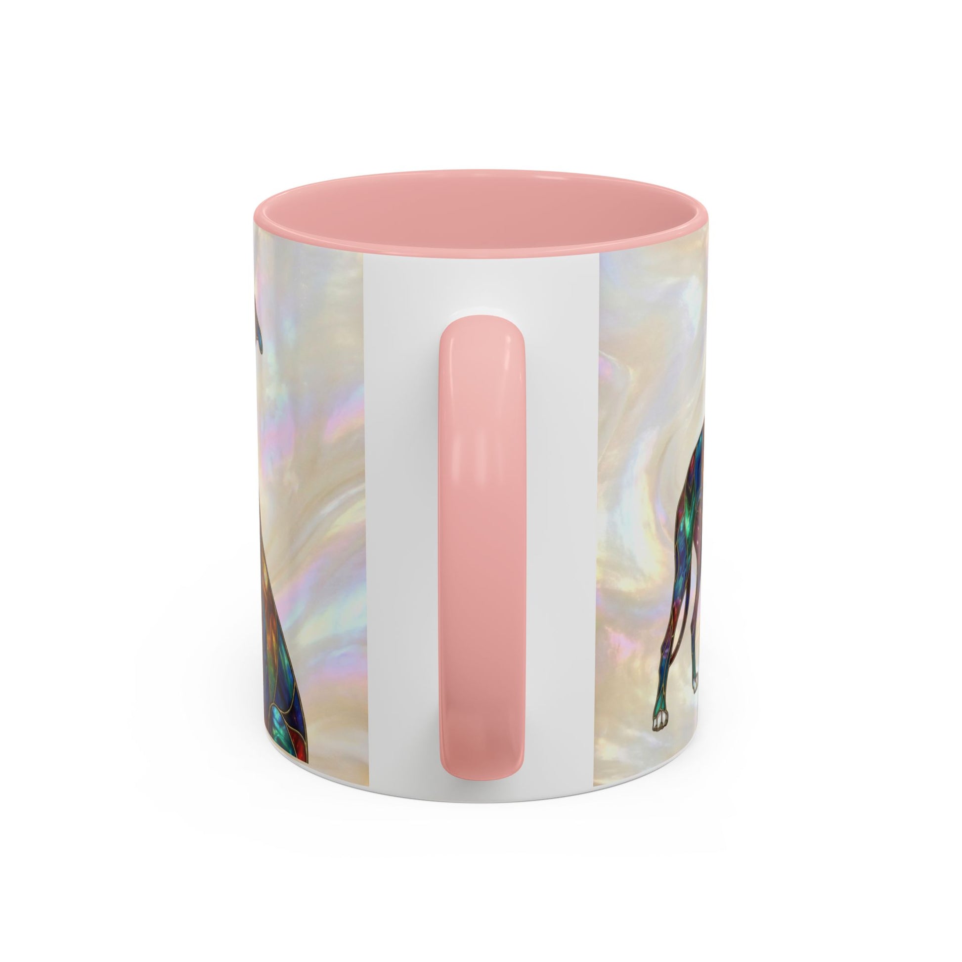 Warm mornings with a calm, artful presence. This ceramic coffee mug pairs a glossy, color-contrasting interior with a soft, pearlescent background and a graceful greyhound illustration. The design reads like a small stained-glass window — subtle shimmer, delicate linework, and a personalized name option that makes each sip feel quietly personal. It sits comfortably in hand thanks to a C-shaped handle and adds a gentle, thoughtful accent to a slow-start routine or a cozy catch-up over tea.
