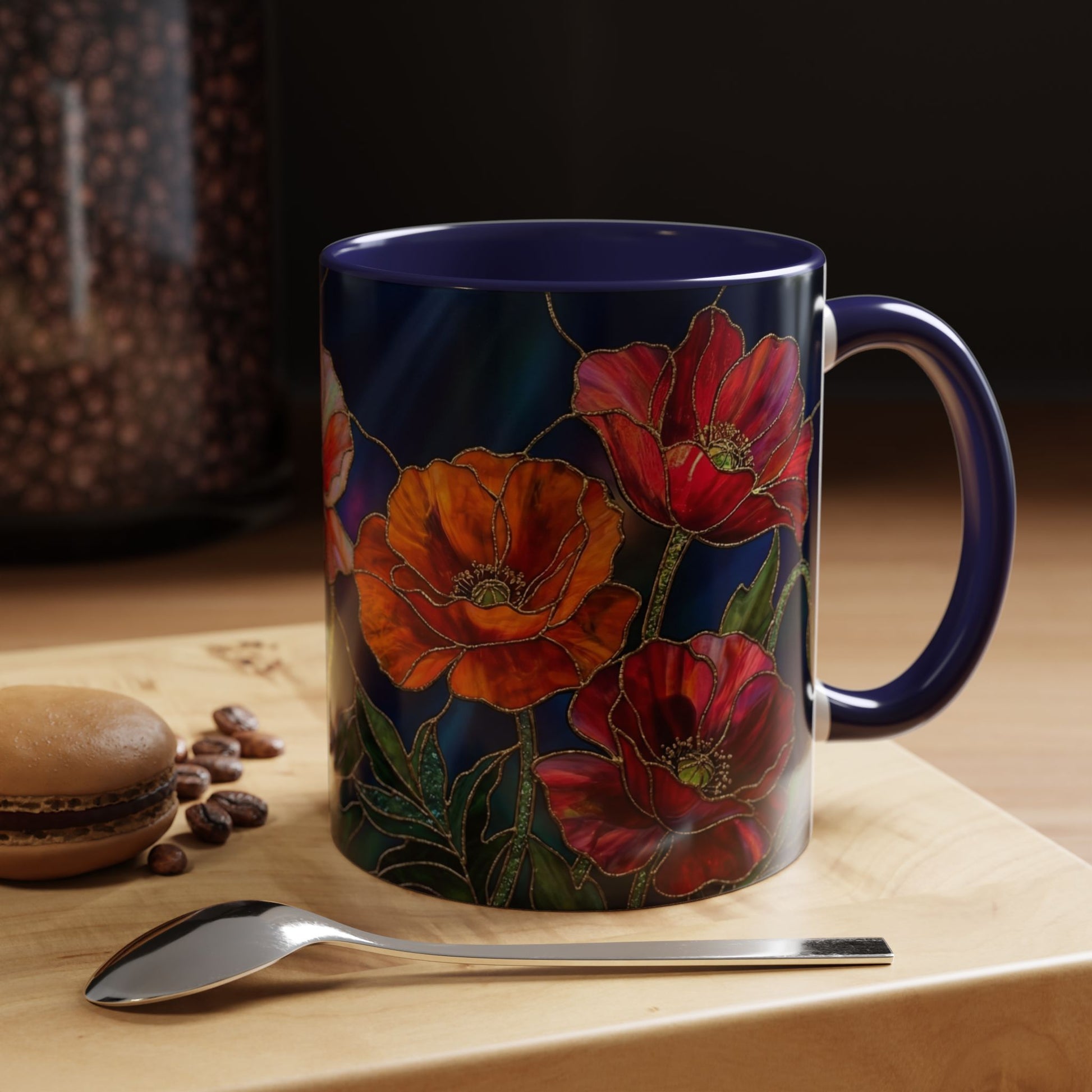 Bold, captivating, and full of meaning—the poppy shines beautifully in this luminous stained-glass floral mug. Each petal glows with rich reds, deep oranges, and golden outlines, creating a radiant mosaic effect that feels timeless and artistic. The dramatic contrast against the deep, midnight-toned background makes the poppies appear almost illuminated from within.