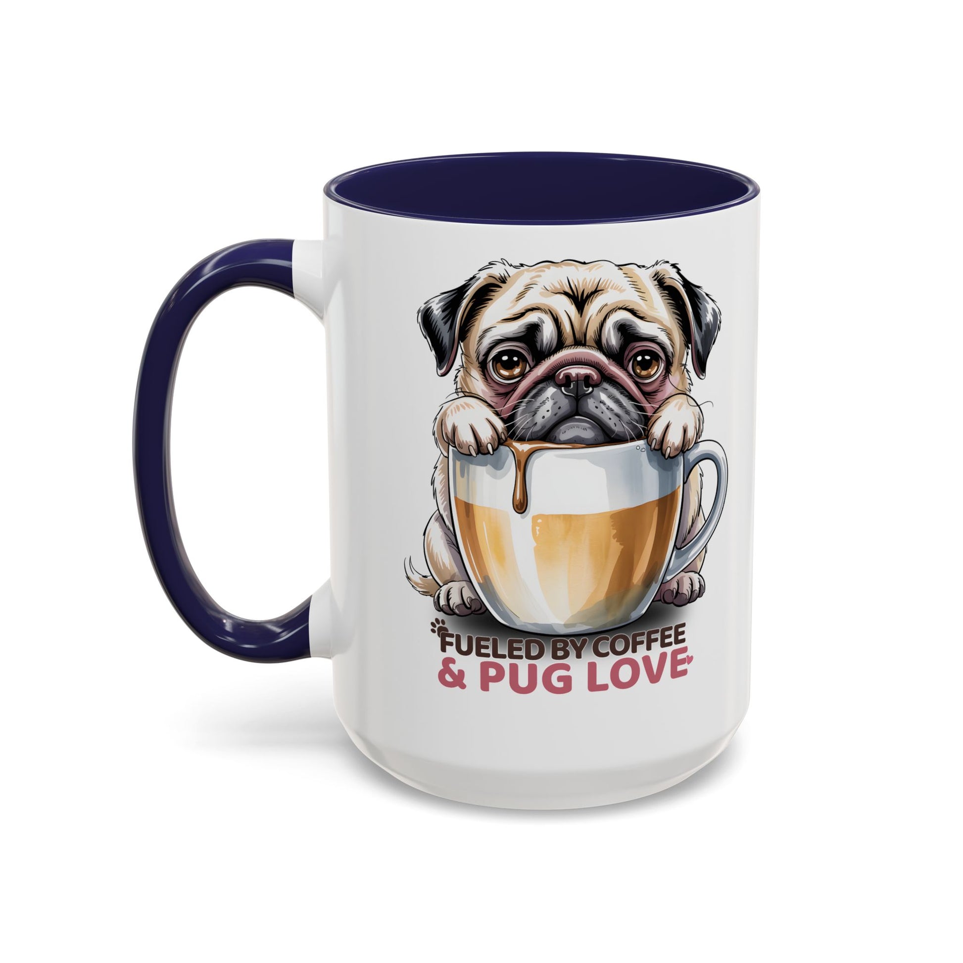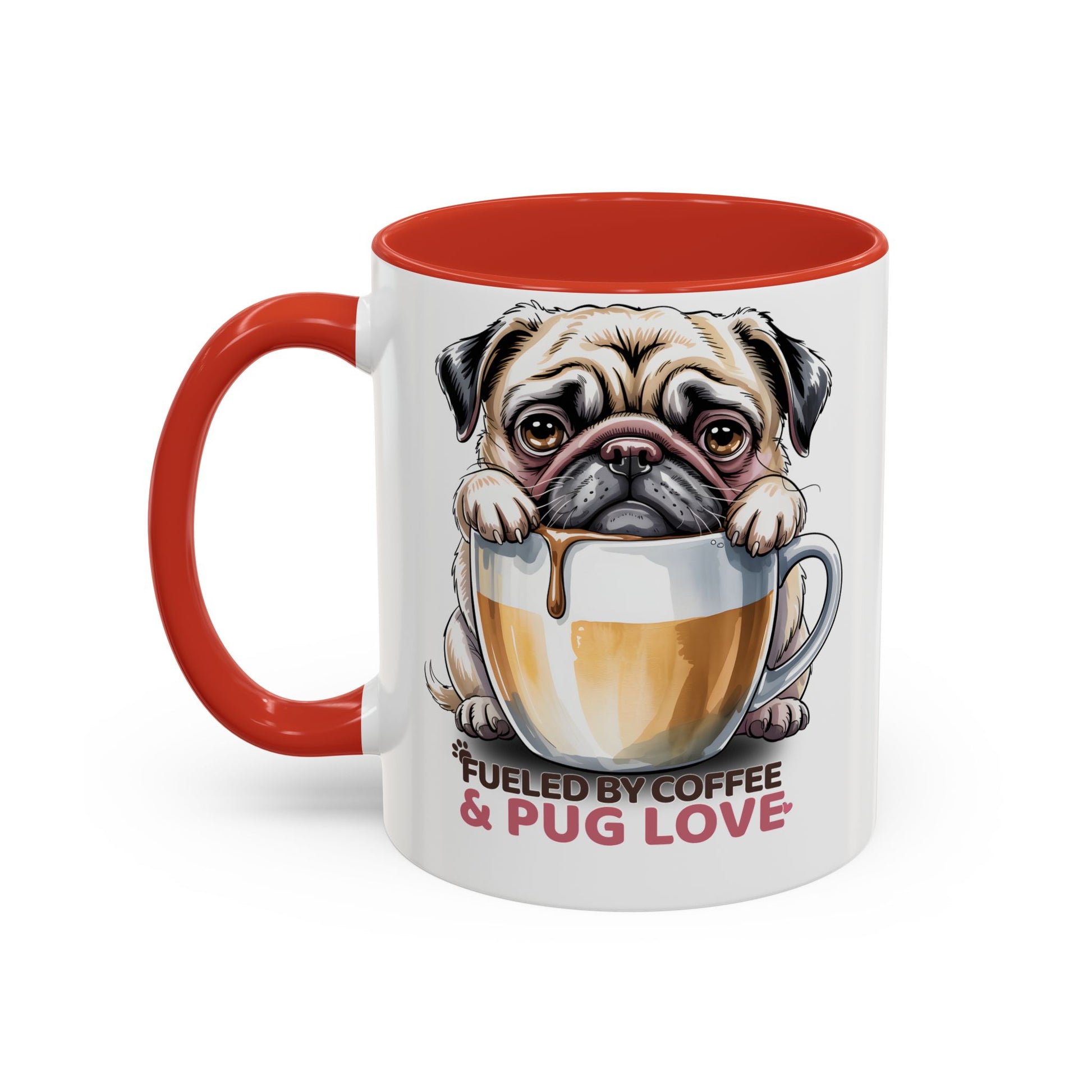 This ceramic accent mug brings a little warmth and humor to mornings. A wide-eyed pug peers over a frothy coffee cup, its soulful face and dripping foam capturing that slow, snuffling start-of-day vibe. The contrast of the colored interior and handle against the glossy white surface makes the illustration pop, while vibrant printing keeps the details crisp. It’s for people who treat coffee as ritual and dogs as family — a companion on kitchen counters, desk corners, and cozy reading nooks. The mug’s sturdy C-handle and available 11oz or 15oz sizes fit different routines: a quick espresso lift or a slow, lingering pour-over. Use it during early commutes, weekend slow mornings, dog-walking breaks, or casual get-togethers where good conversation (and pug stories) flow.
