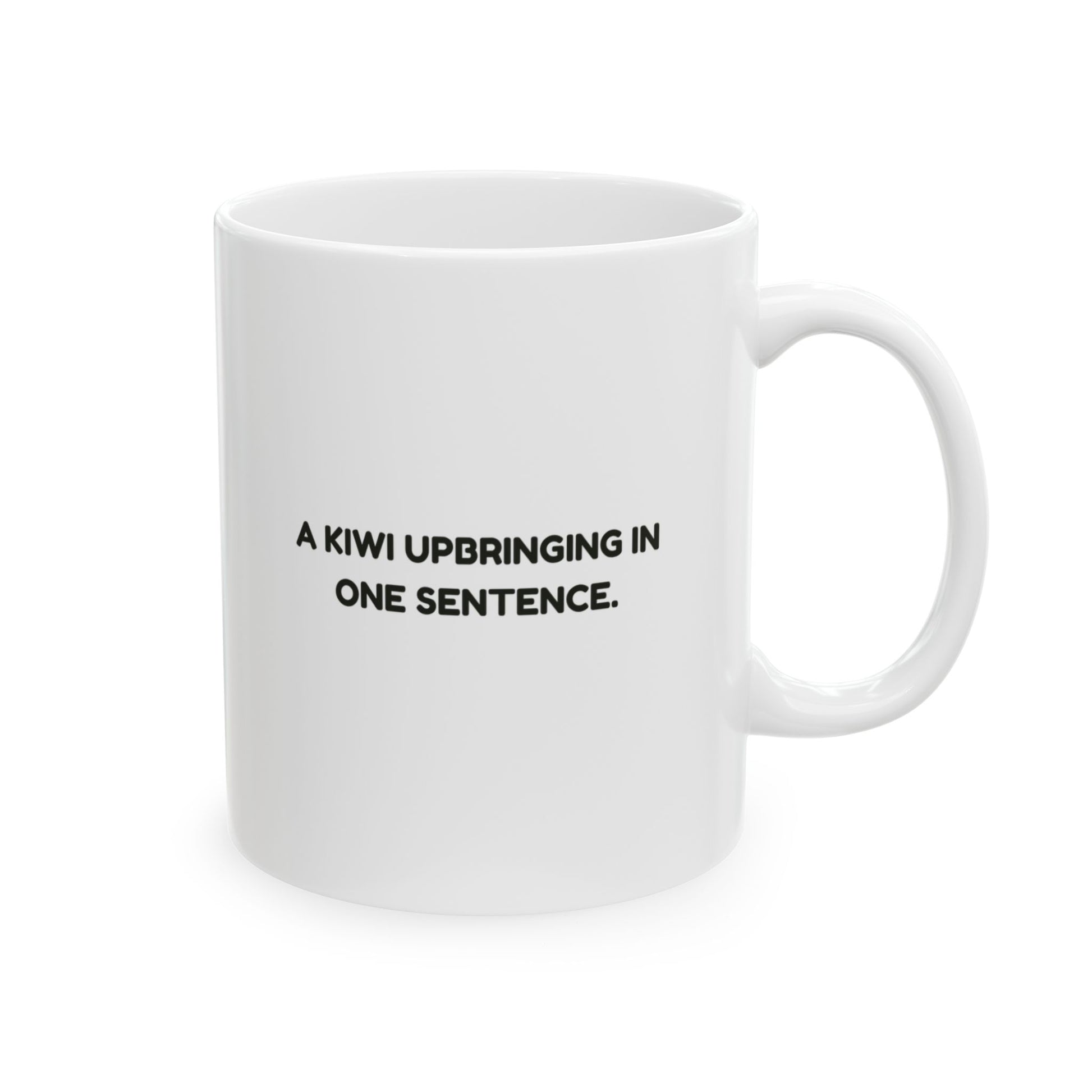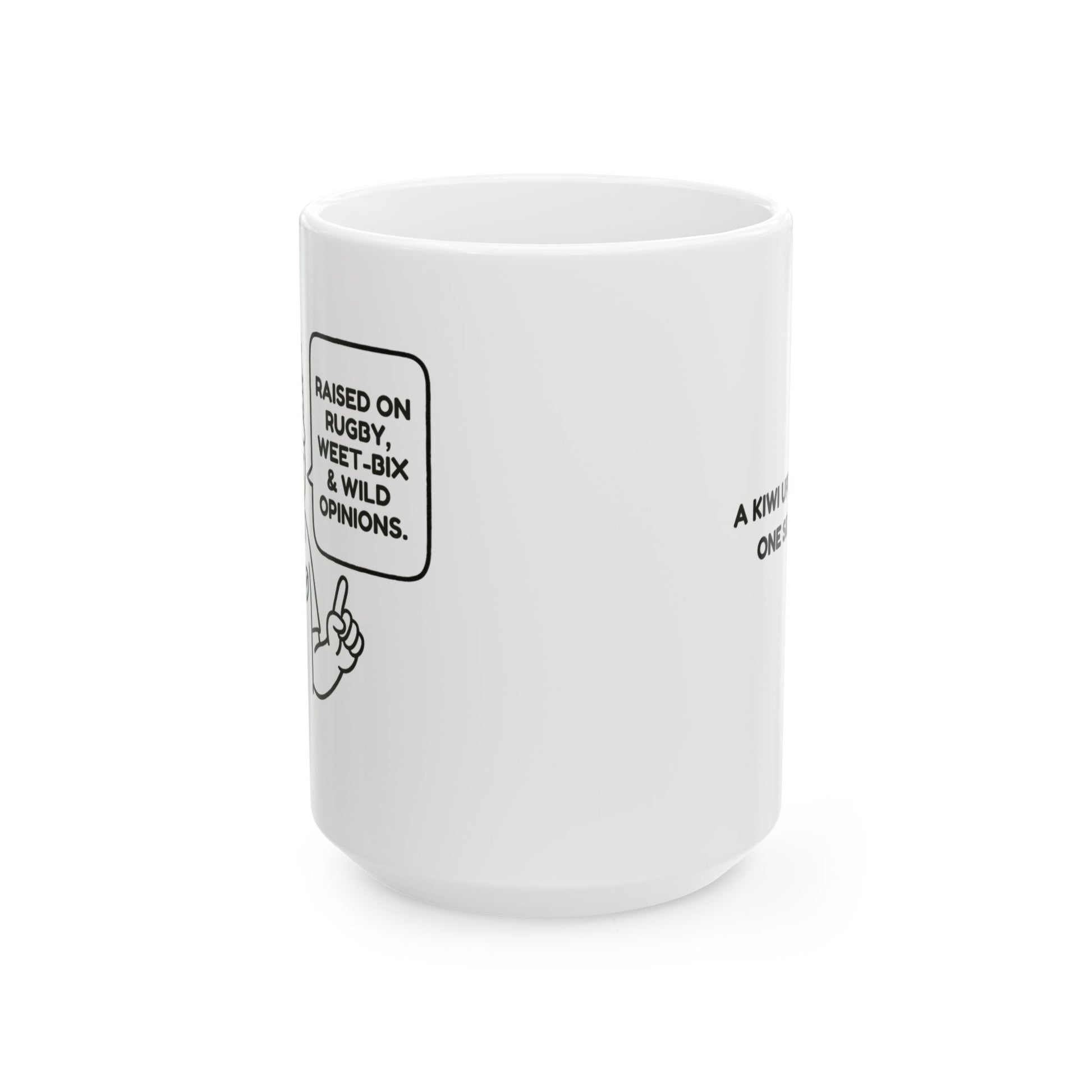 “Raised on rugby, Weet-Bix & wild opinions.” (A Kiwi upbringing in one sentence.) Ceramic Mug, 11oz or 15oz - 13949