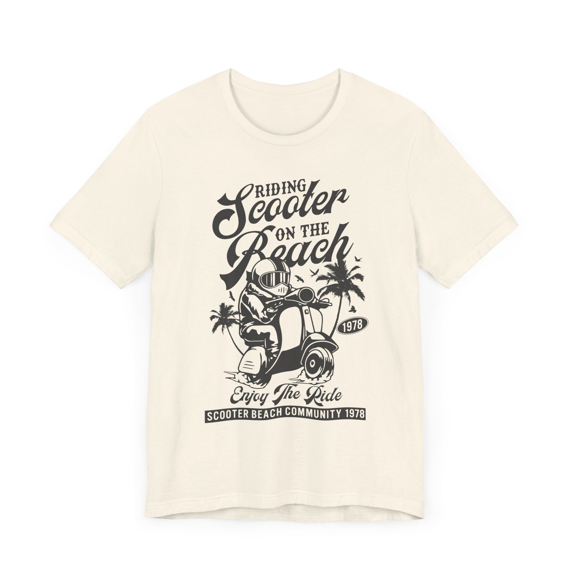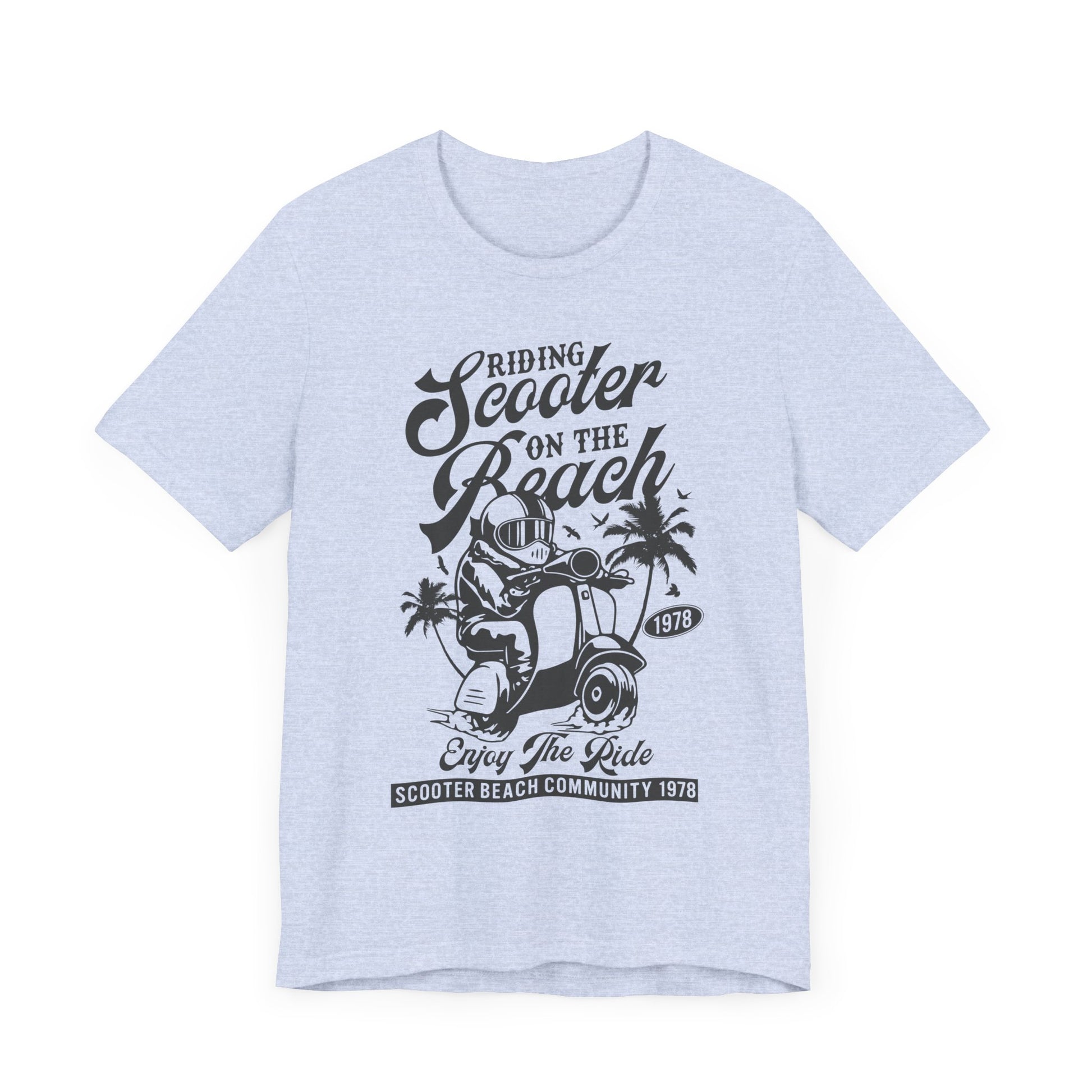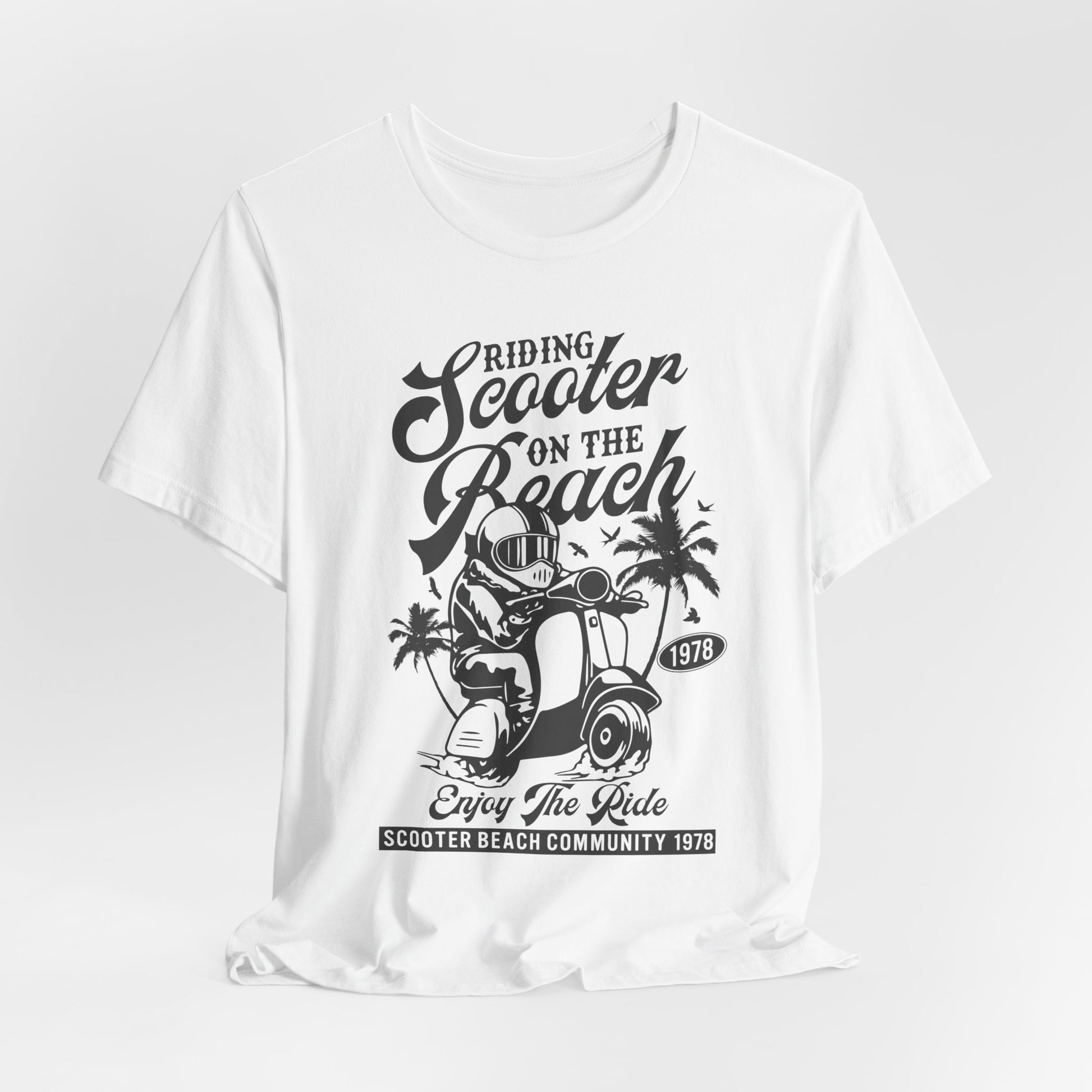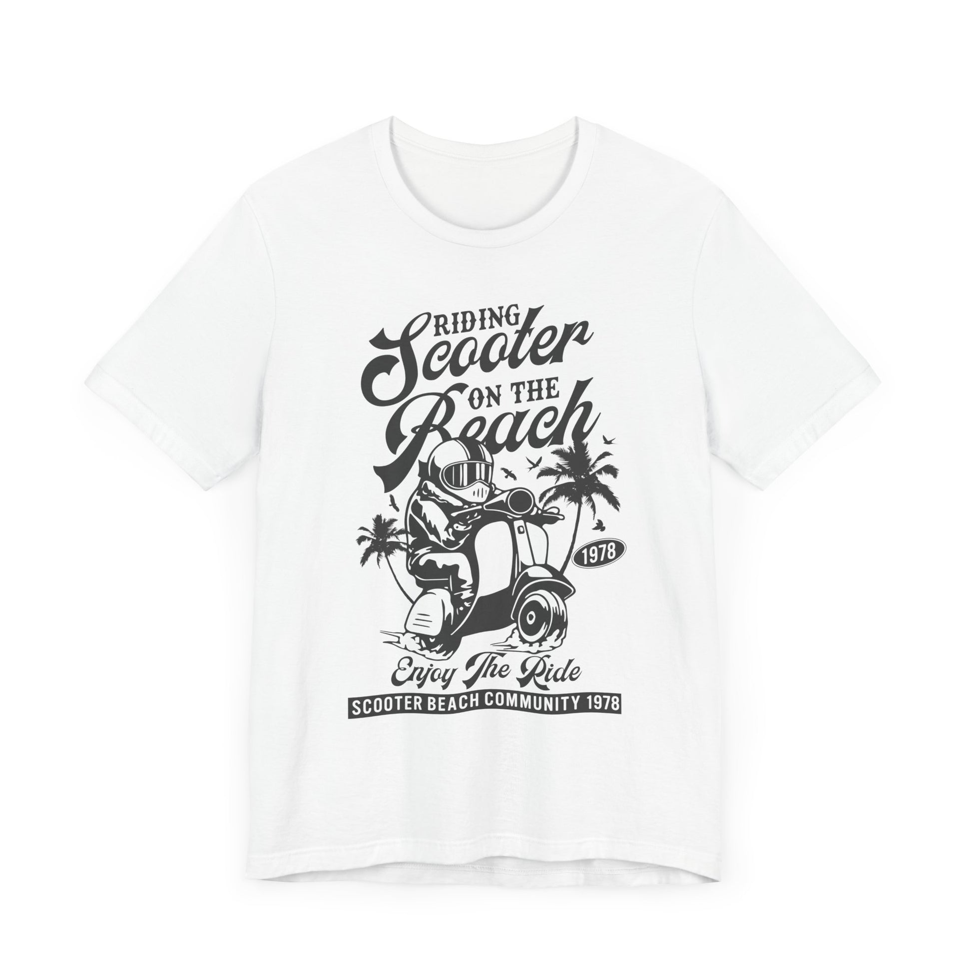 Ride into relaxation with our "Riding Scooter on the Beach" tee. Order yours today and let the good vibes roll!