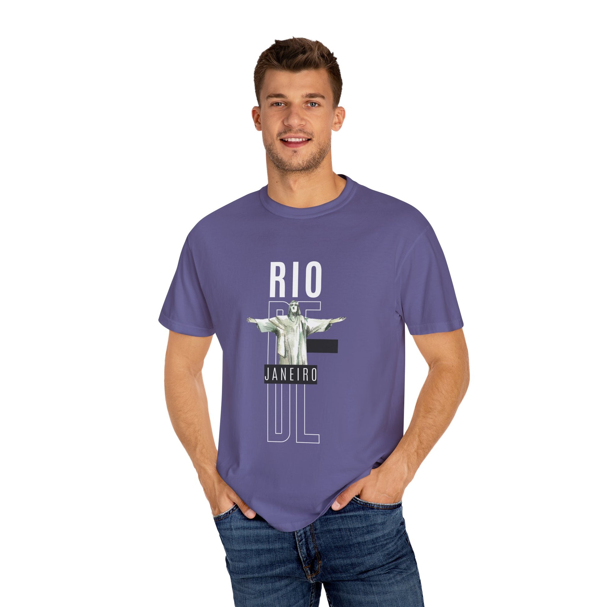 Embrace the vibrant energy of Rio de Janeiro with this stylish garment-dyed t-shirt. Inspired by the city’s stunning beaches, lively streets, and breathtaking skyline, this tee is perfect for those who love adventure, culture, and coastal vibes. Whether you're strolling along Copacabana, enjoying a sunset at Sugarloaf Mountain, or just relaxing in casual comfort, this tee brings a piece of Rio to your wardrobe.