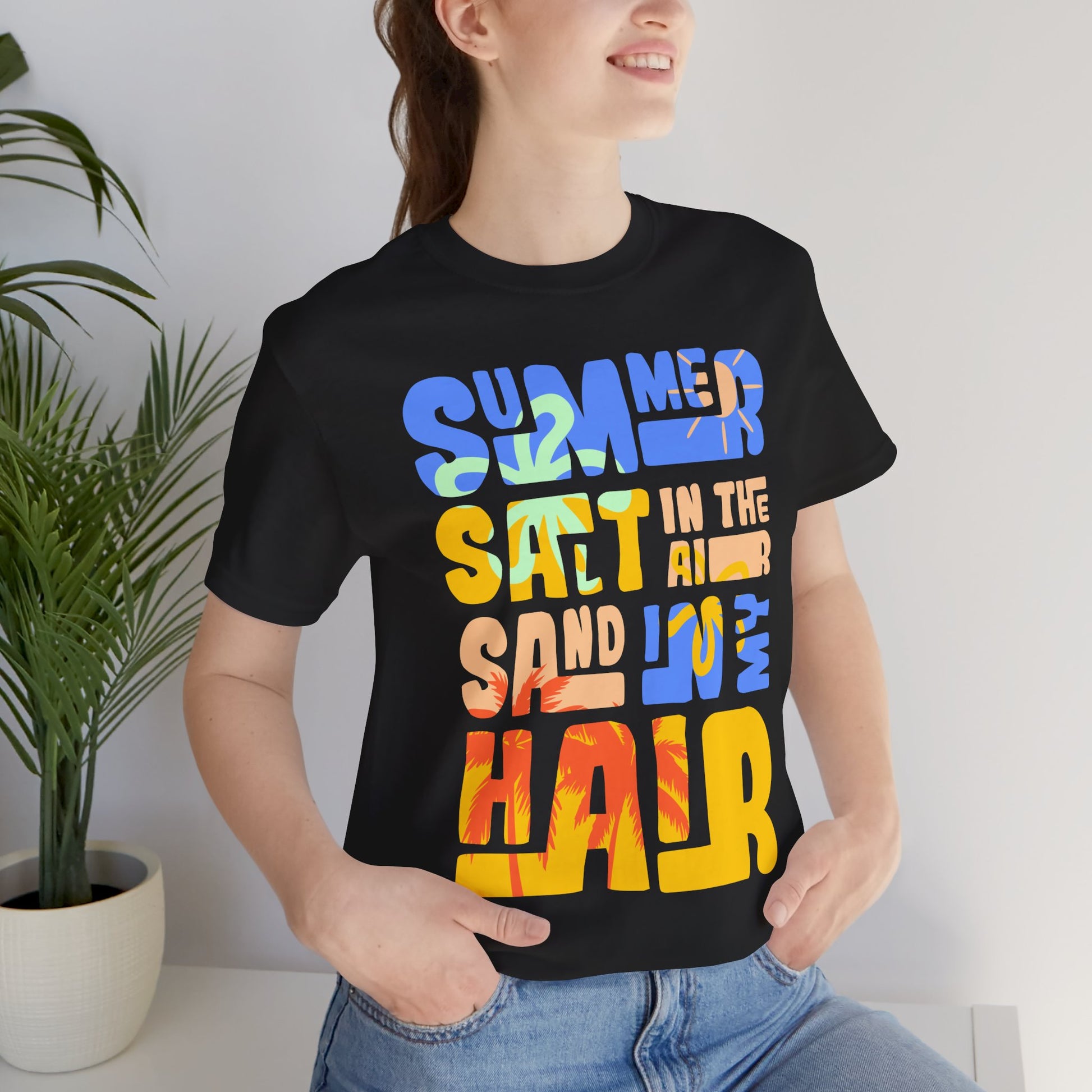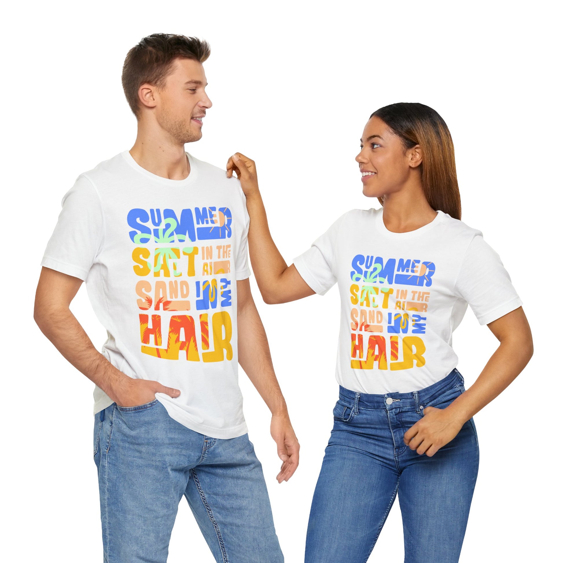Celebrate the essence of summer with our "Salt In The Air, Sand In My Hair" Unisex Jersey Short Sleeve Tee. Perfect for those who live for beach days and ocean breezes, this tee captures the carefree spirit of the season. Crafted from soft, premium fabric, it ensures maximum comfort whether you're soaking up the sun or strolling along the shore.