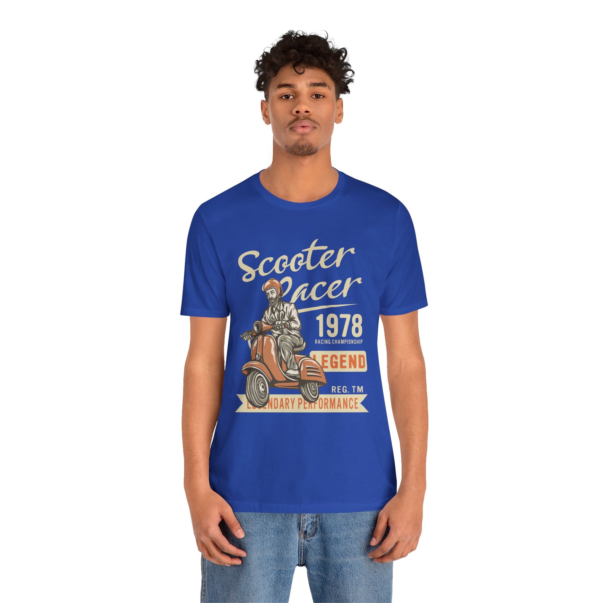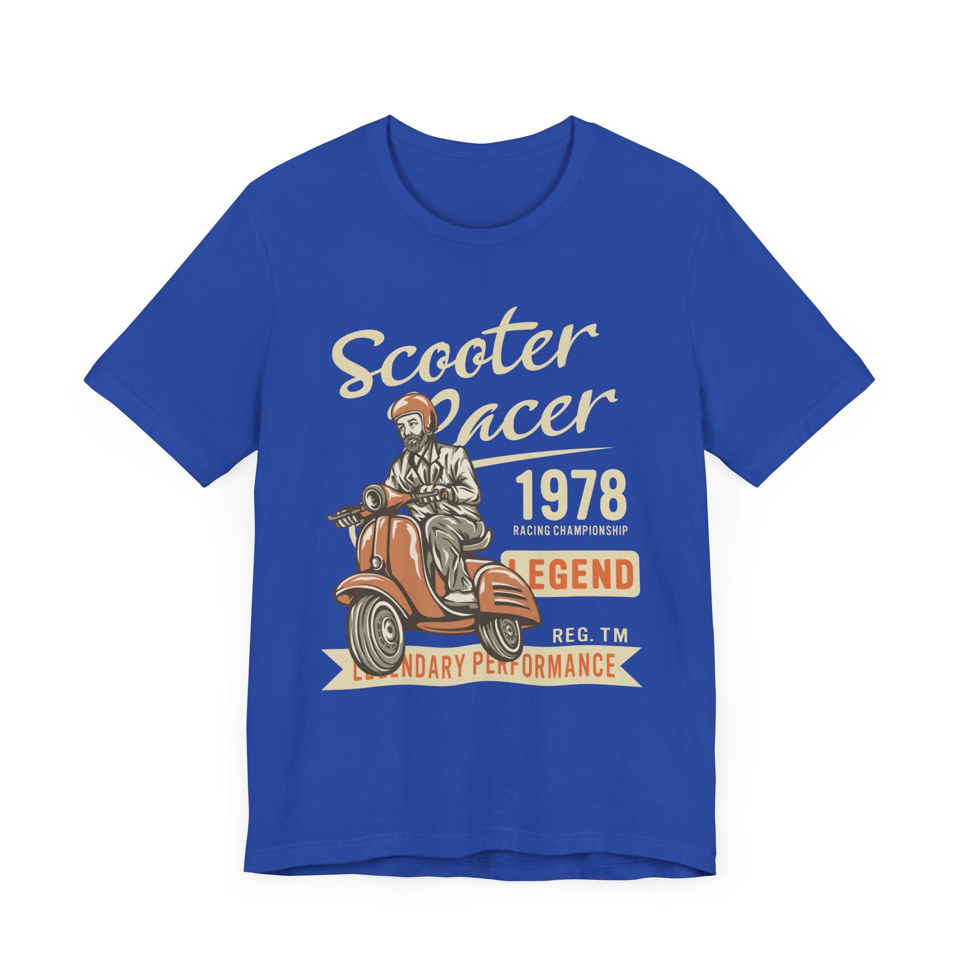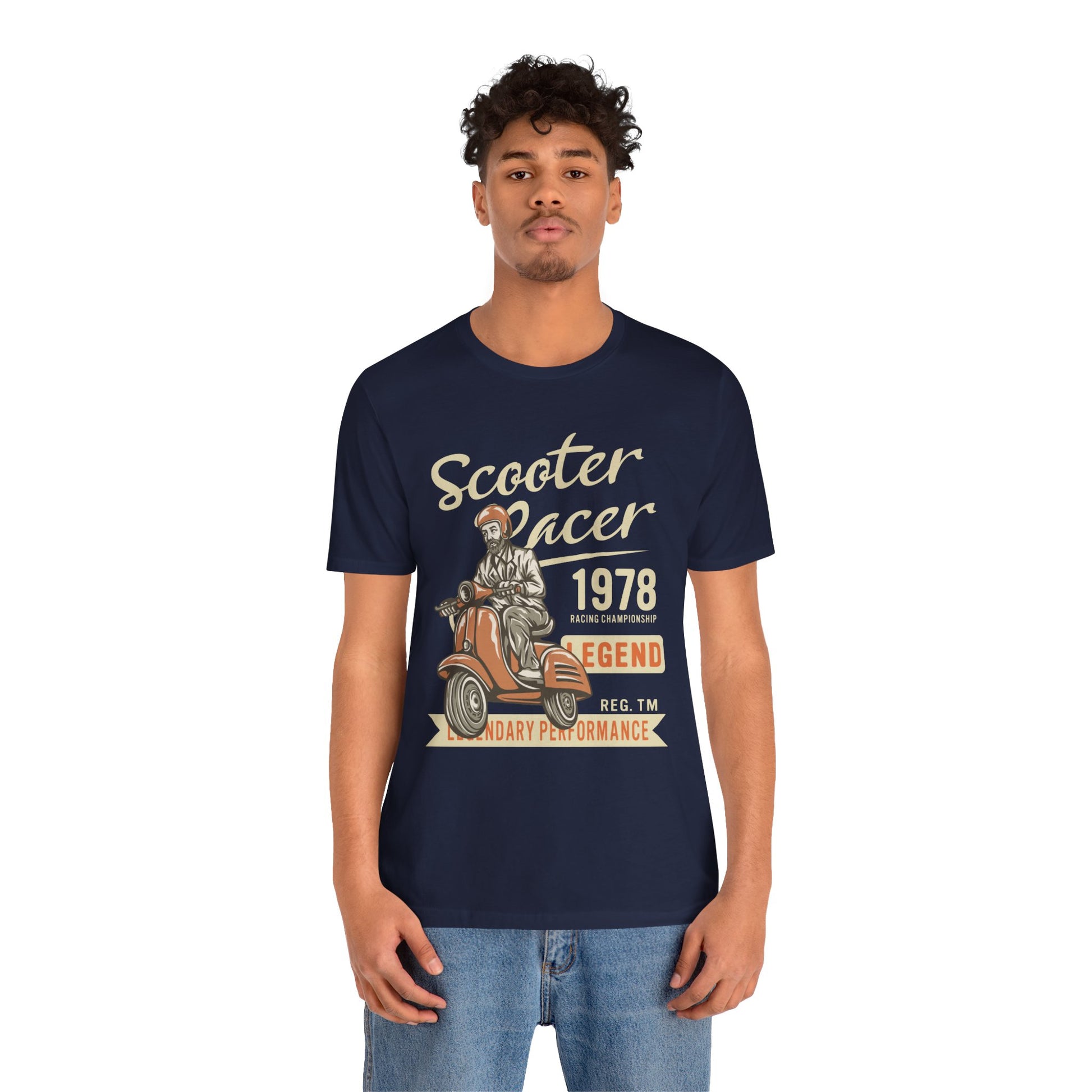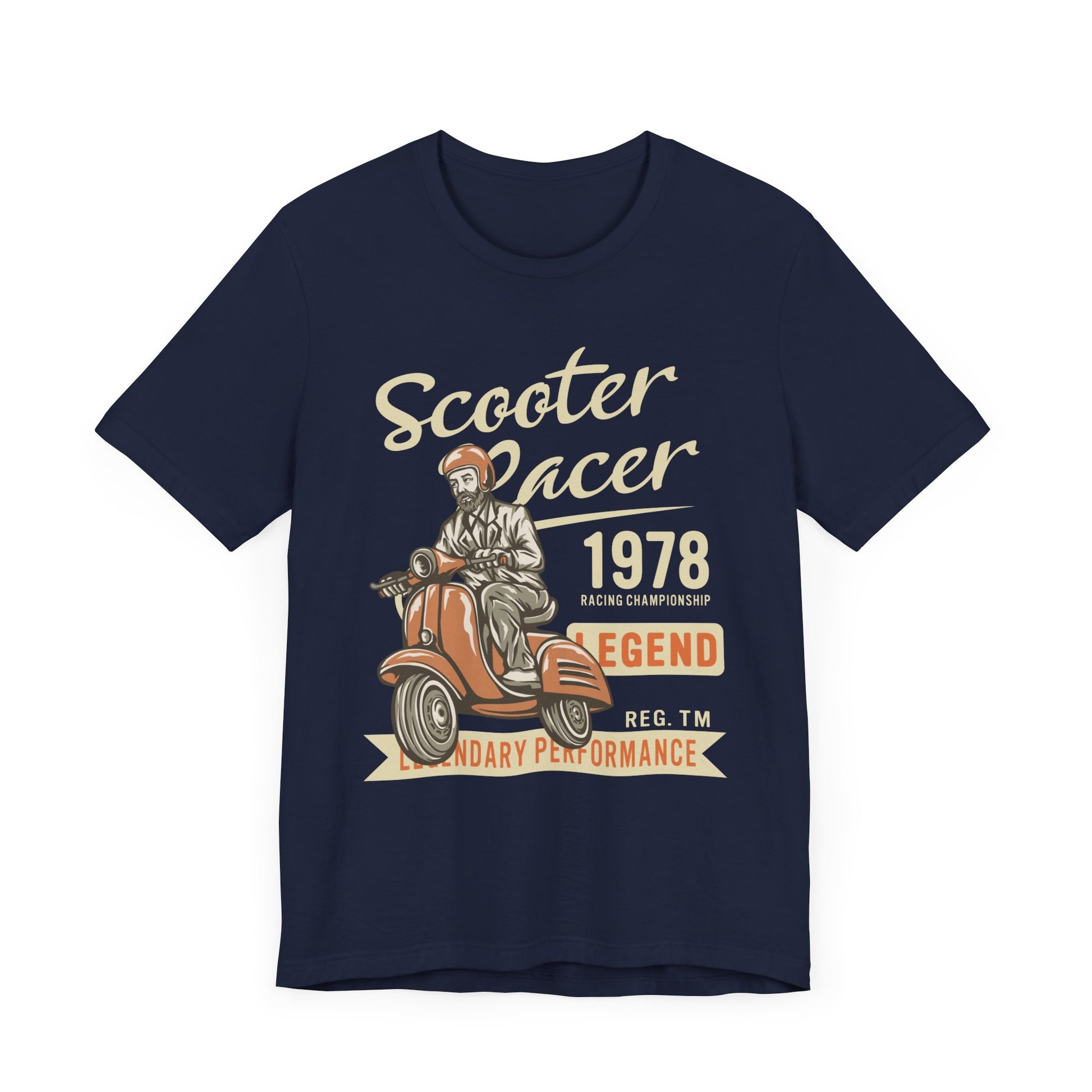 - Bold Scooter Racer Graphic: Showcasing a sleek and energetic scooter racer design, this tee captures the fast-paced, fun-loving spirit of scooter culture, making it an ideal addition to any rider's wardrobe.