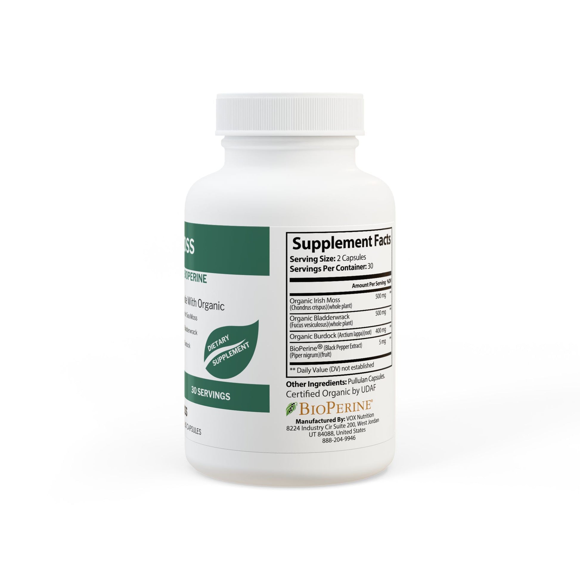 Ingredients: Organic Irish Moss (Chondrus crispus)(whole plant), Organic Burdock (Arctium lappa)(root), Organic Bladderwrack (Fucus vesiculosus)(whole plant), BioPerine® (Black Pepper Extract), (Piper nigrum)(fruit). Other Ingredients: Pullulan Capsules.