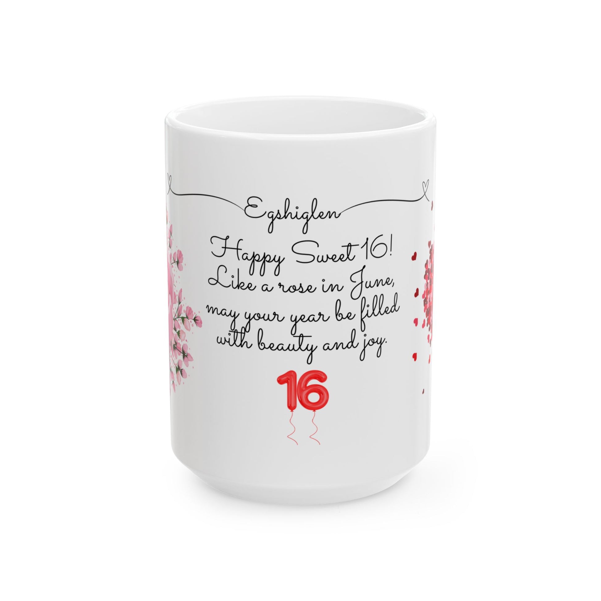 Celebrate a Sweet 16 birthday with style and personalization with the "Sweet 16, June, Roses" Customized Ceramic Mug. Order yours today and make her milestone birthday even more special!