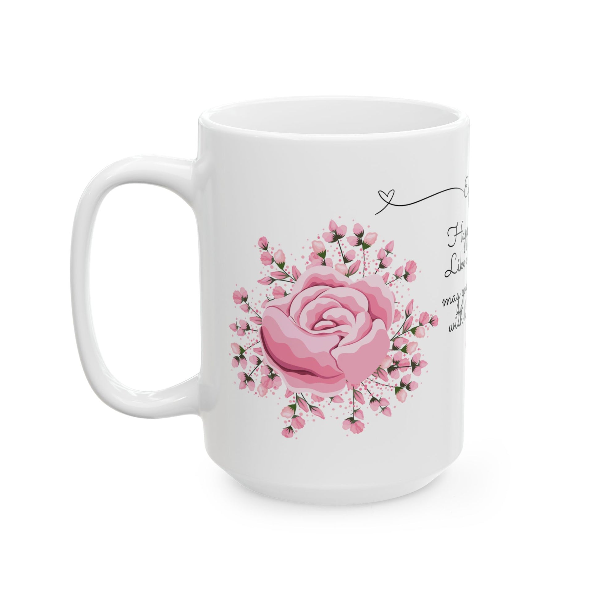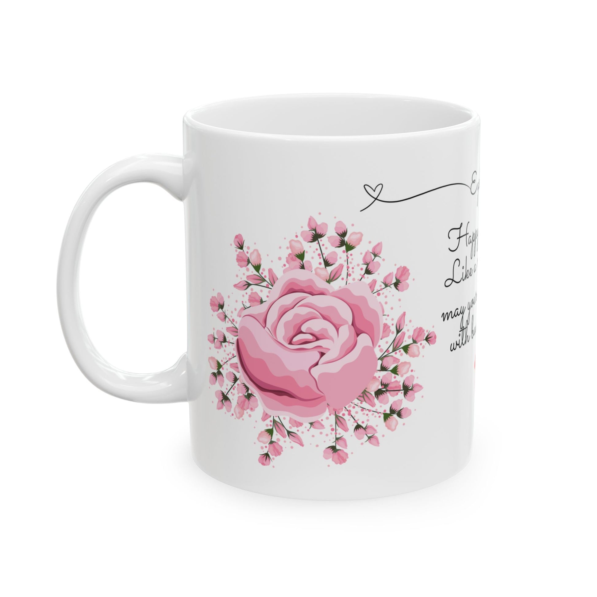 - Design: White mug with vibrant June roses graphic