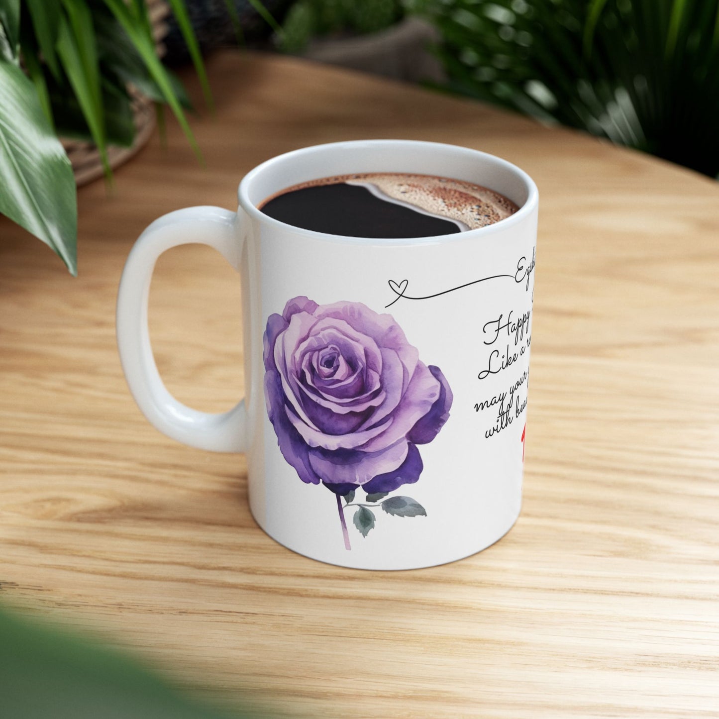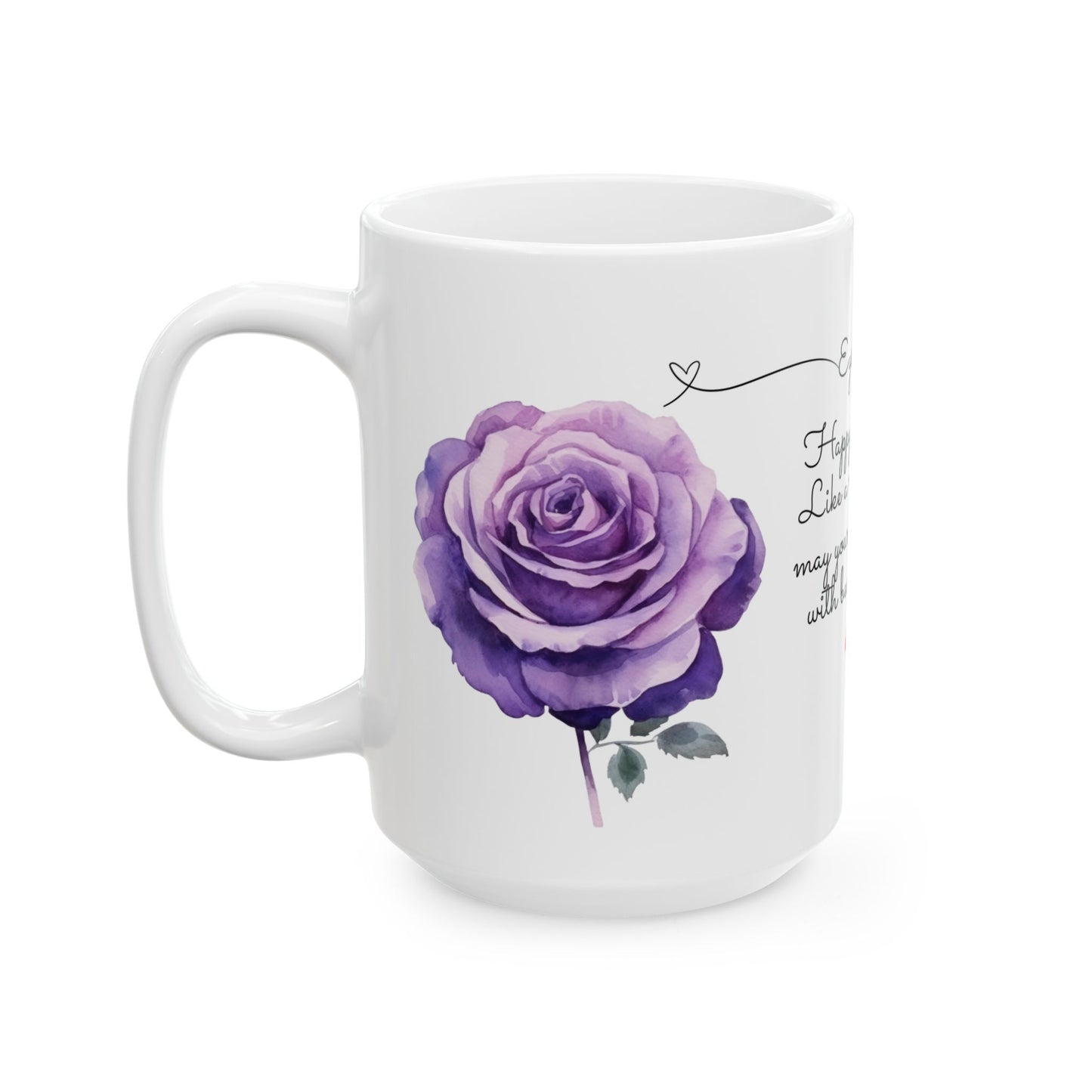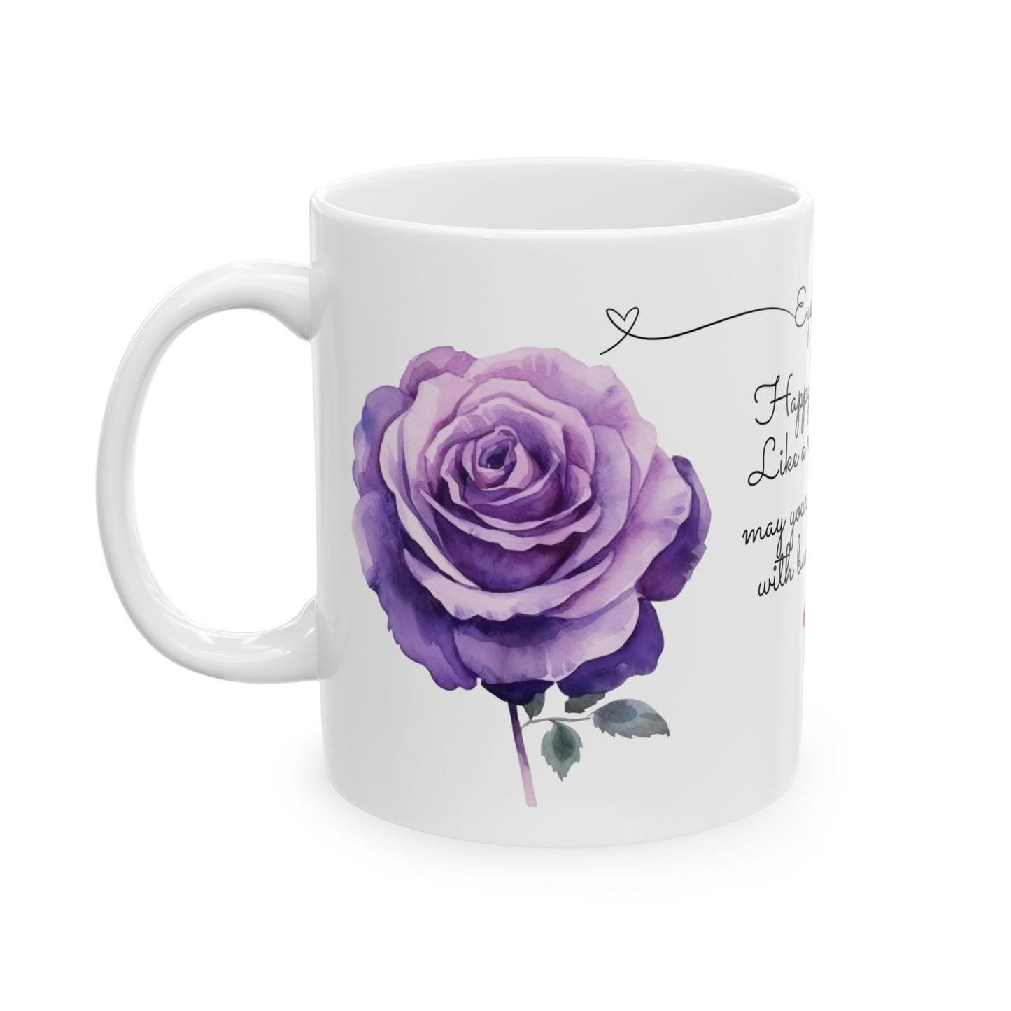 - Design: White mug with vibrant June roses graphic