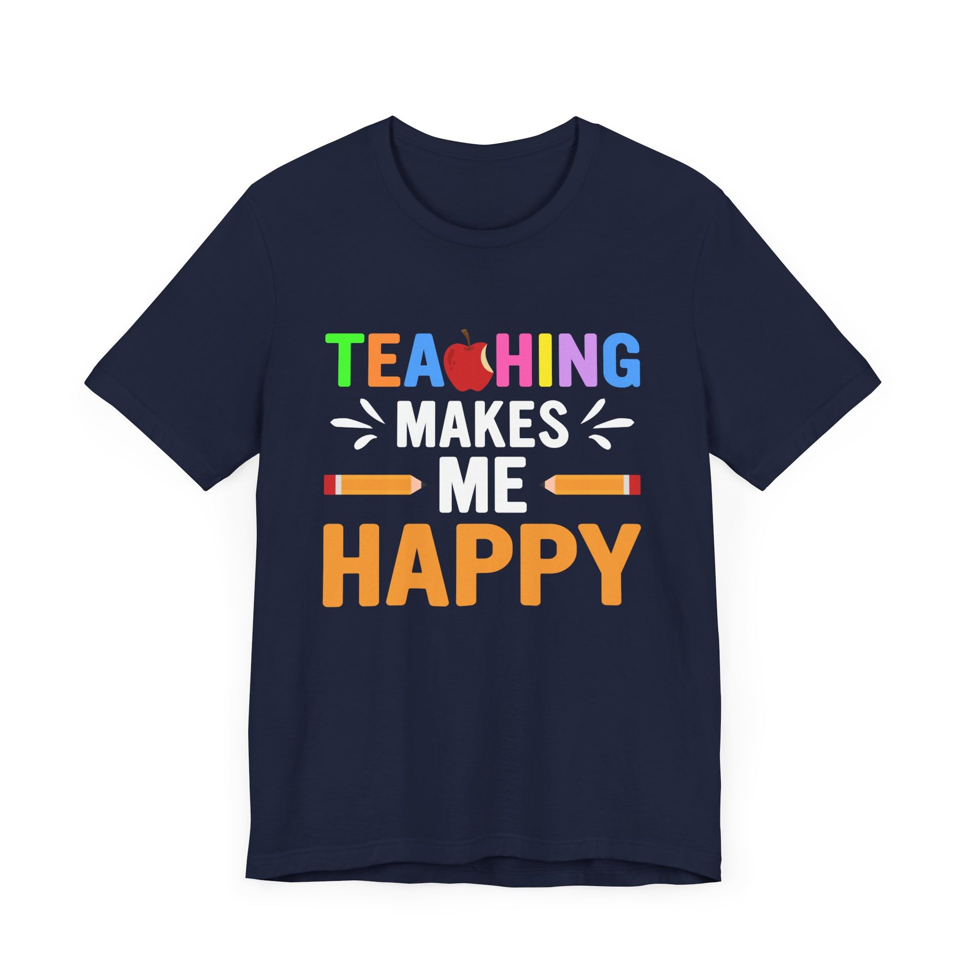 - Joyful Design: Featuring the uplifting phrase "Teaching Makes Me Happy," this tee highlights the genuine pleasure and satisfaction that comes from educating and inspiring students.