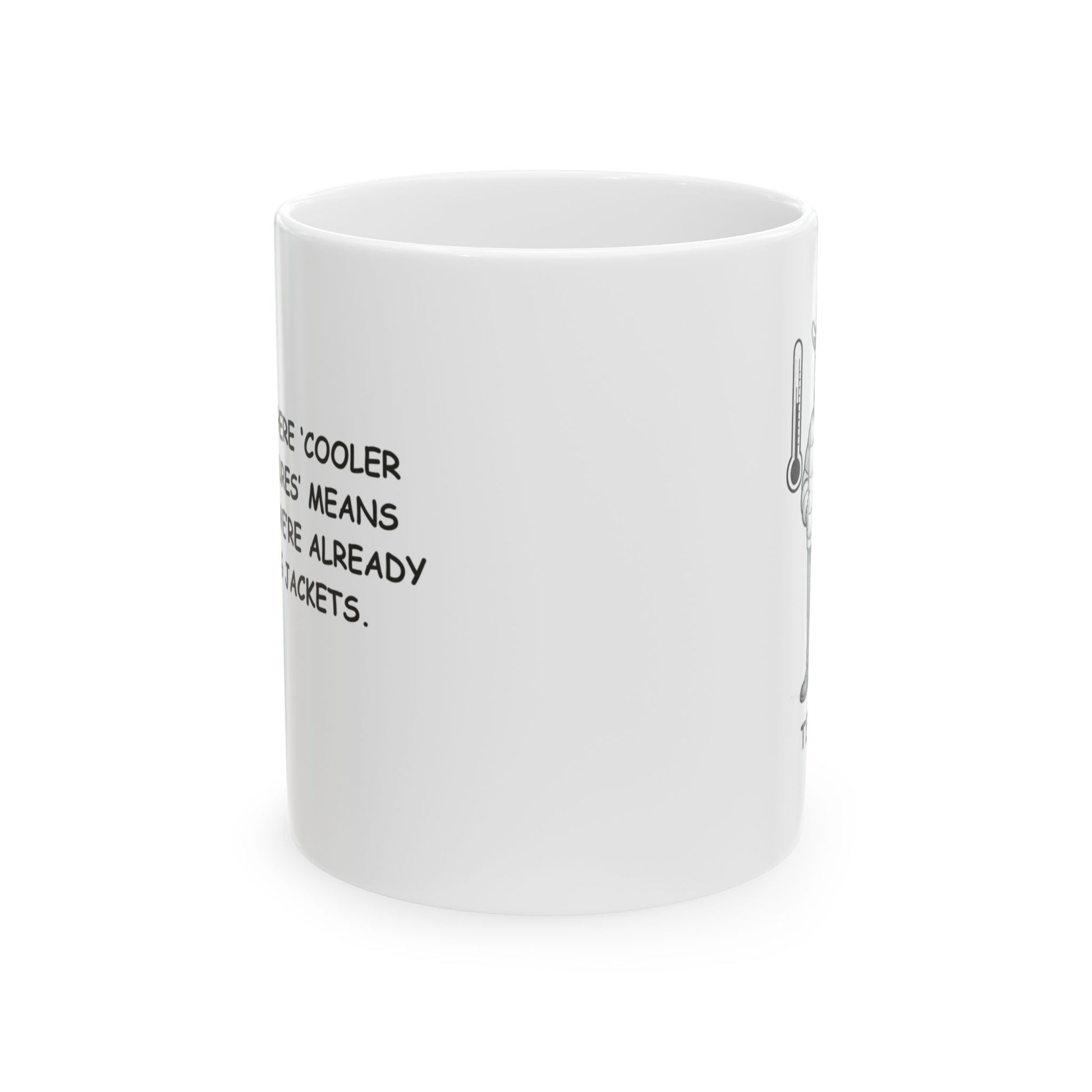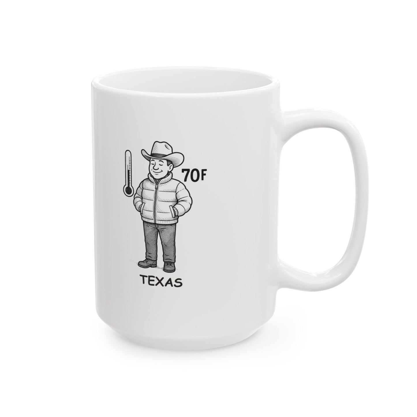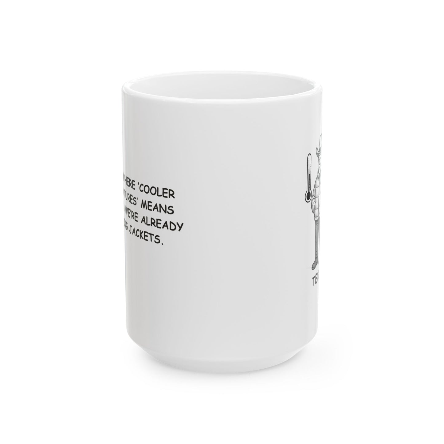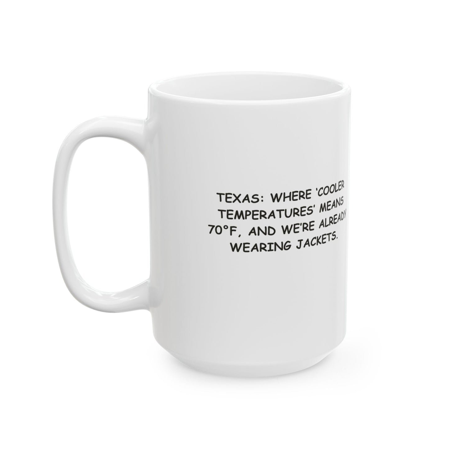 "Texas: Where ‘cooler temperatures’ means 70°F, and we’re already wearing jackets." Ceramic Mug | 11oz & 15oz - 12673