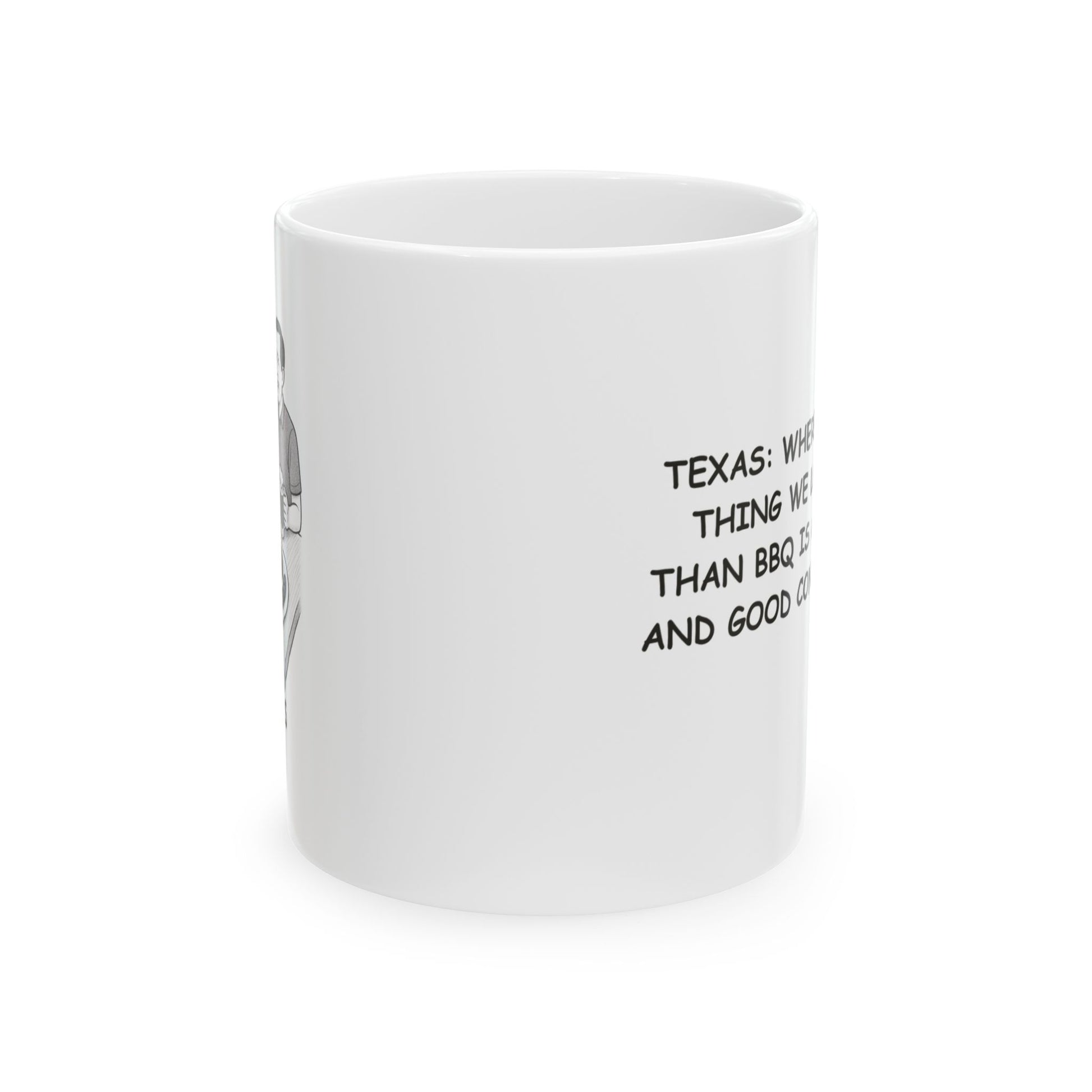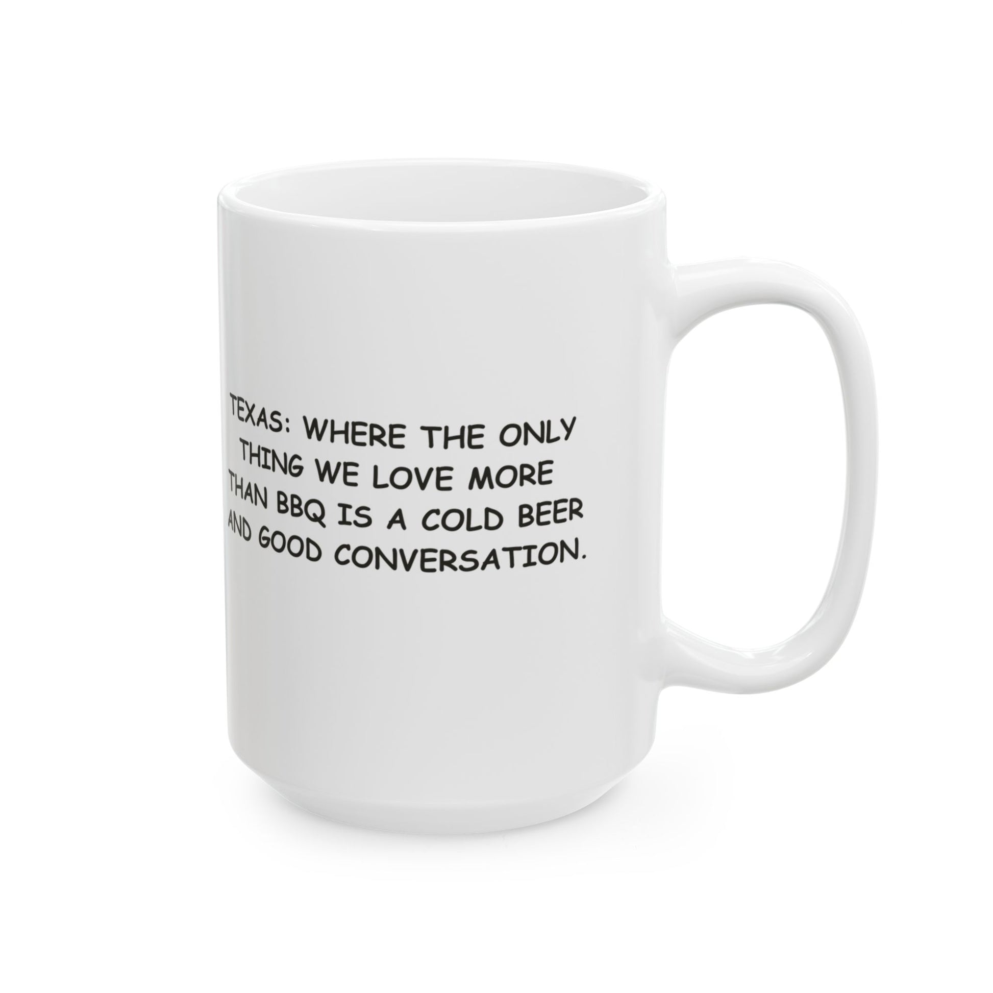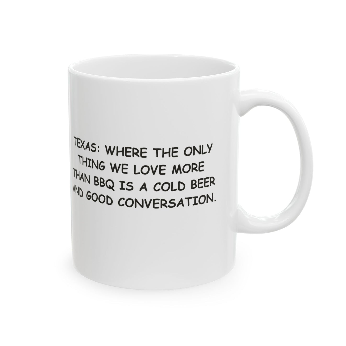 "Texas: Where the only thing we love more than BBQ is a cold beer and good conversation." Ceramic Mug - 12749