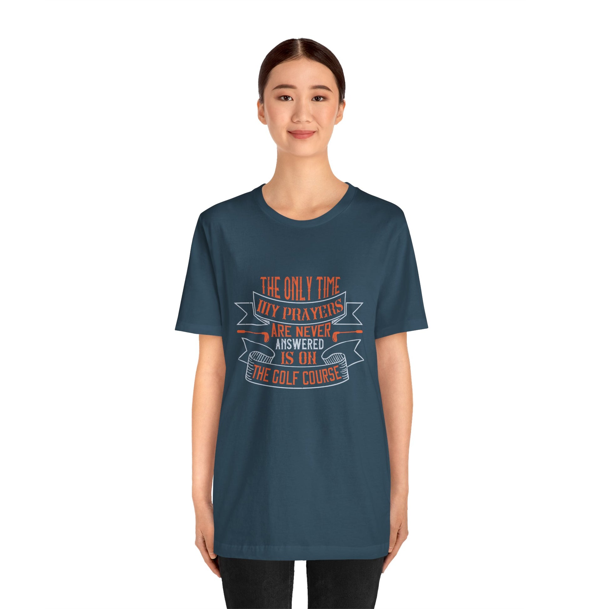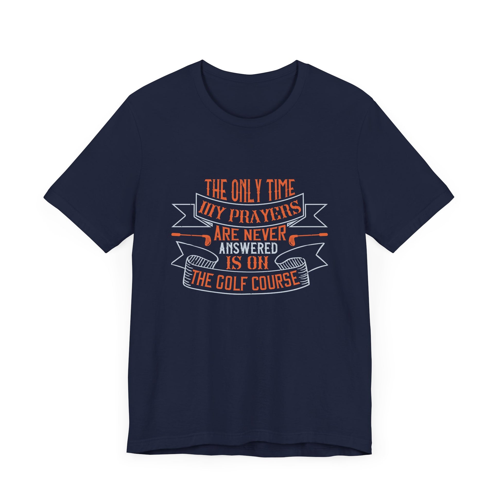 Golf can be a game of high hopes and unpredictable outcomes. This Unisex Jersey Short Sleeve Tee features the humorous quote, "The Only Time My Prayers Are Never Answered Is on the Golf Course," capturing the frustration and fun of the game when things don’t go as planned.