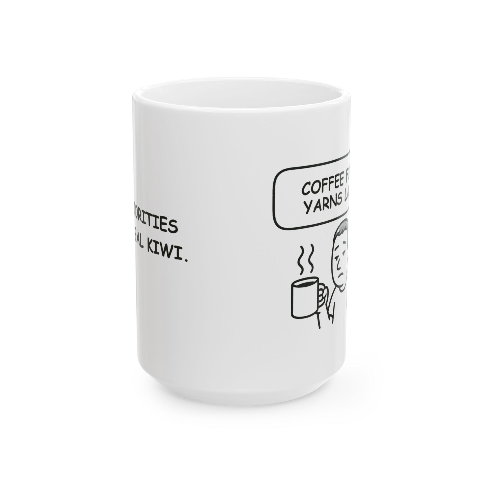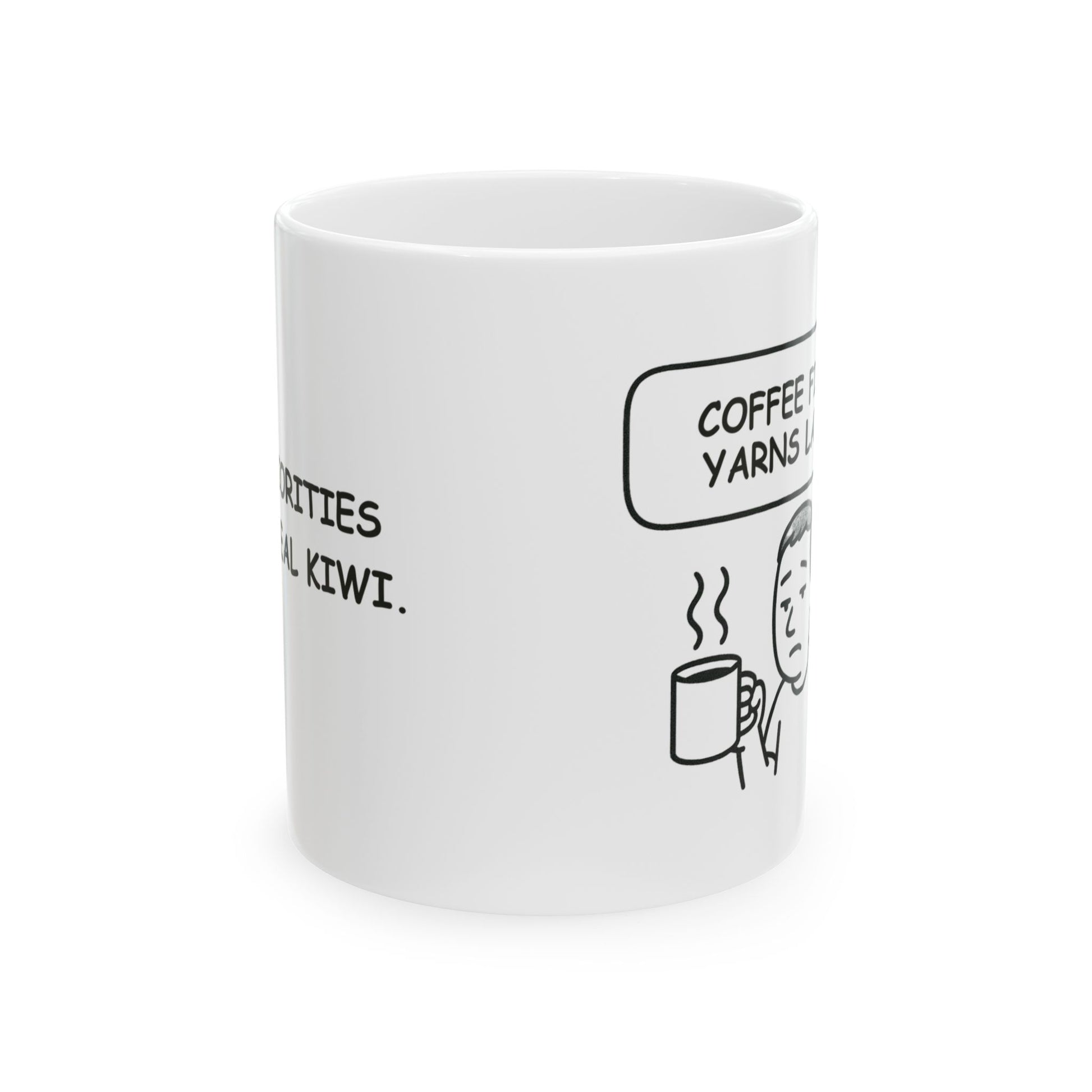 Start your day the right way—with coffee! Featuring the playful saying, "Coffee First, Yarns Later," this ceramic mug is the perfect companion for those mornings when you need your caffeine fix before diving into conversation. Whether you’re enjoying your first cup or taking a well-deserved break, this mug is ideal for sipping on your favorite brew in style.