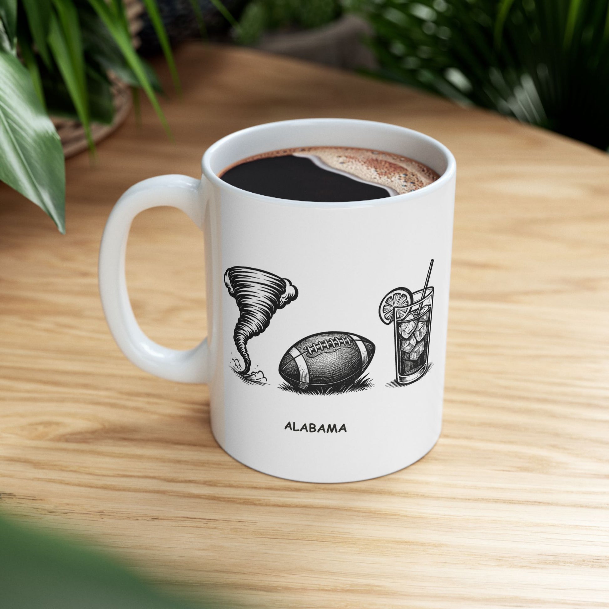 Embrace the heart of Alabama with this 'Tornadoes, football, and sweet tea... that’s Alabama' ceramic mug. Featuring a perfect blend of Alabama's unpredictable weather, love for football, and passion for sweet tea, this mug captures the essence of Southern life. Available in 11oz and 15oz sizes, it’s perfect for sipping your favorite drink while celebrating the true spirit of Alabama.