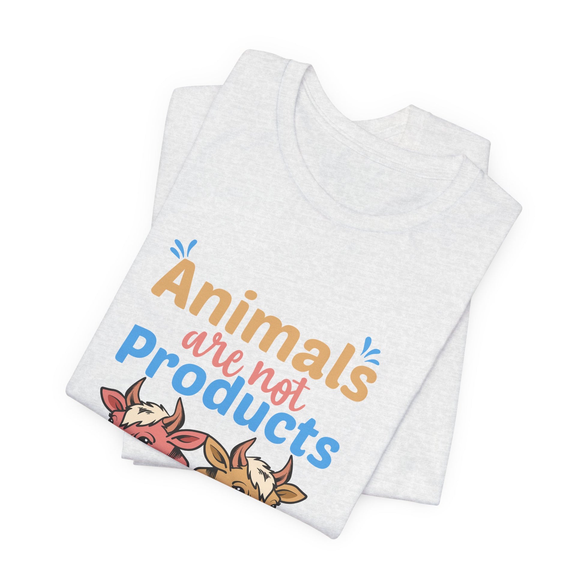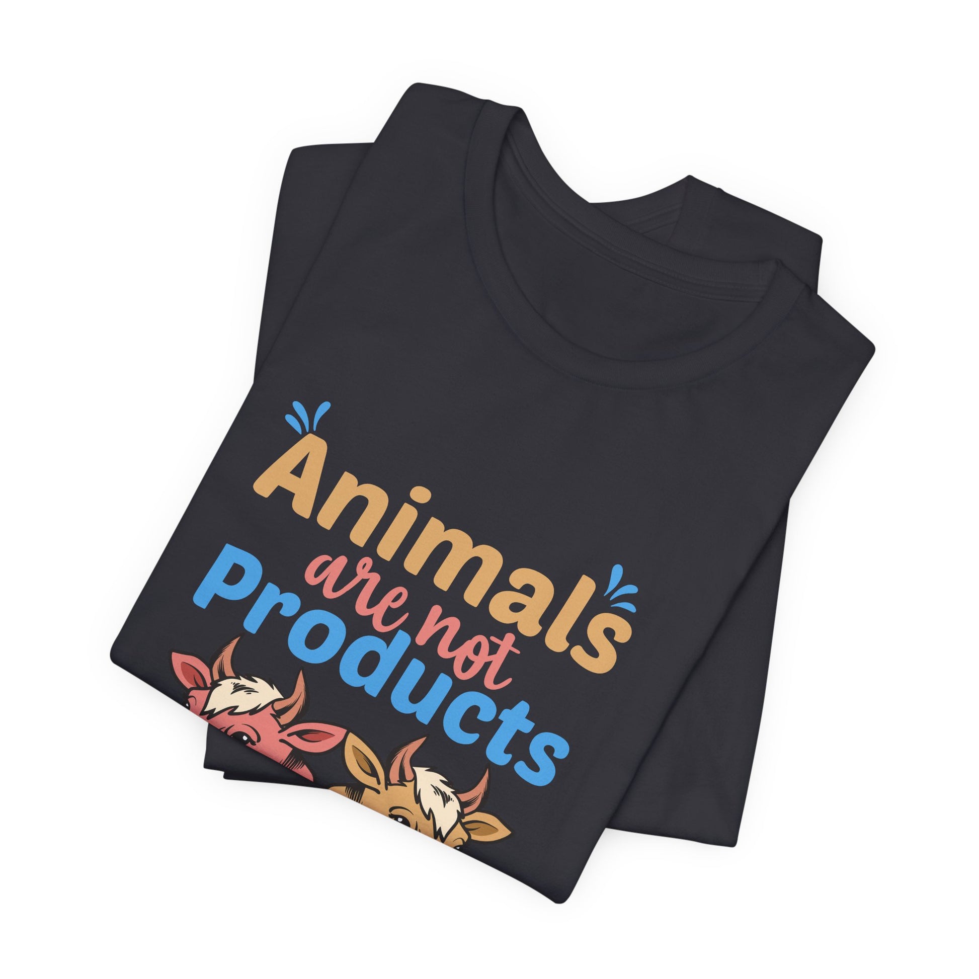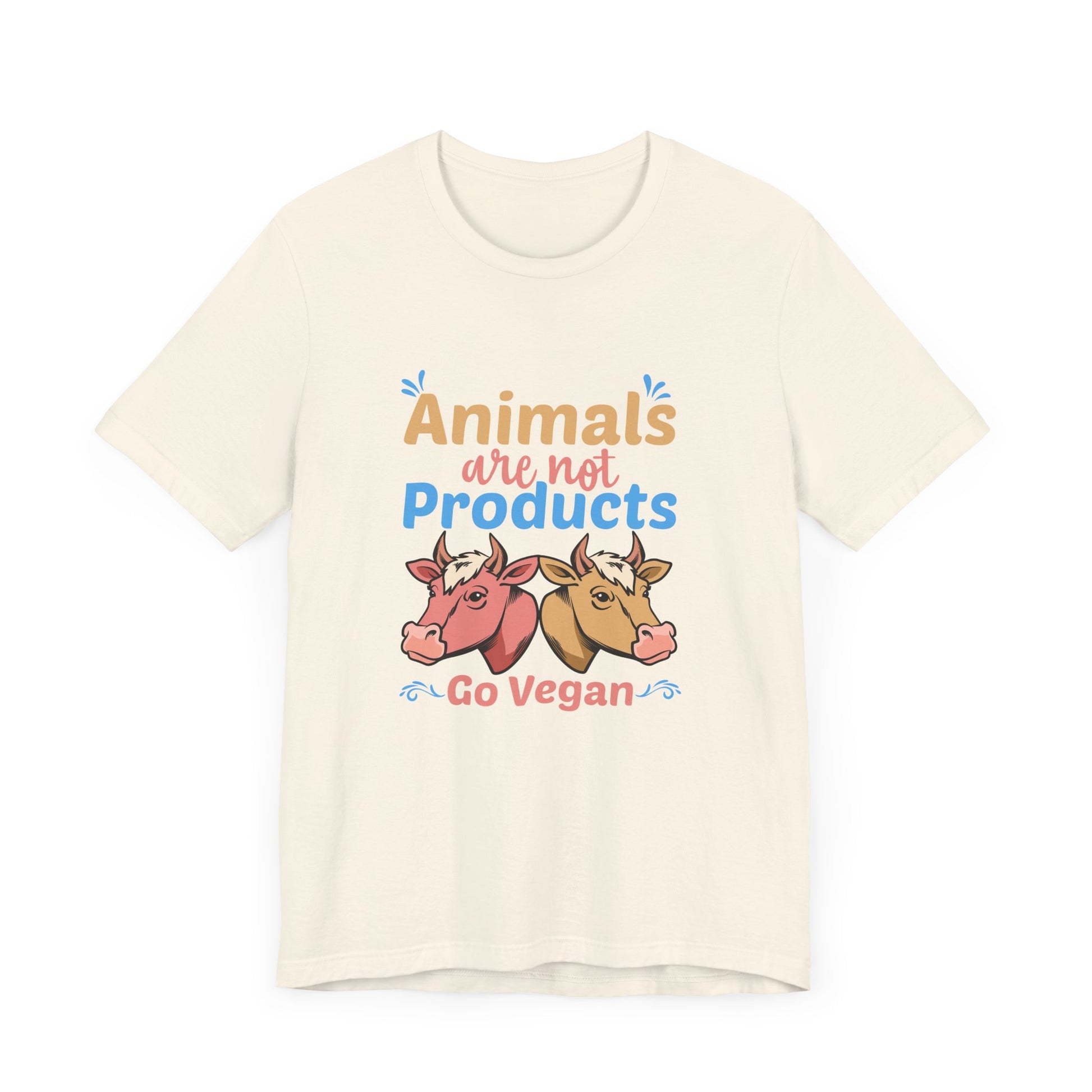 Make a statement for compassion with our "Animals Are Not Products, Go Vegan" Unisex Jersey Short Sleeve Tee. This tee combines a powerful message with superior comfort, crafted from soft, breathable cotton that feels great against your skin. Perfect for everyday wear, it’s an ideal addition to any vegan advocate’s wardrobe.