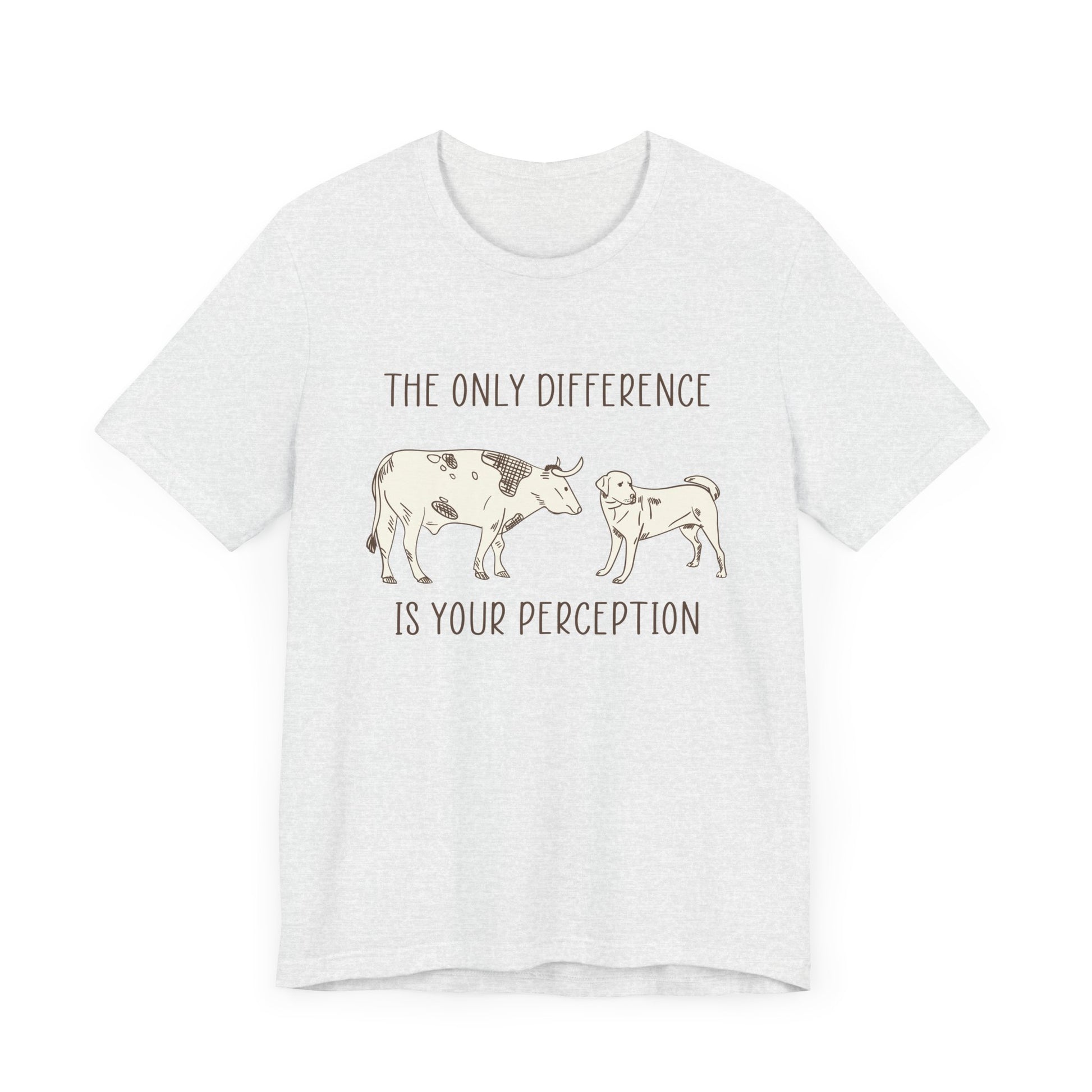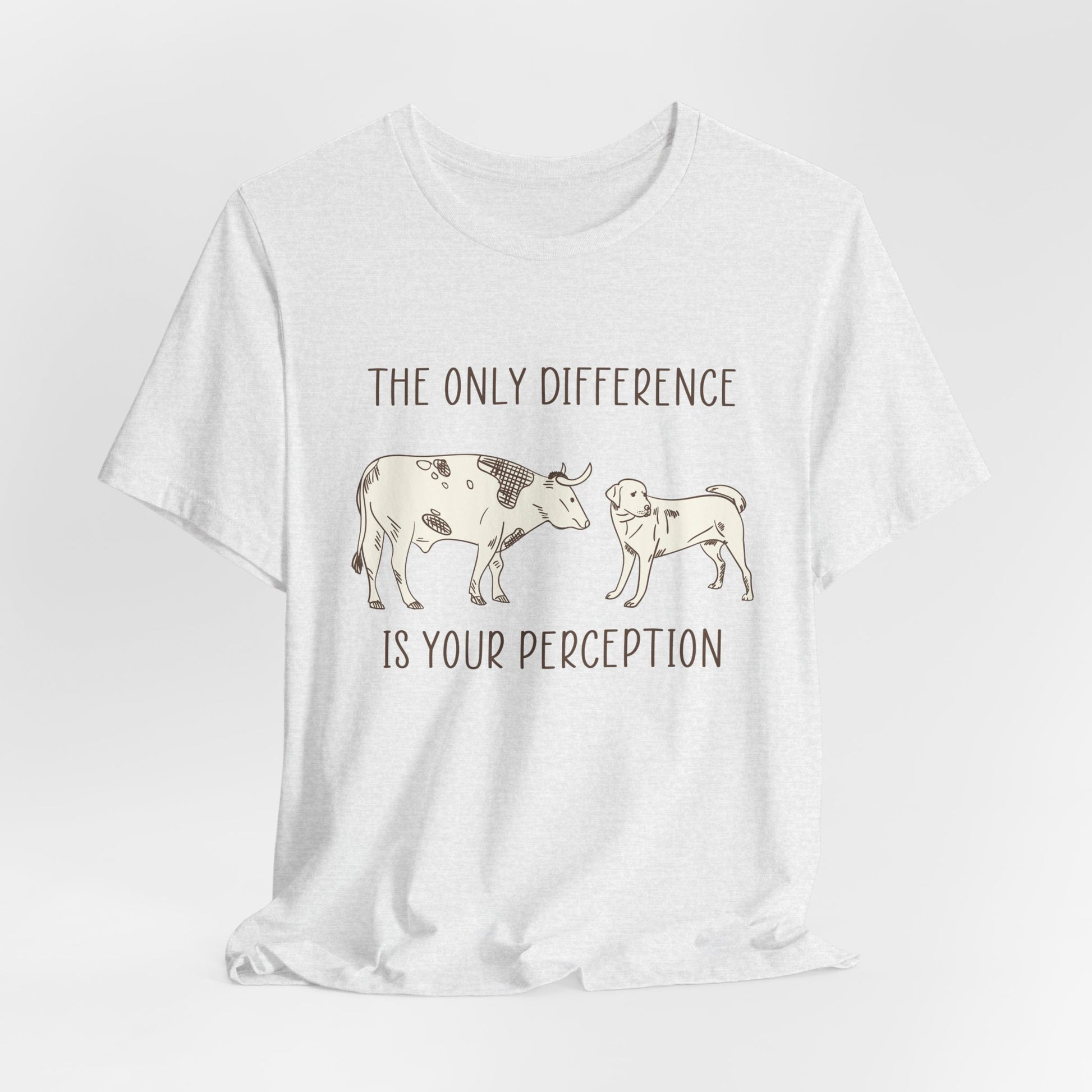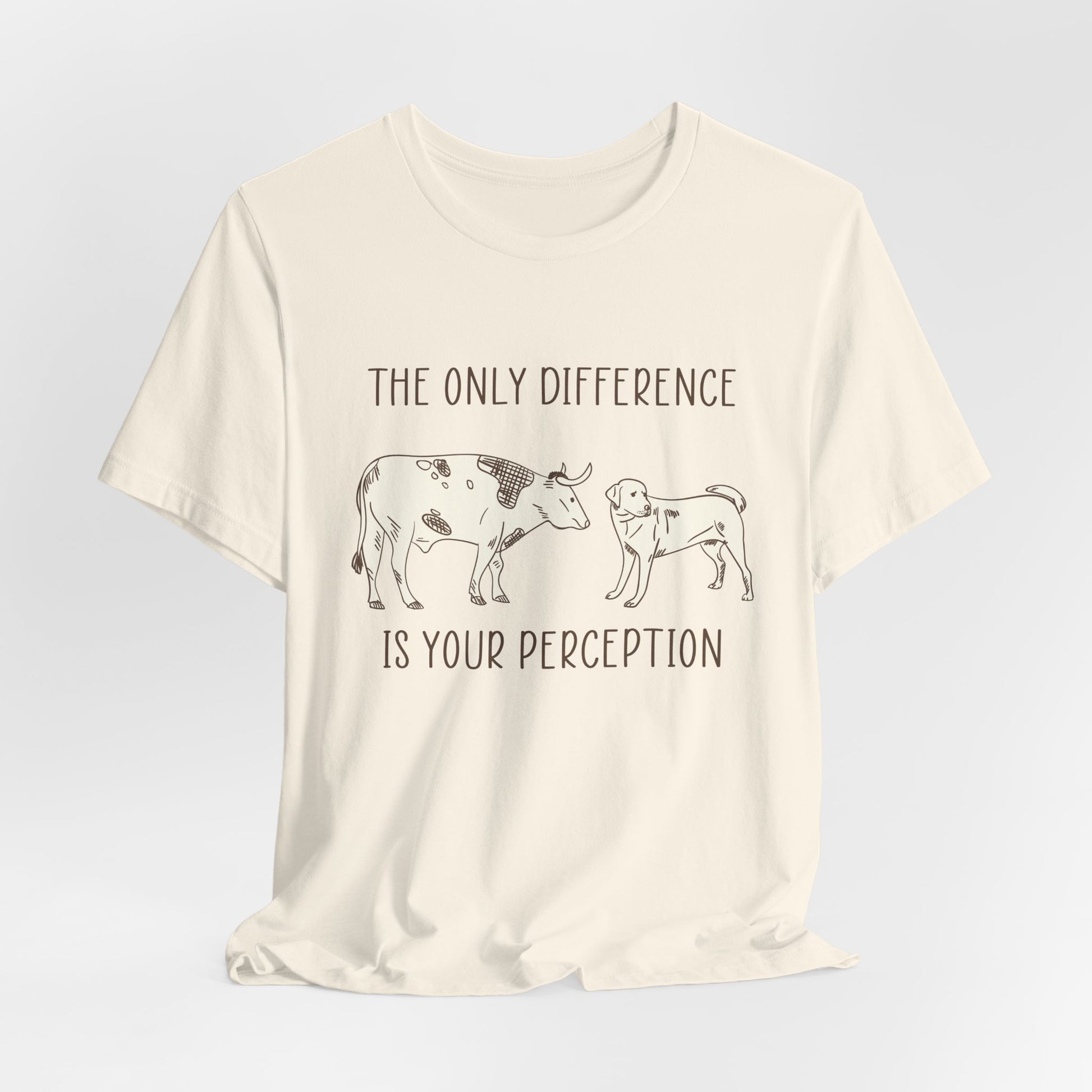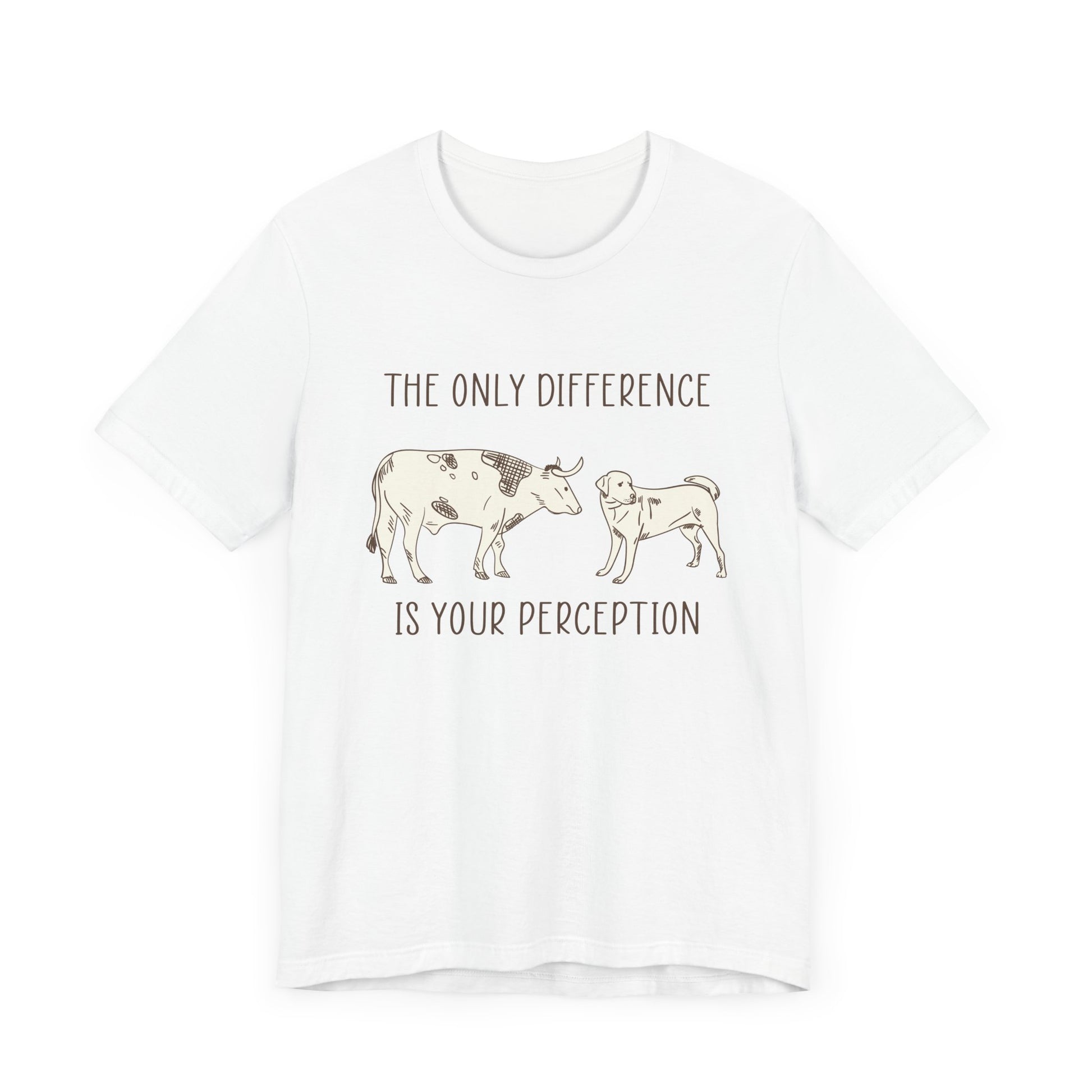 Challenge the status quo with our Vegan: Only Difference Is Your Perception - Unisex Jersey Short Sleeve Tee. Featuring impactful imagery of a cow and a dog, this tee encourages everyone to rethink their perceptions of animals and their roles in our lives.