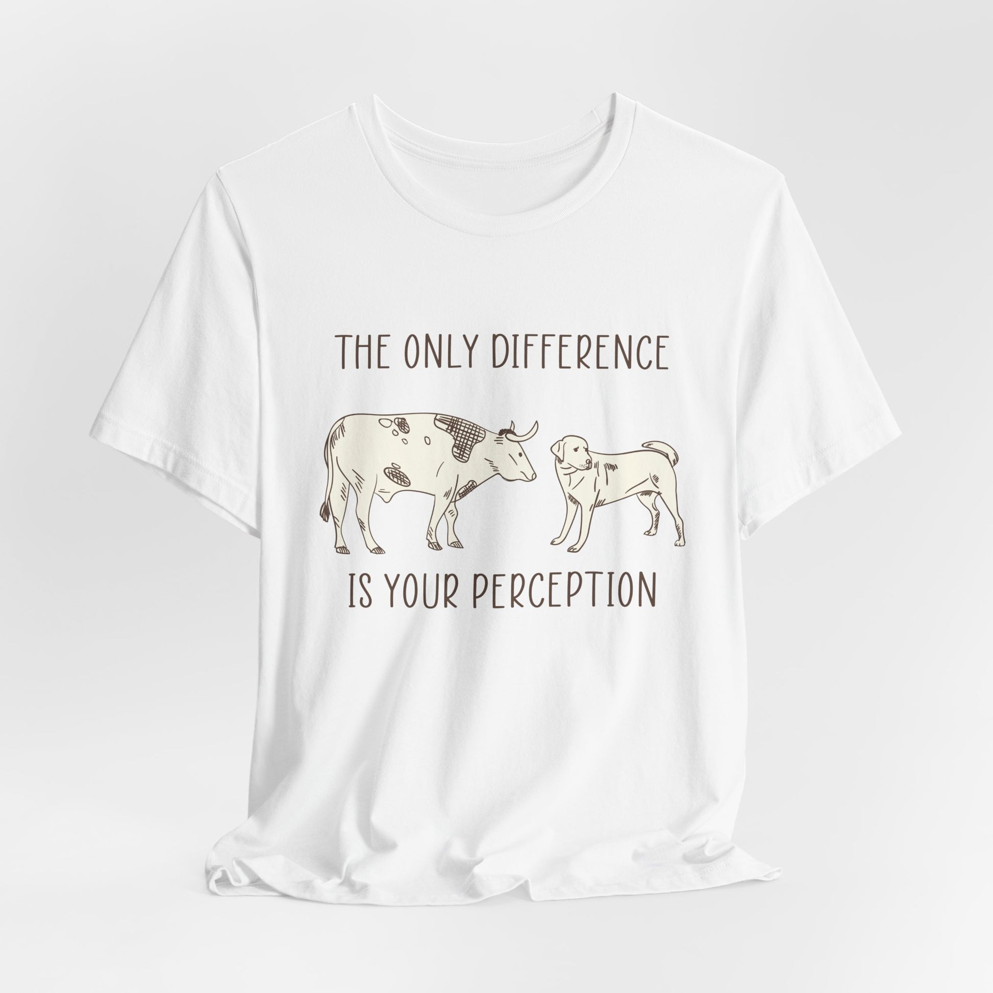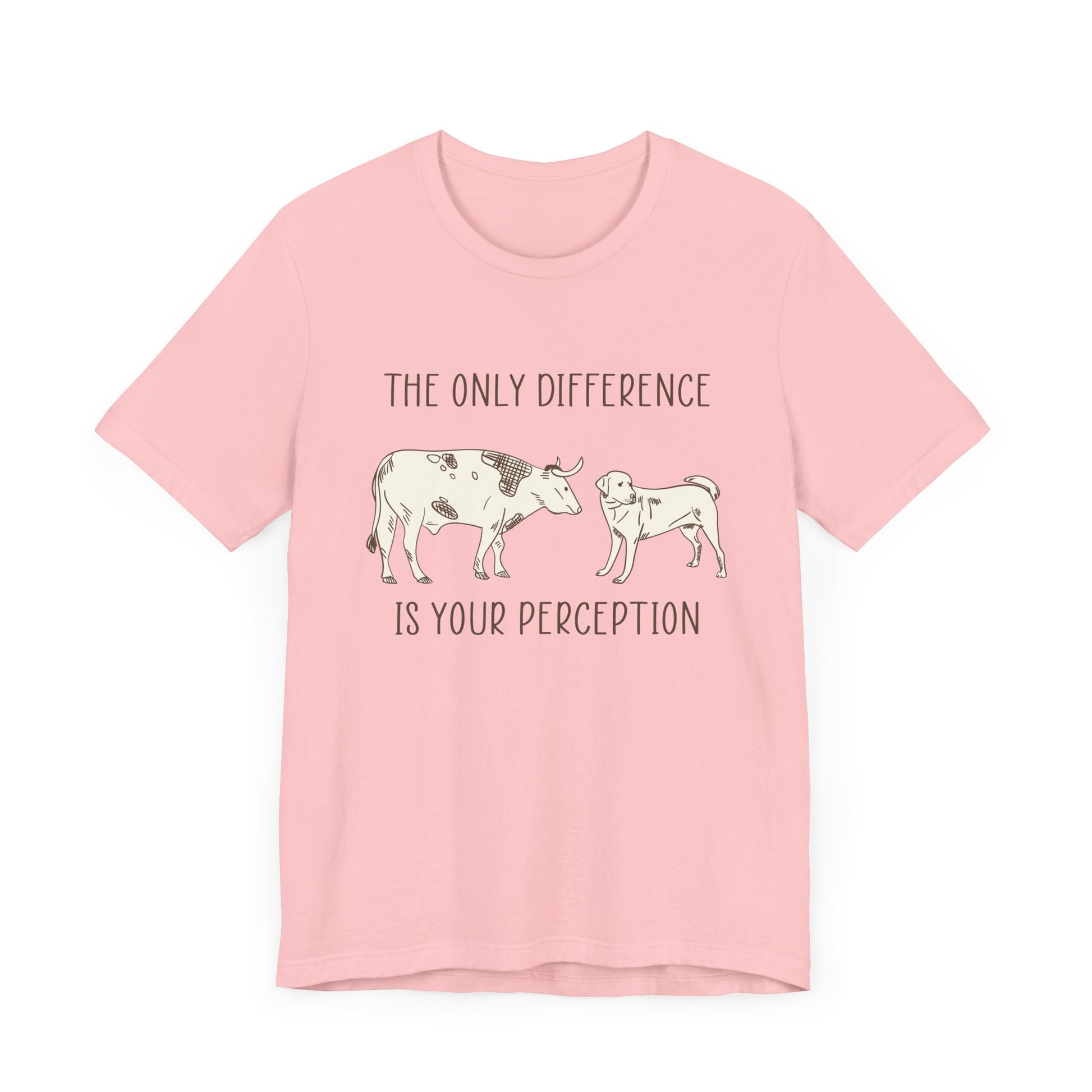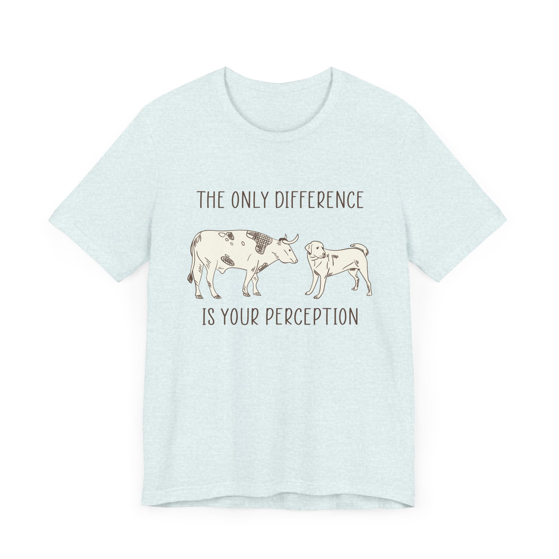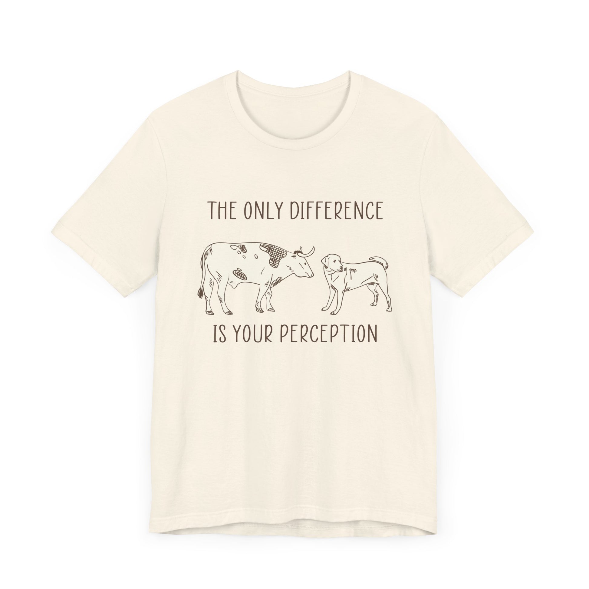 Challenge the status quo with our Vegan: Only Difference Is Your Perception - Unisex Jersey Short Sleeve Tee. Featuring impactful imagery of a cow and a dog, this tee encourages everyone to rethink their perceptions of animals and their roles in our lives.