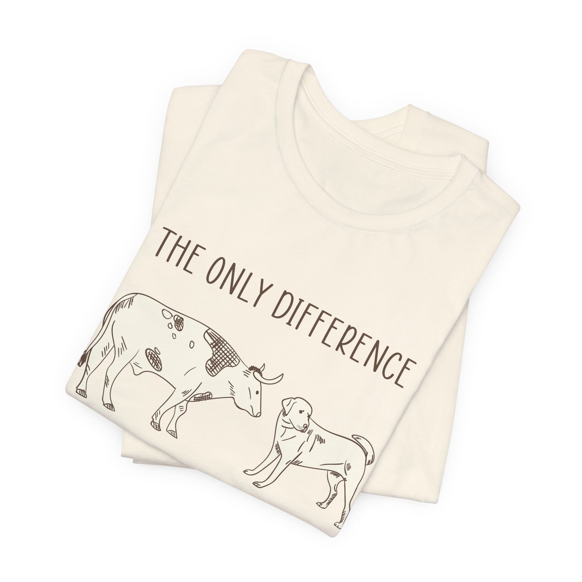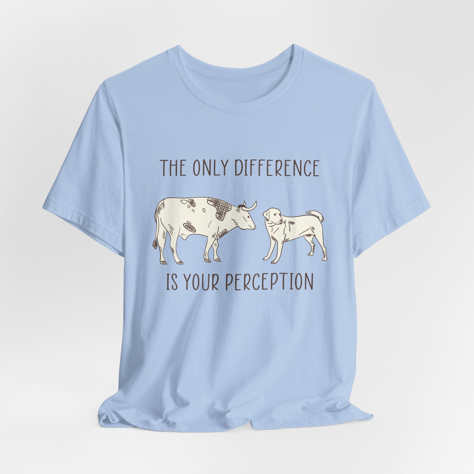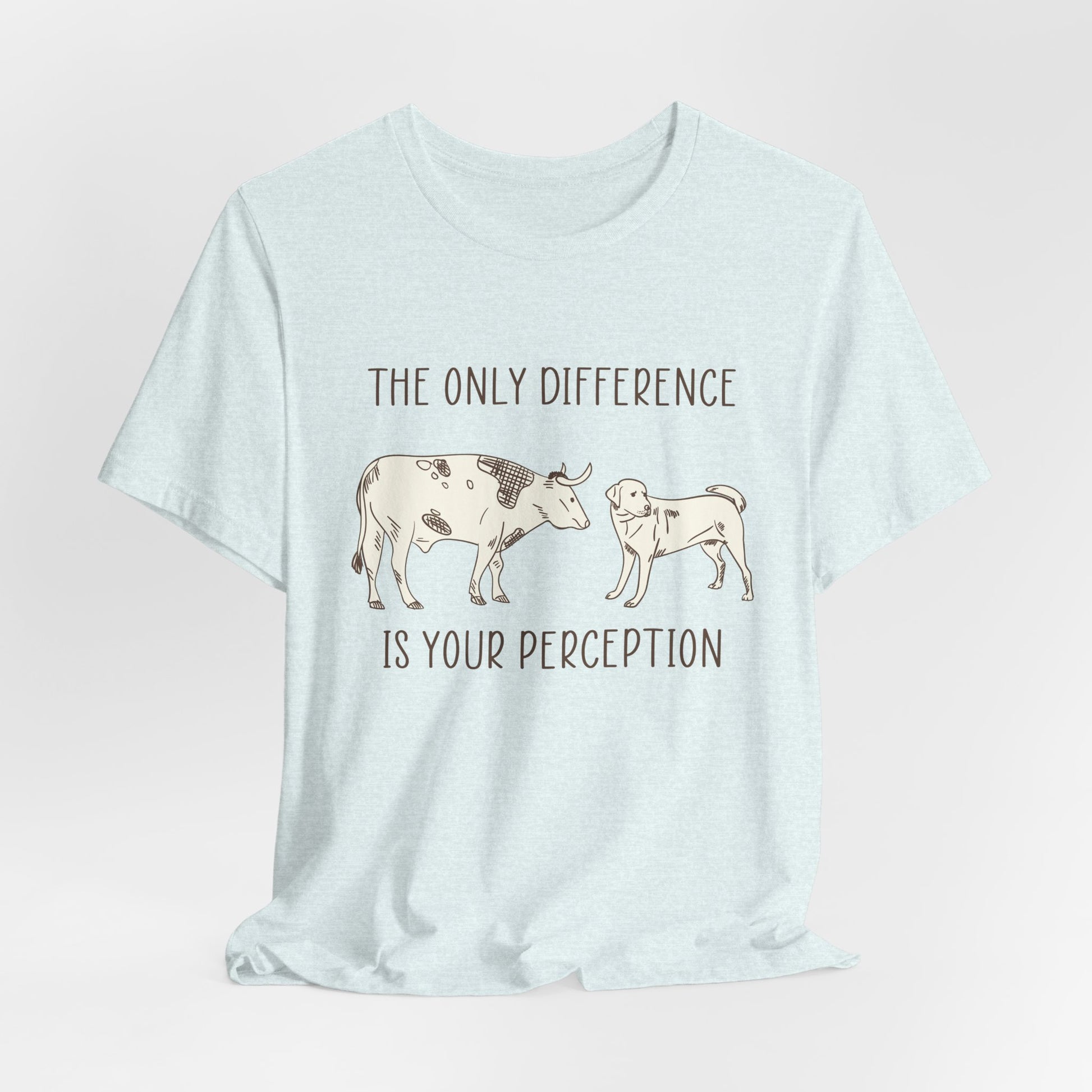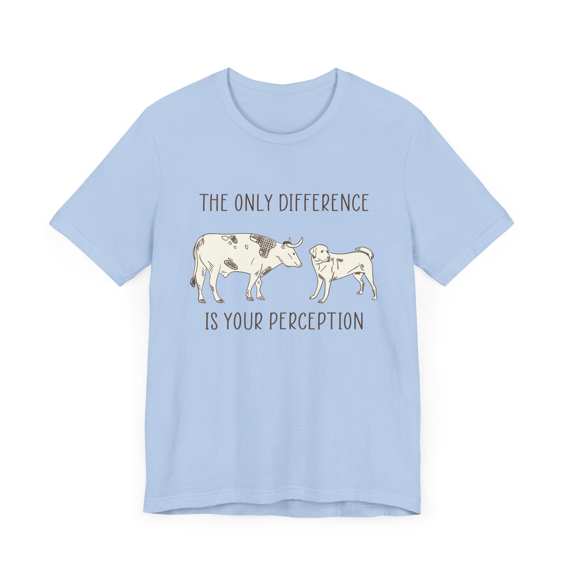 Challenge the status quo with our Vegan: Only Difference Is Your Perception - Unisex Jersey Short Sleeve Tee. Featuring impactful imagery of a cow and a dog, this tee encourages everyone to rethink their perceptions of animals and their roles in our lives.