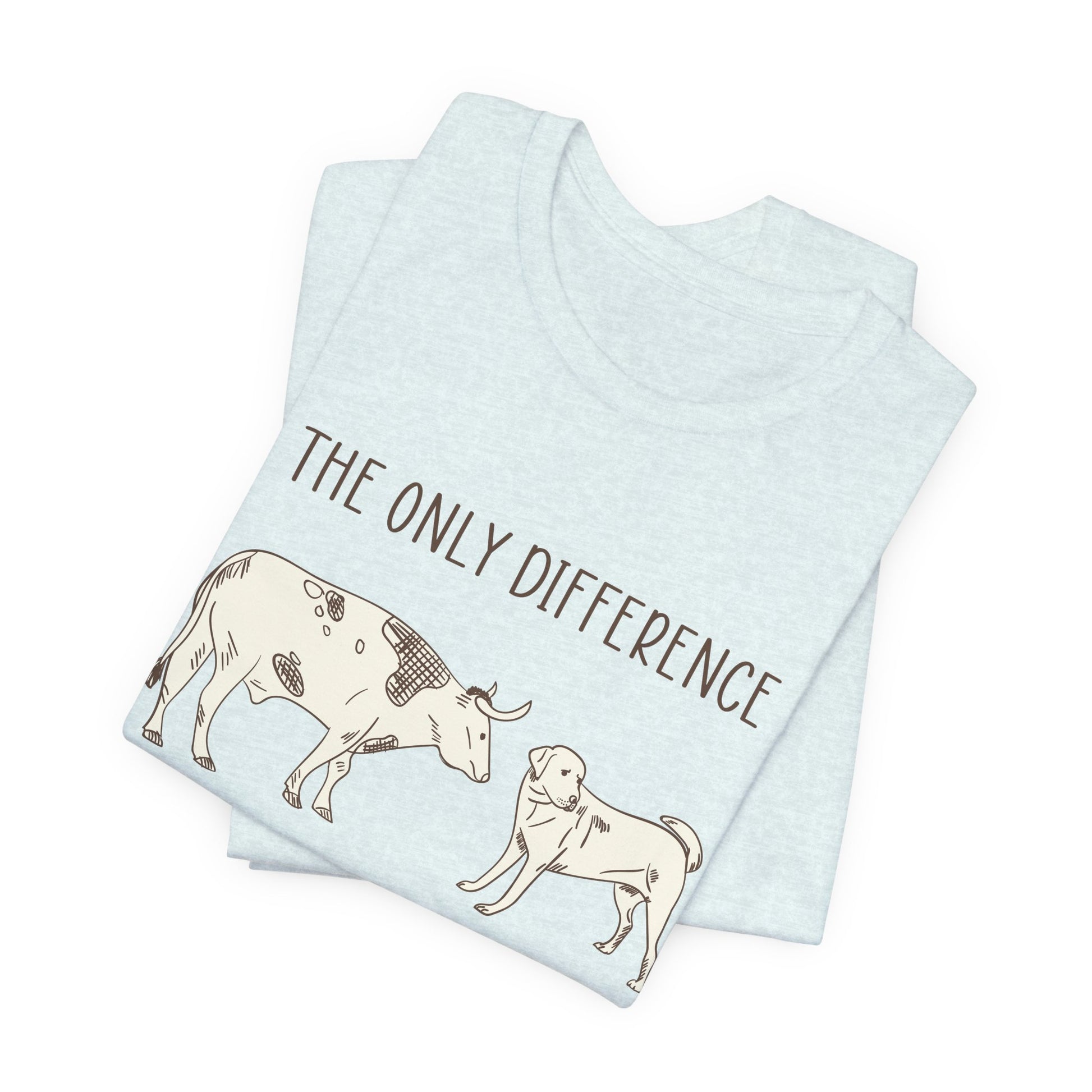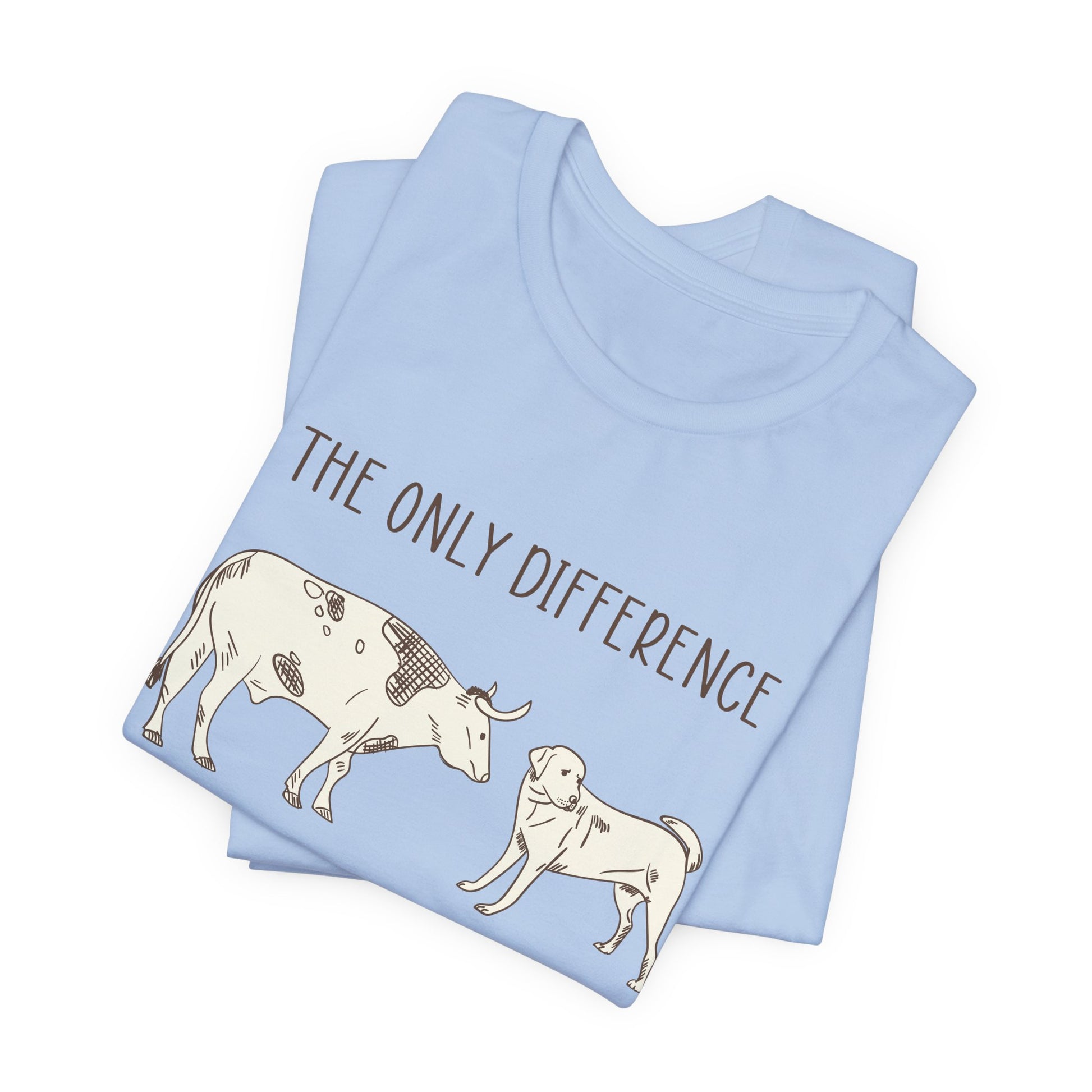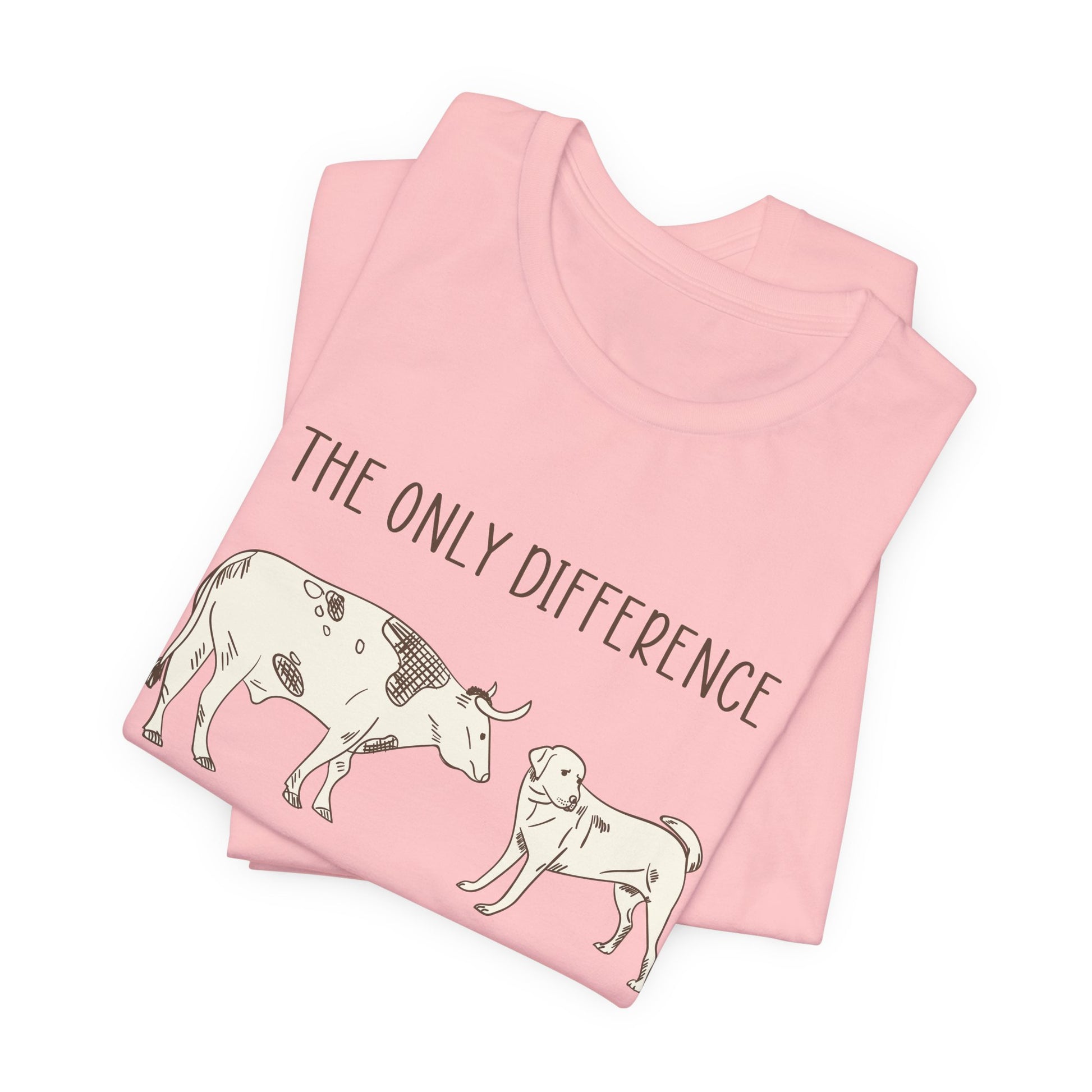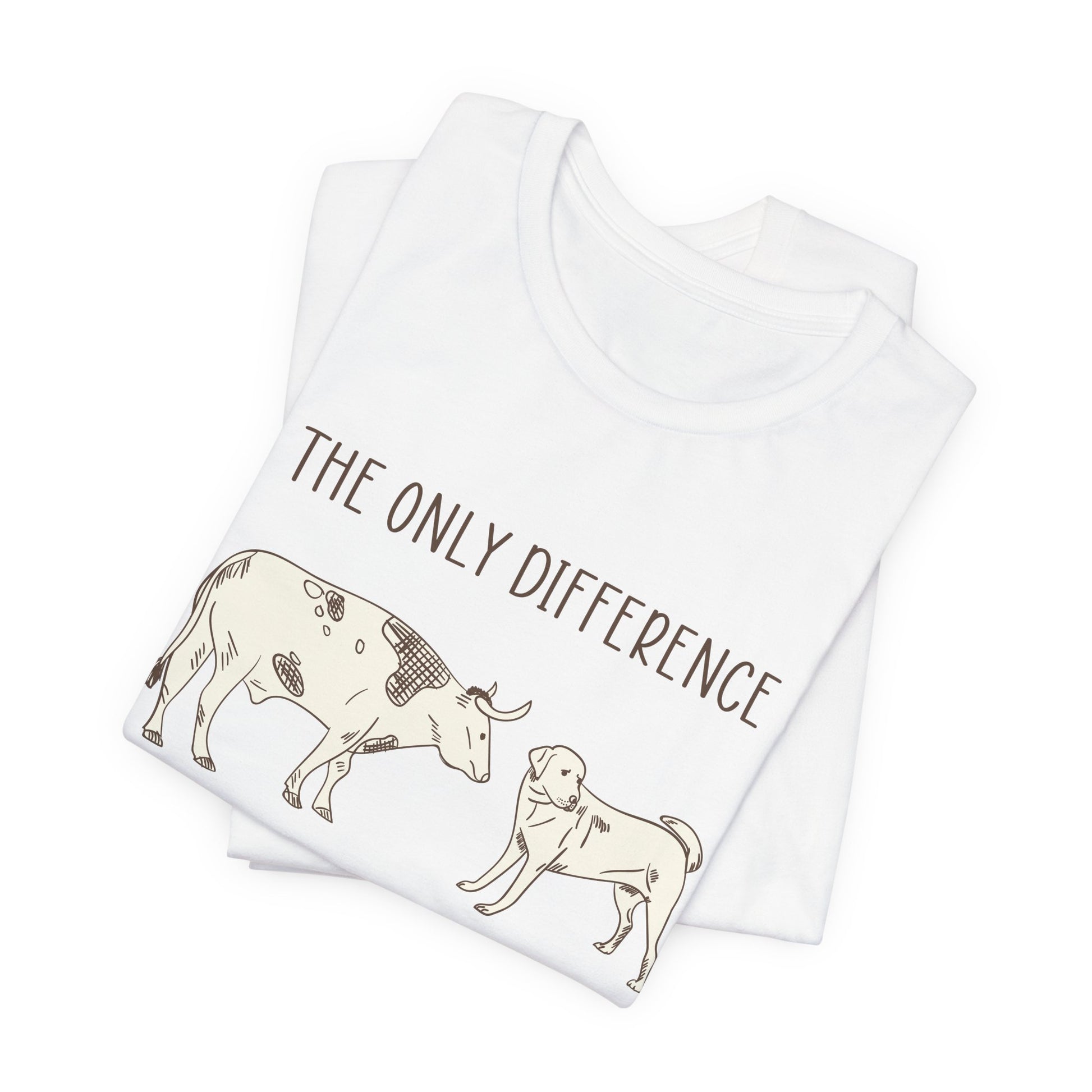 Challenge the status quo with our Vegan: Only Difference Is Your Perception - Unisex Jersey Short Sleeve Tee. Featuring impactful imagery of a cow and a dog, this tee encourages everyone to rethink their perceptions of animals and their roles in our lives.