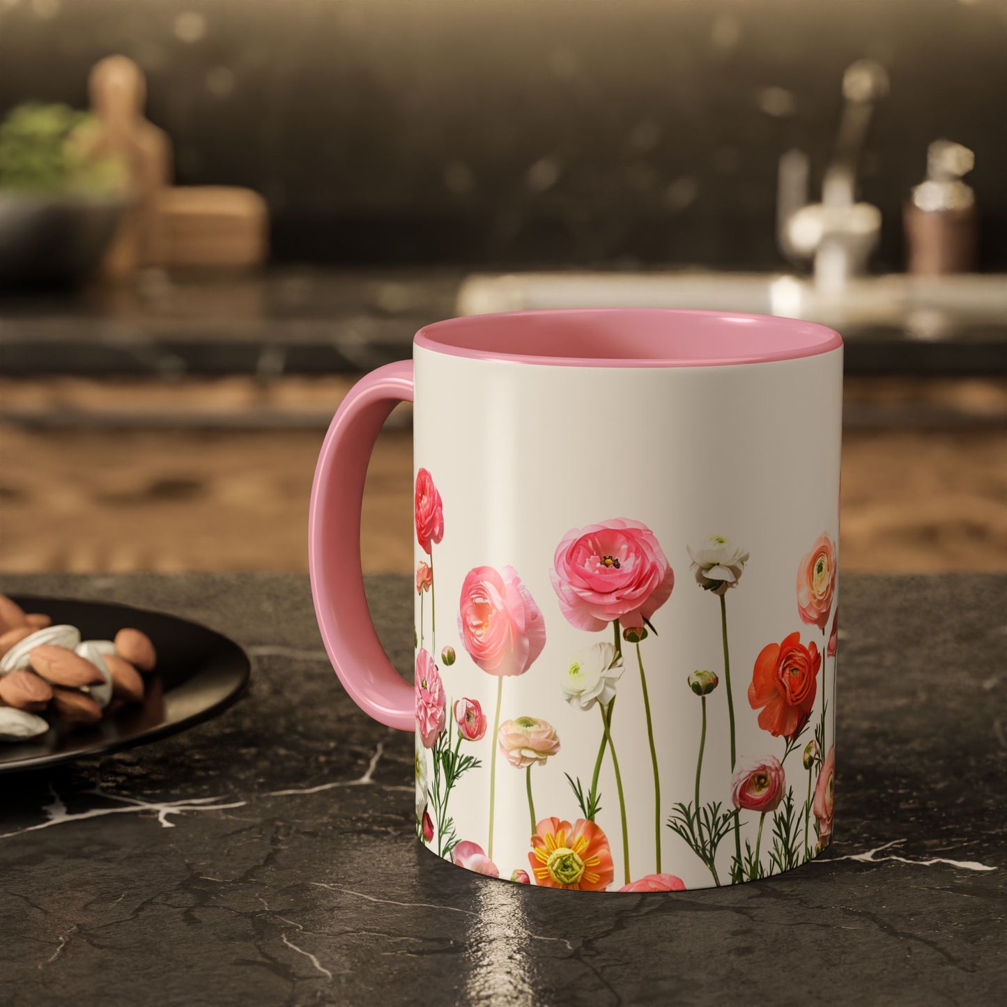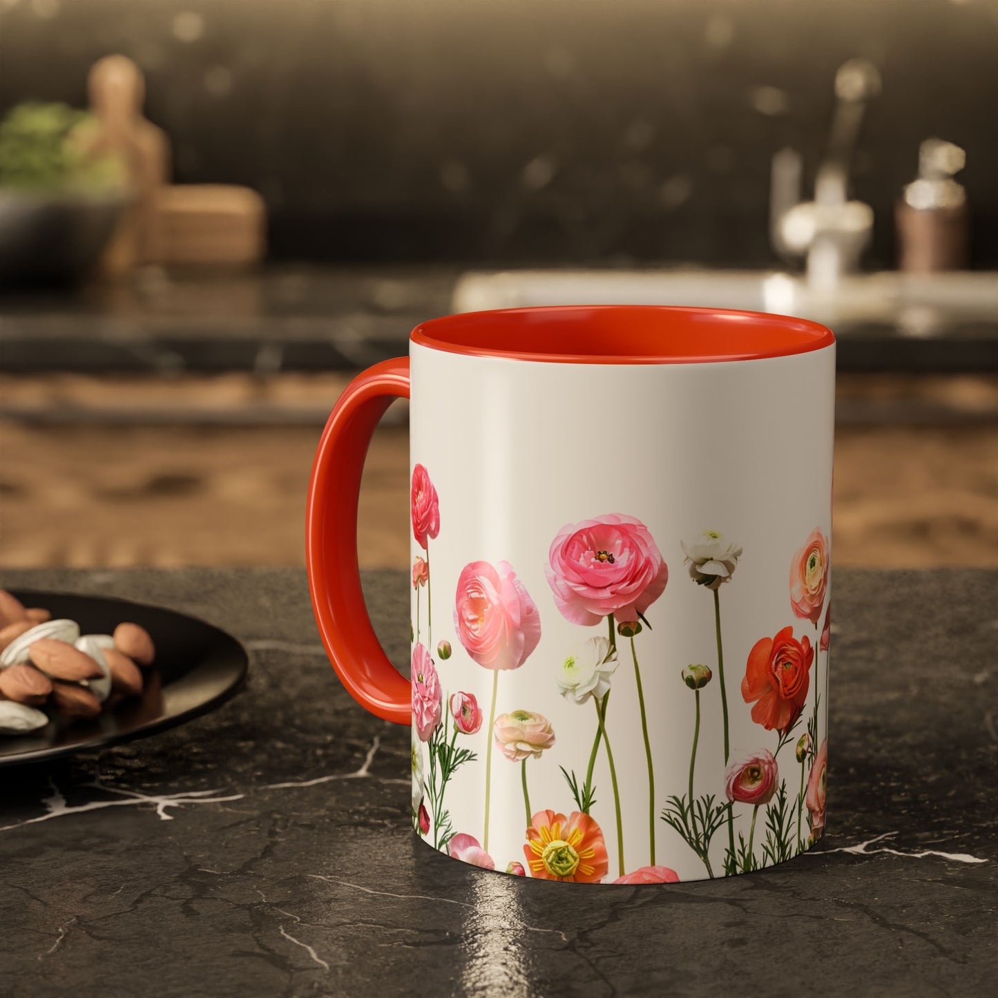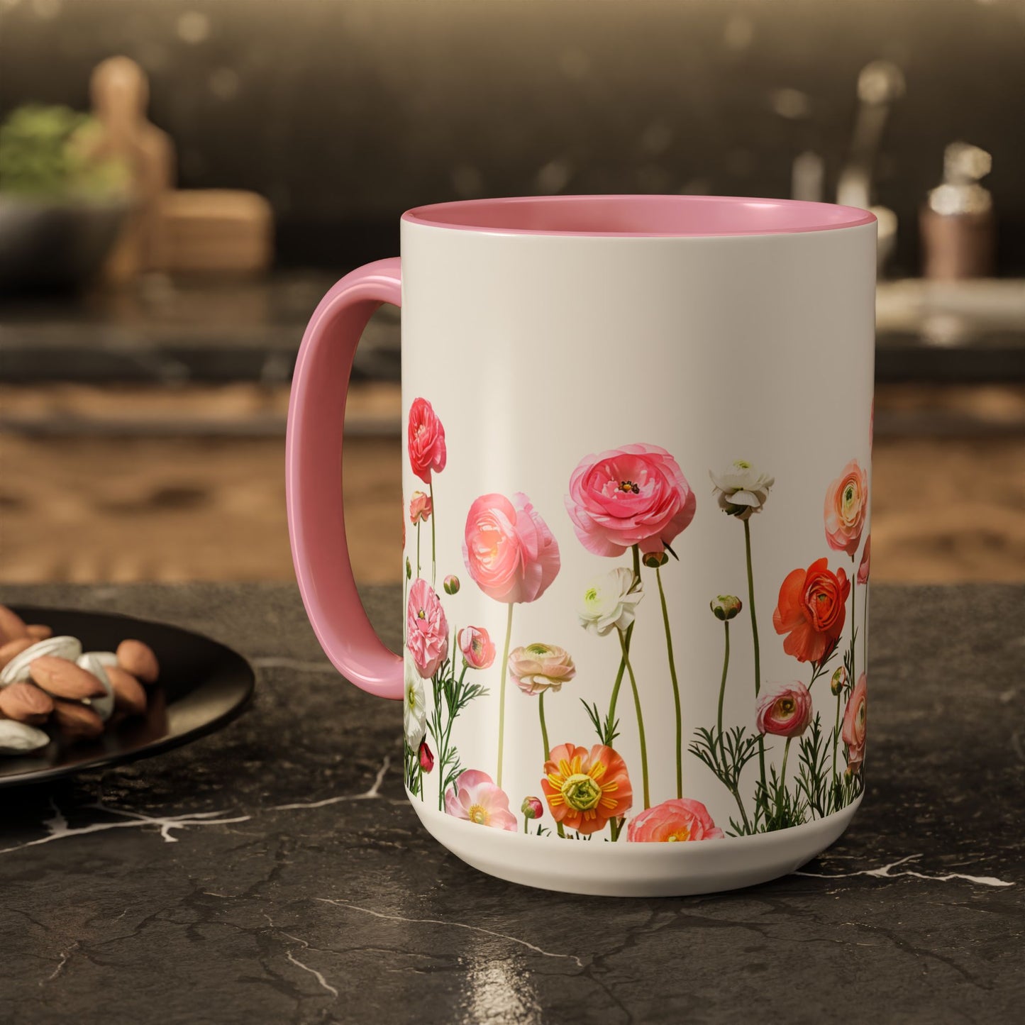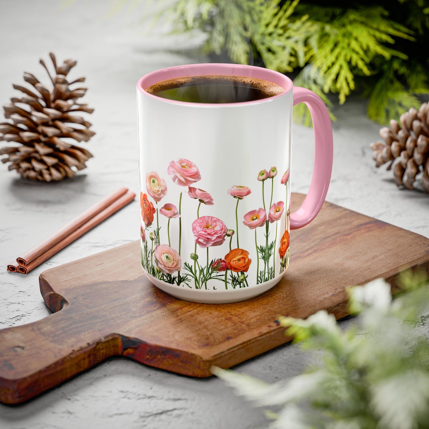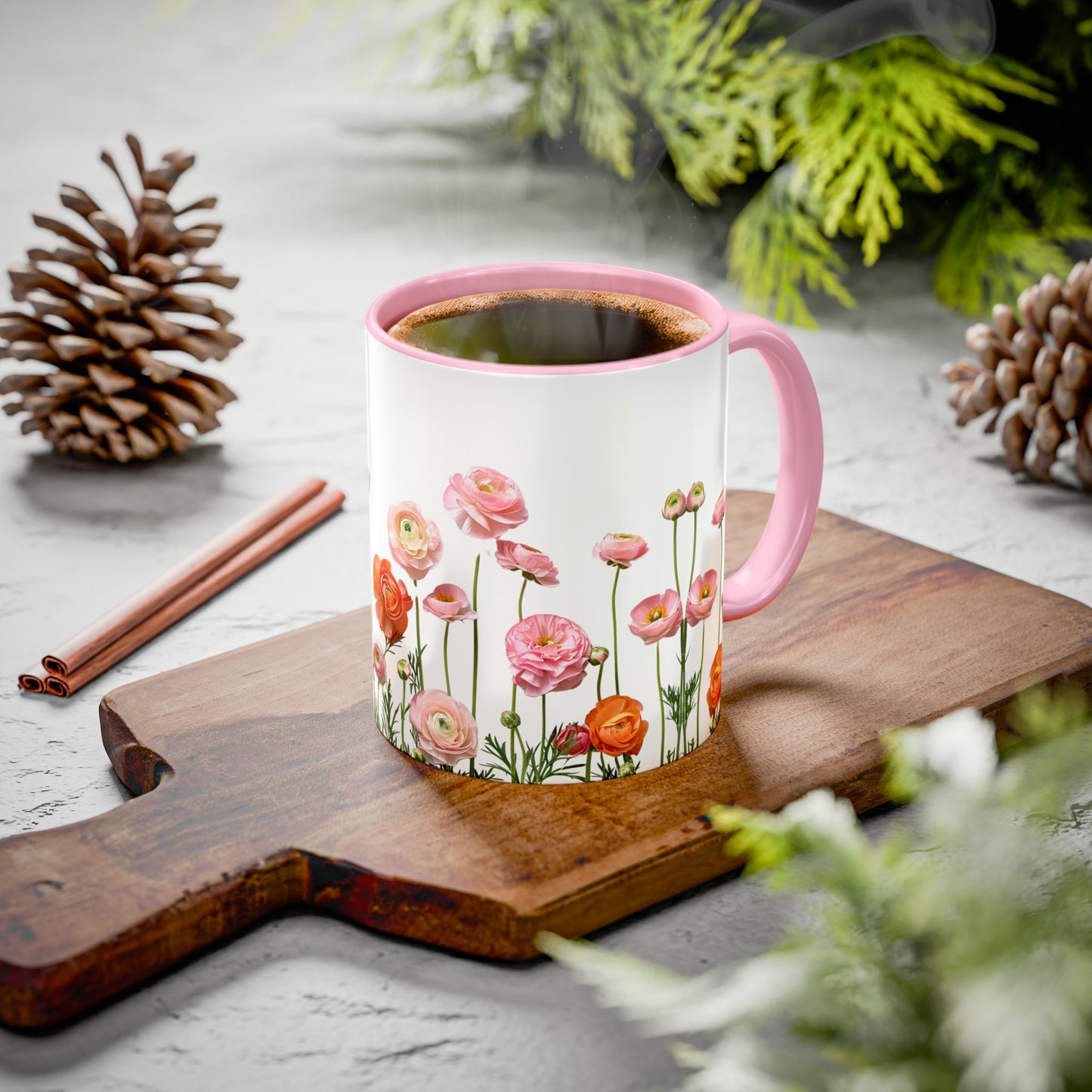 - Dynamic Floral Design: Adorned with vibrant pink and orange petals, this mug adds a lively and cheerful touch to your drinkware collection.