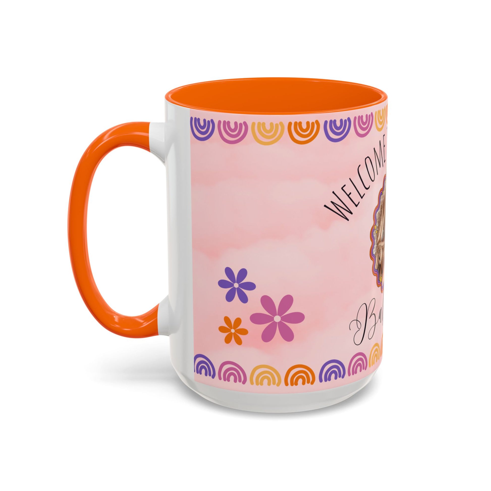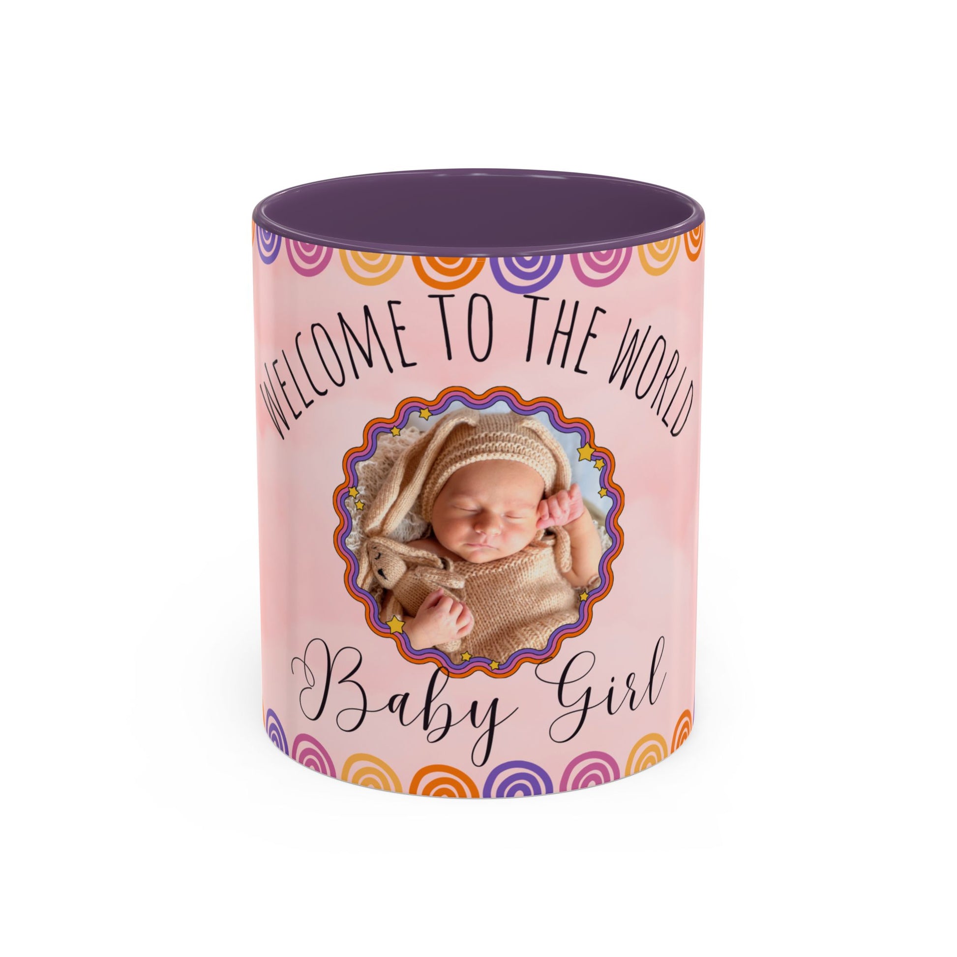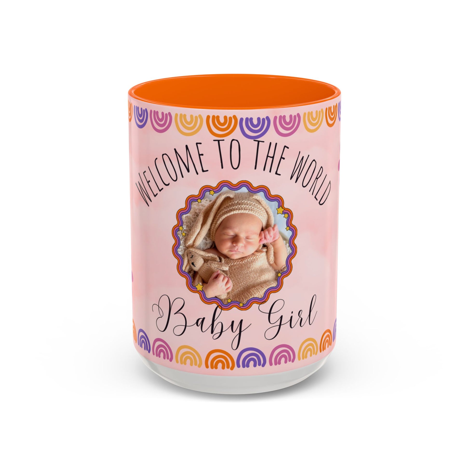 Celebrate the arrival of a beautiful baby girl with a personalized touch! Our "Welcome to the World, Baby Girl" photo-customizable accent coffee mug allows you to add a cherished photo of the little one to make this gift truly unique. The soft pastel design, paired with your favorite photo, makes this the perfect keepsake for new parents or a thoughtful gift for a baby shower.