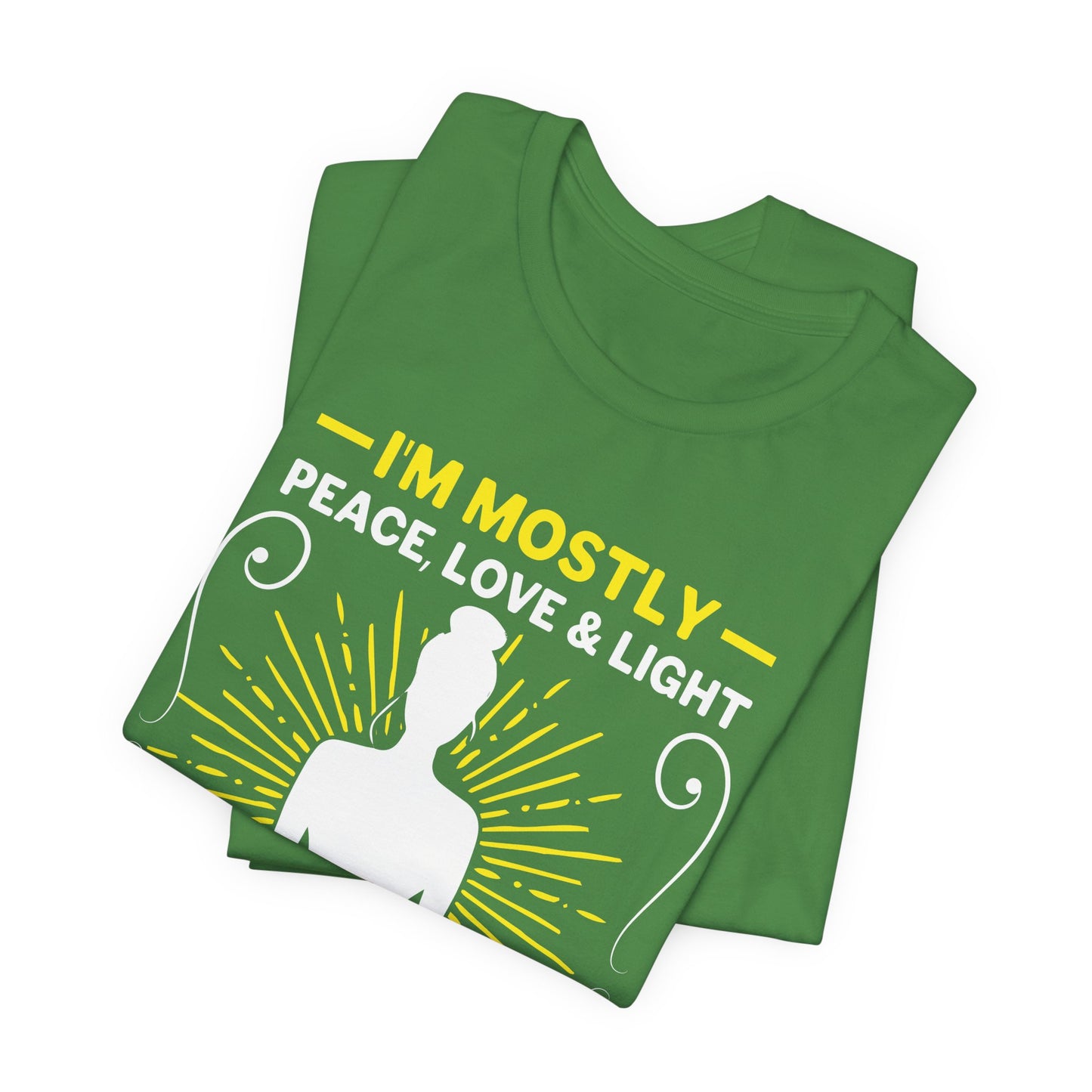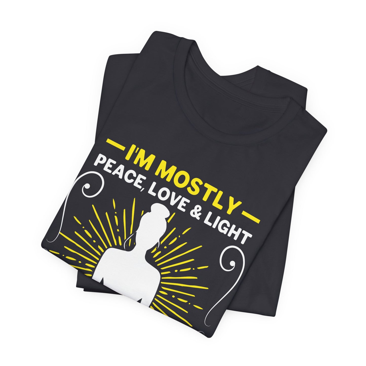 - Inspirational Message: Featuring the uplifting phrase “I'm Mostly Peace, Love, & Light,” this tee is a stylish reminder of the positive energy you bring to the world.