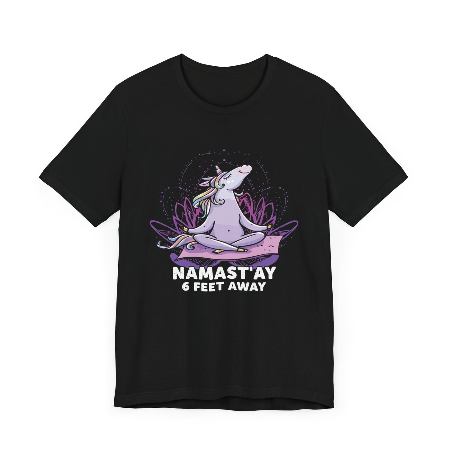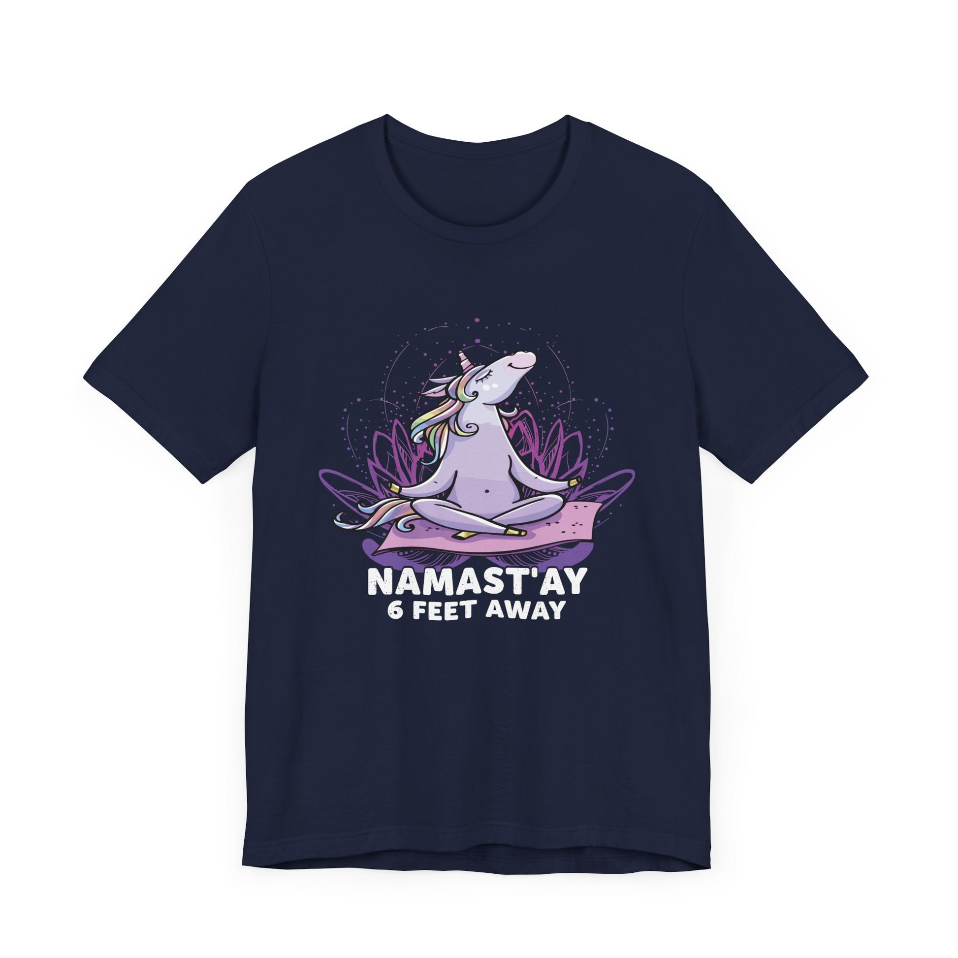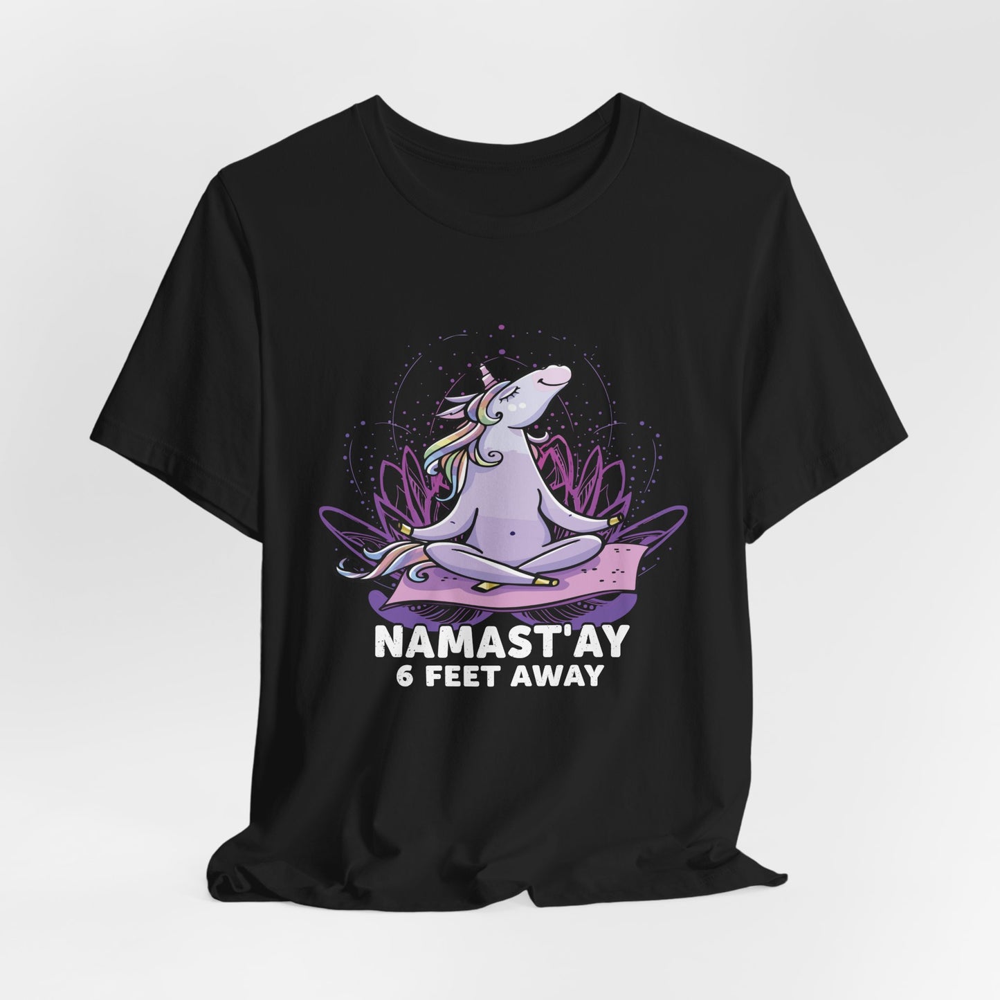 Stay centered and respectful of personal space with our "Namastay, 6 Feet Away" Unisex Jersey Short Sleeve Tee. This tee is perfect for those who cherish their practice and need a little extra room to breathe. Crafted from soft, breathable cotton, it’s designed for maximum comfort during your yoga sessions or everyday activities.