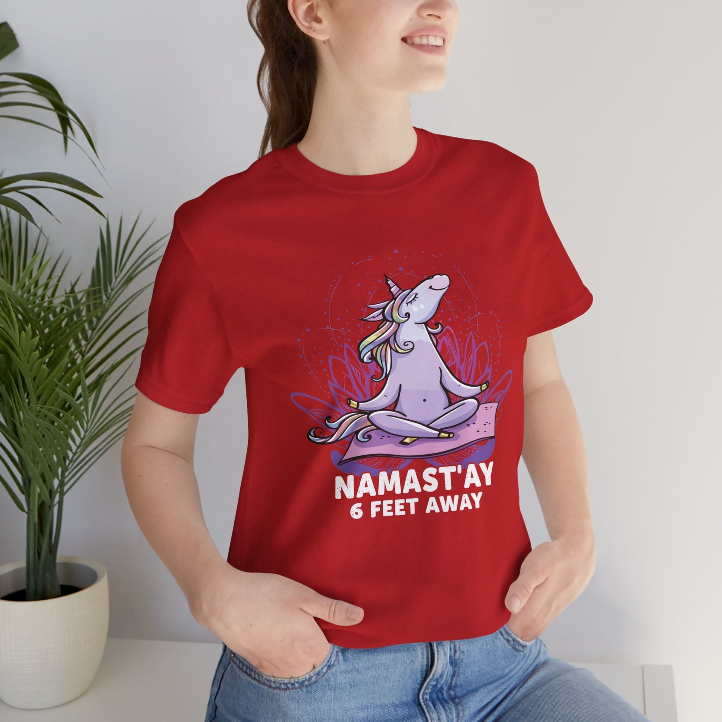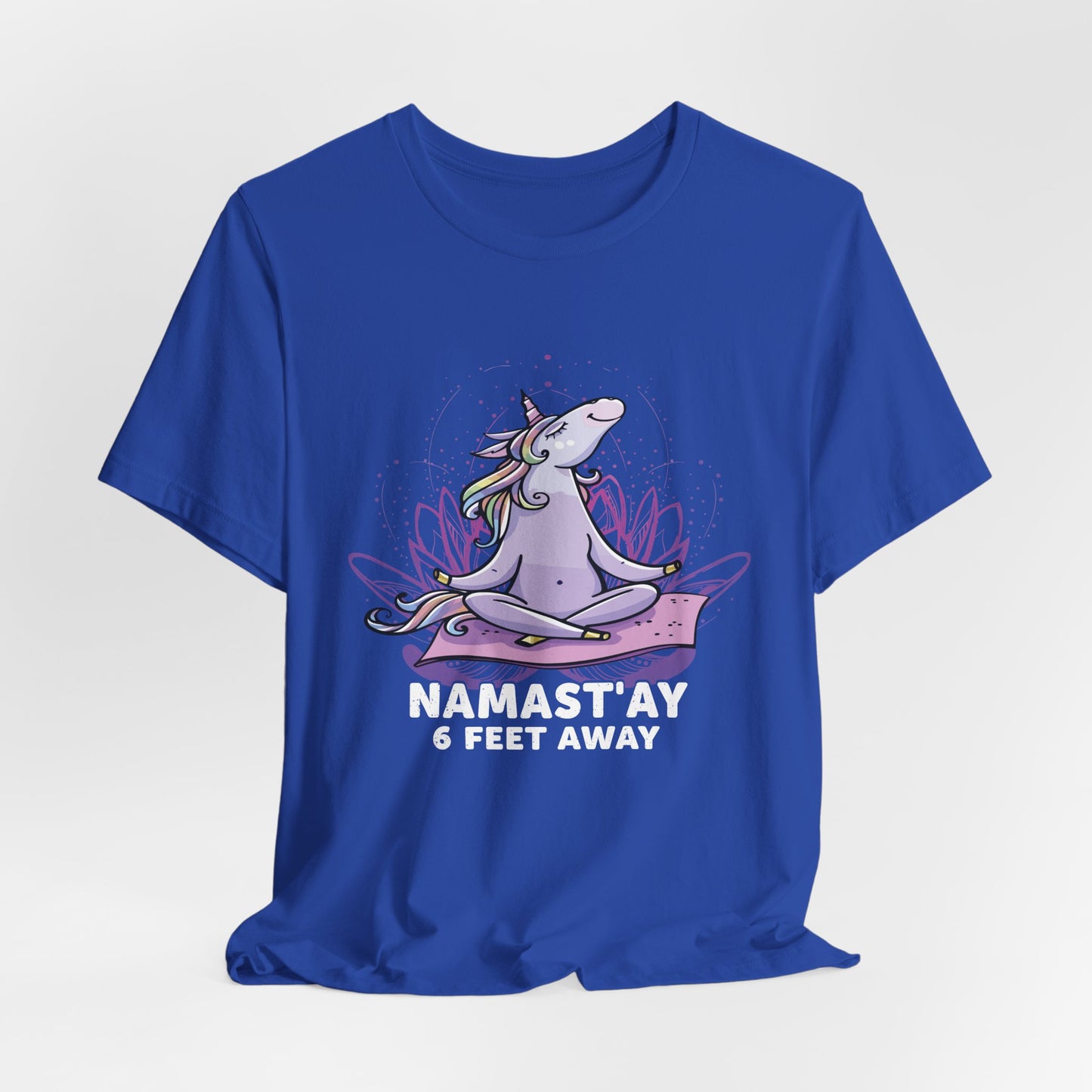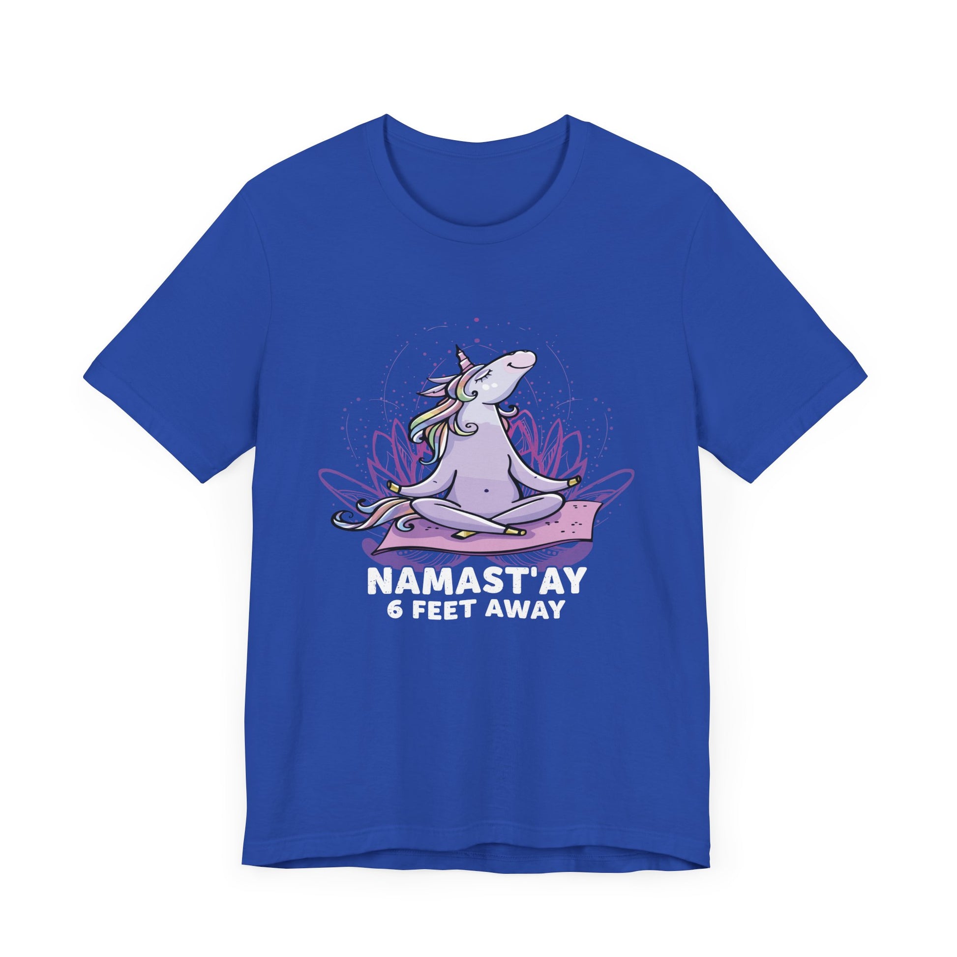 Stay centered and respectful of personal space with our "Namastay, 6 Feet Away" Unisex Jersey Short Sleeve Tee. This tee is perfect for those who cherish their practice and need a little extra room to breathe. Crafted from soft, breathable cotton, it’s designed for maximum comfort during your yoga sessions or everyday activities.